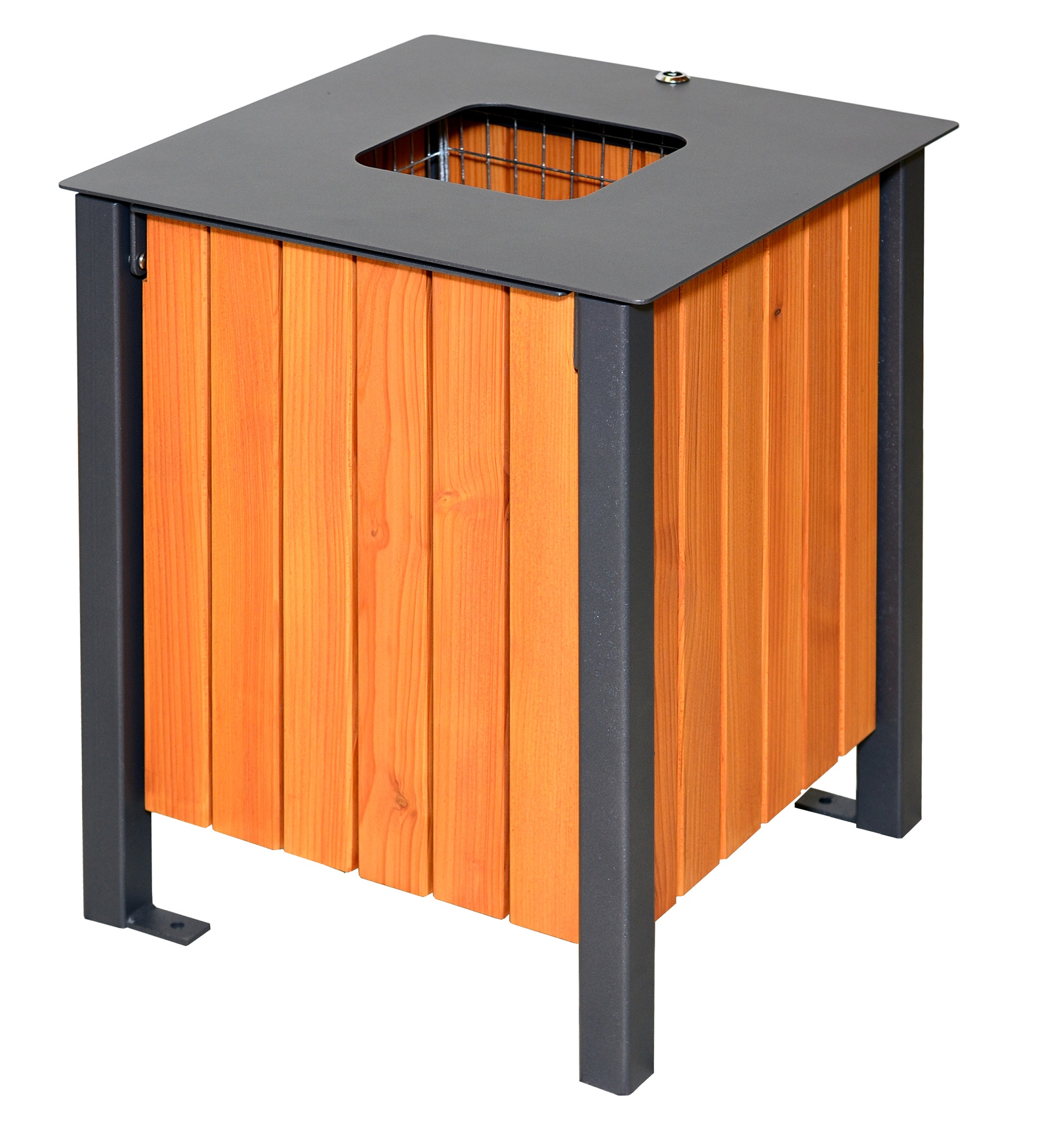 Stahlgestell feuerverzinkt, gegen Aufpreis auch pulverbeschichtet (DB 703). Standbeine aus Quadratrohr 40 x 40 x 2 mm.Rahmen aus Winkelstahl 40 x 40 x 3 mm.Schalung aus 28 mm starken Bretternaus heimischem unbehandeltem Douglasienholz(optional auch 2fach geölt). Abmessung (B/T/H): 47 x 47 x 60 cm Lieferung erfolgt jeweils komplett montiert. Befestigung: Mit angeschweißten Bodenlaschen zum Aufdübeln. Optional gegen Aufpreis - Einsätze aus feuerverzinktem Draht oder aus Stahlblech.