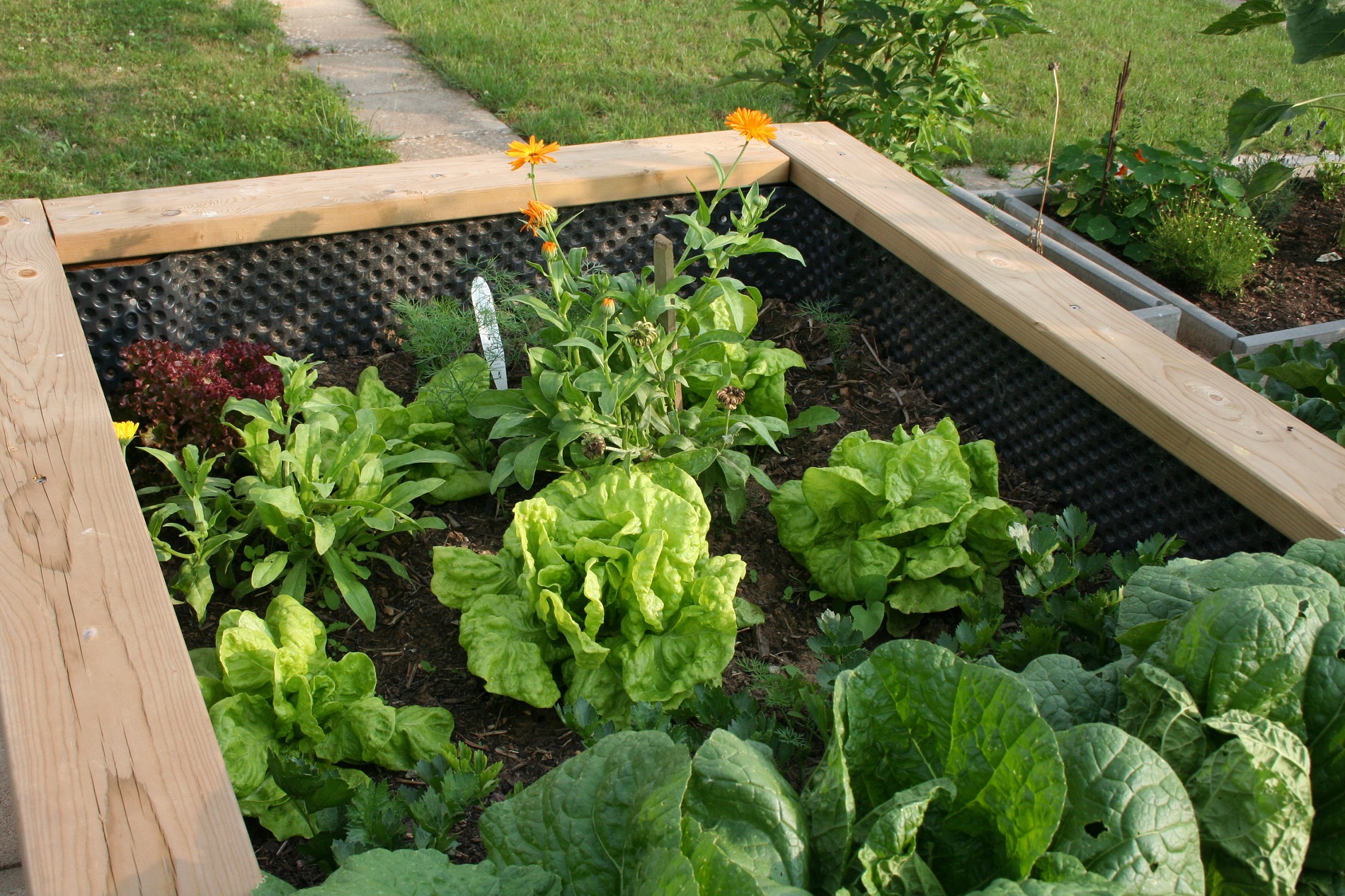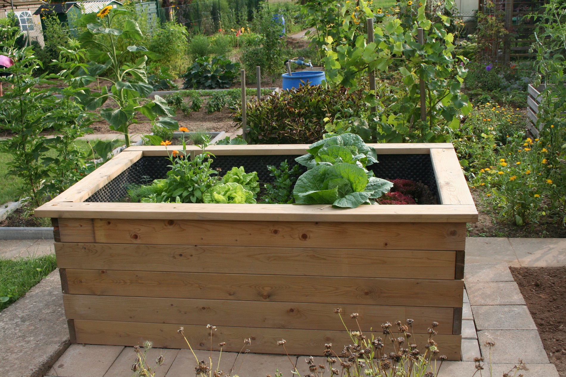 Kindergarten-Hochbeet aus Douglasienholz, 80 x 50 x 50 cm (L/B/H). Einsatz aus Kunststoff mit Bohrungen am Boden gegen Staunässe, verschraubte Kunststoffgleiter an den Füßen. Lieferung komplett vormontiert.