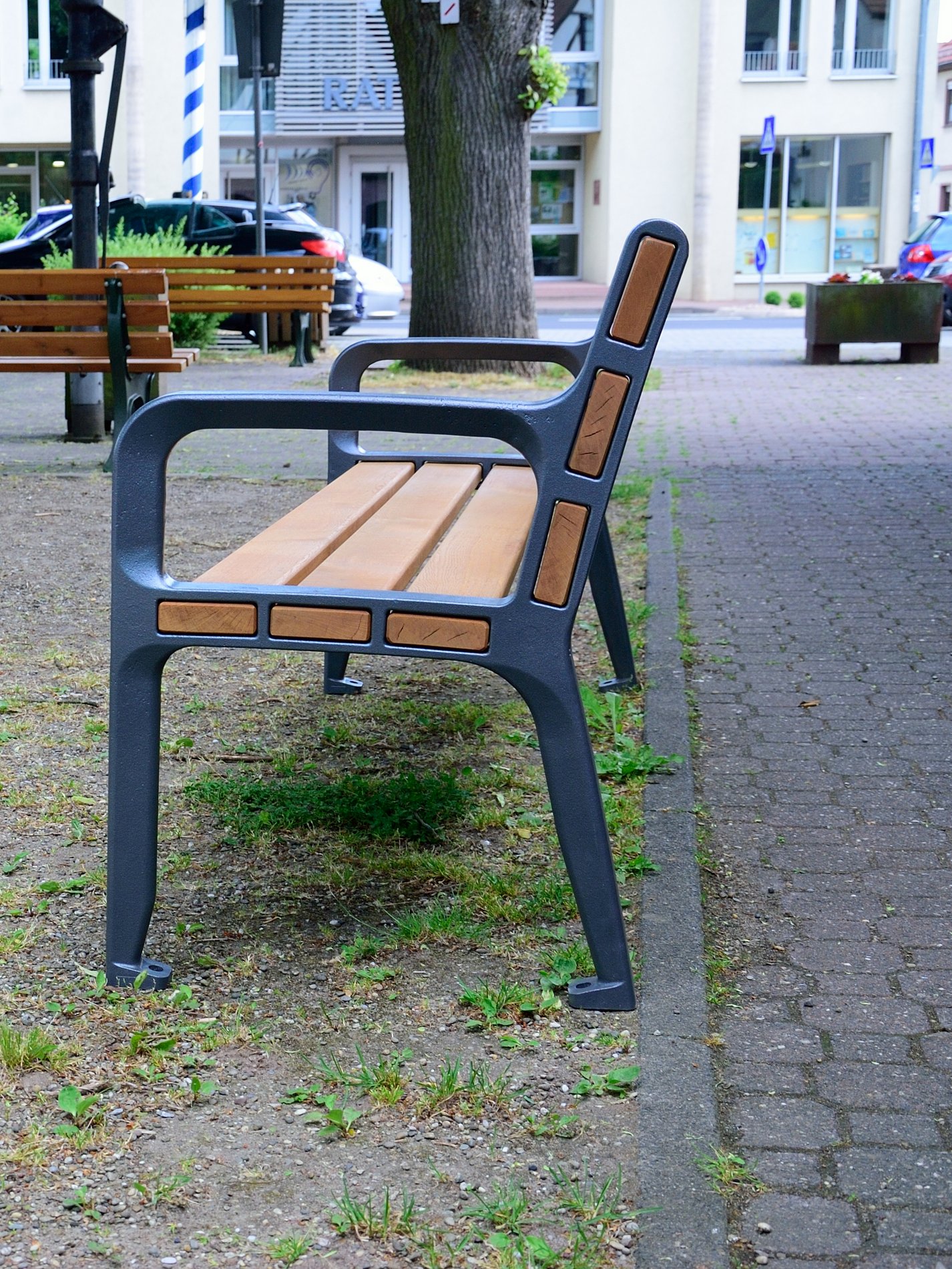 Sessel "Lohr" Bankauflagen Eiche, geölt Untergestell Gusseisen mit Pulverbeschichtung (DB 703) Höhe 44 cm, Breite 70 cm, Tiefe 59 cm Sitzhöhe 44 cm Gewicht 71,5 kg