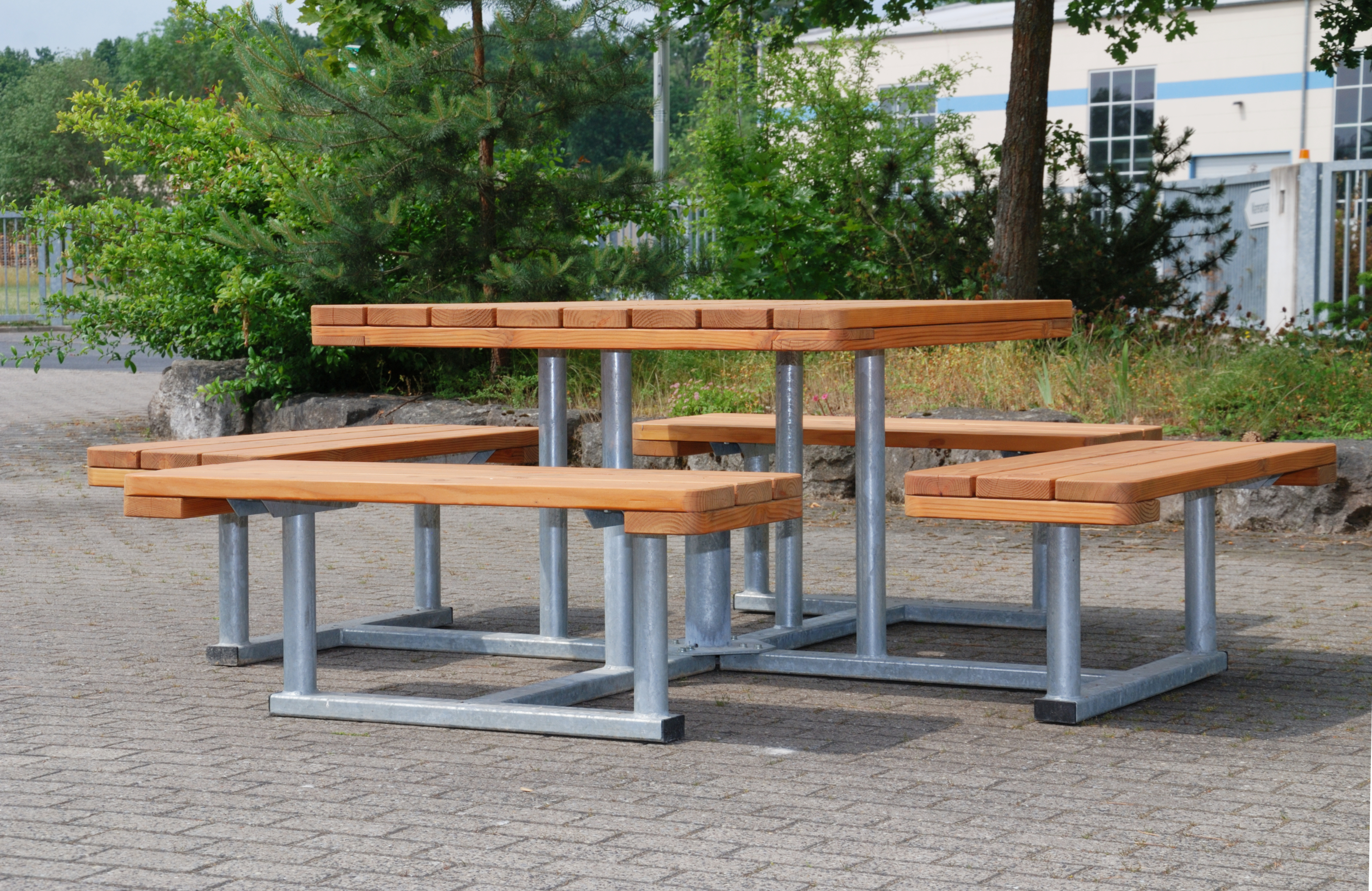 Sitzgruppe mit 3 Bänken und einem Tisch, anfahrbar mit einem Rollstuhl. Bänke und Tisch sind als feste Kombination auf einem feuerverzinkten Stahluntergestell montiert. Im Untergestell sind Bohrungen angebracht, die ein ortsfestes Verdübeln erlauben. Die Sitzgruppe "Saale" ist für hochbeanspruchte Einsatzorte konzipiert, im kommunalen und gastronomischen Bereich ebenso, wie für betreute Bereiche in Krankenhäusern, Heimen, Schwimmbädern, Badeseen und an Rastplätzen.