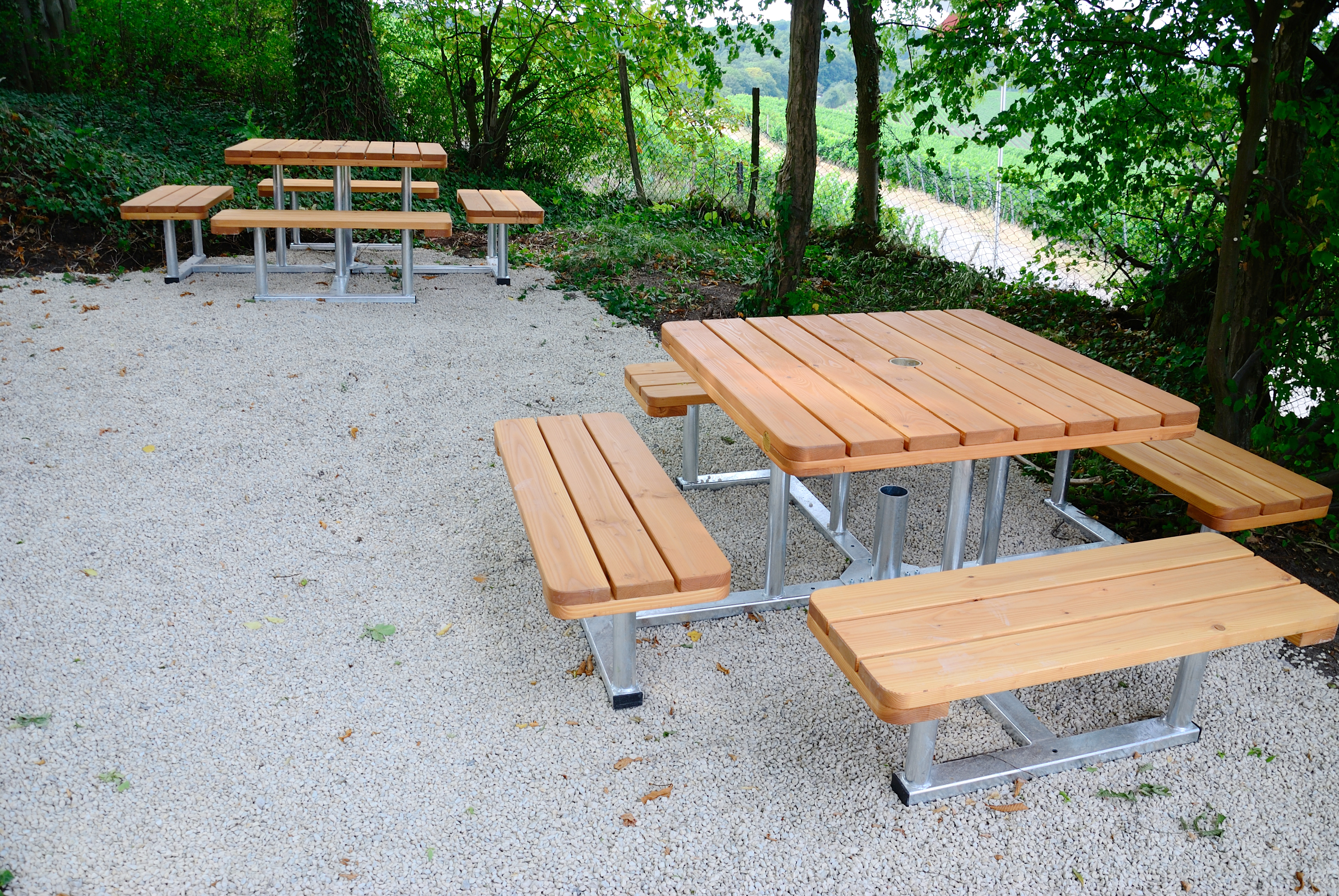 Wir fertigen die Sitzgruppe "Saale" mit und ohne Halterung für den Sonnenschirm "Piazza".