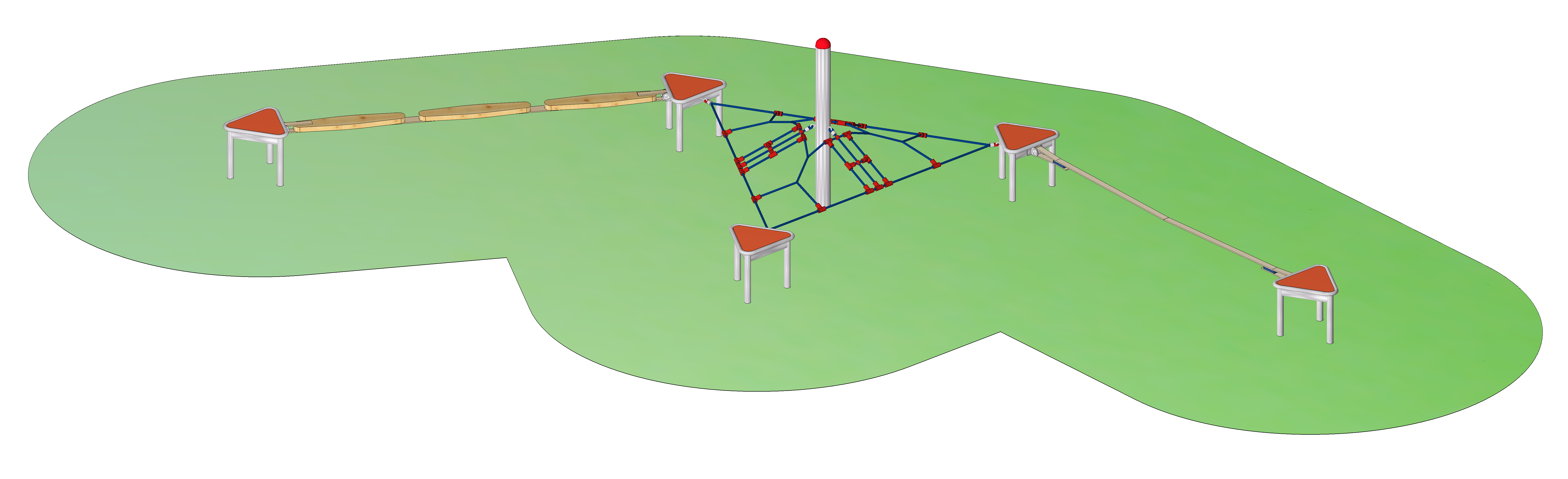 Bestehend aus einer Kombination von fünf Dreieckpodesten und Einhängeelementen. Zwischen den Dreieckpodesten sind Balancierhölzer, Gummiband sowie ein Dreiecknetz mit Mittelpfosten und Abdeckkappe.