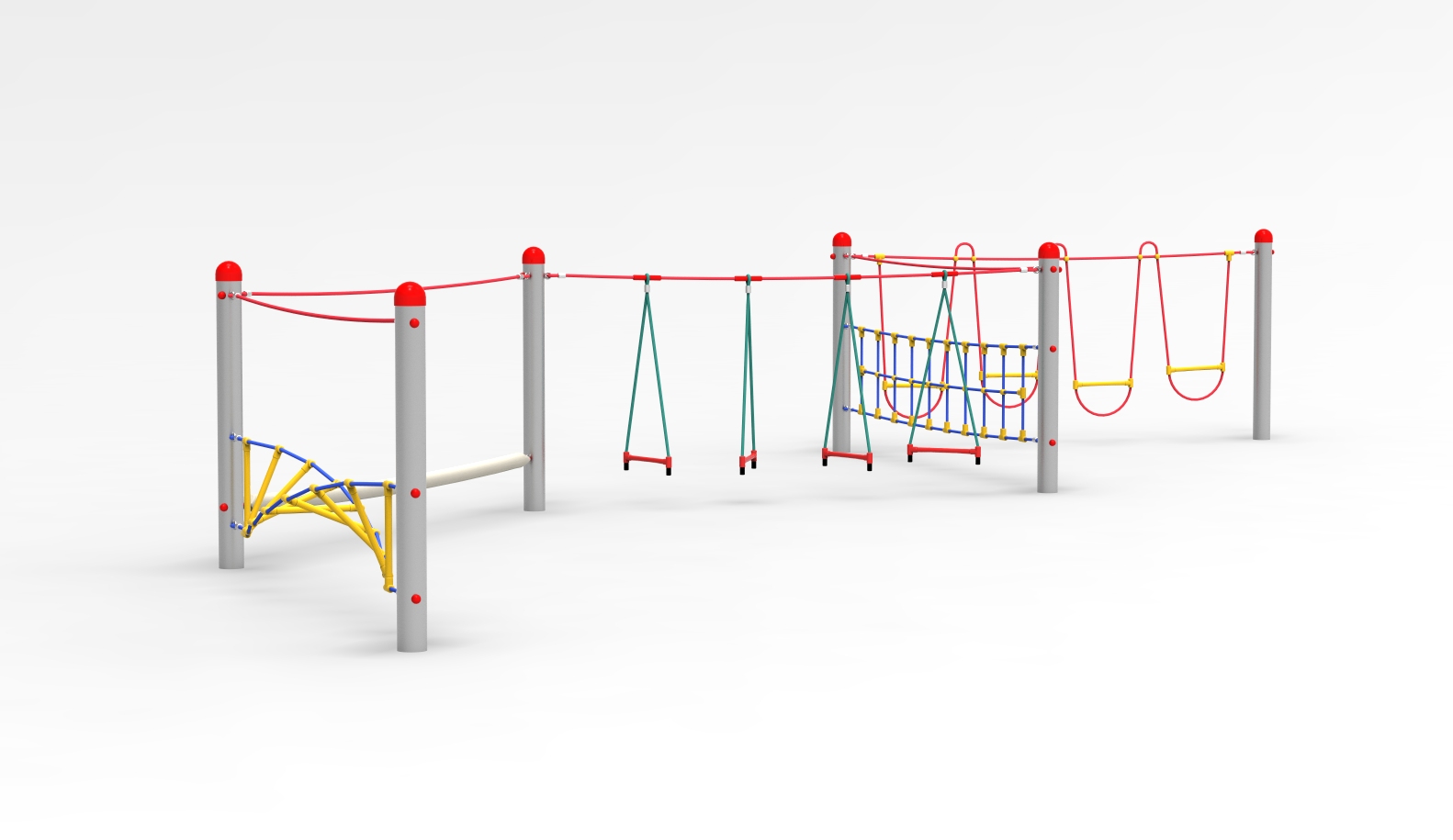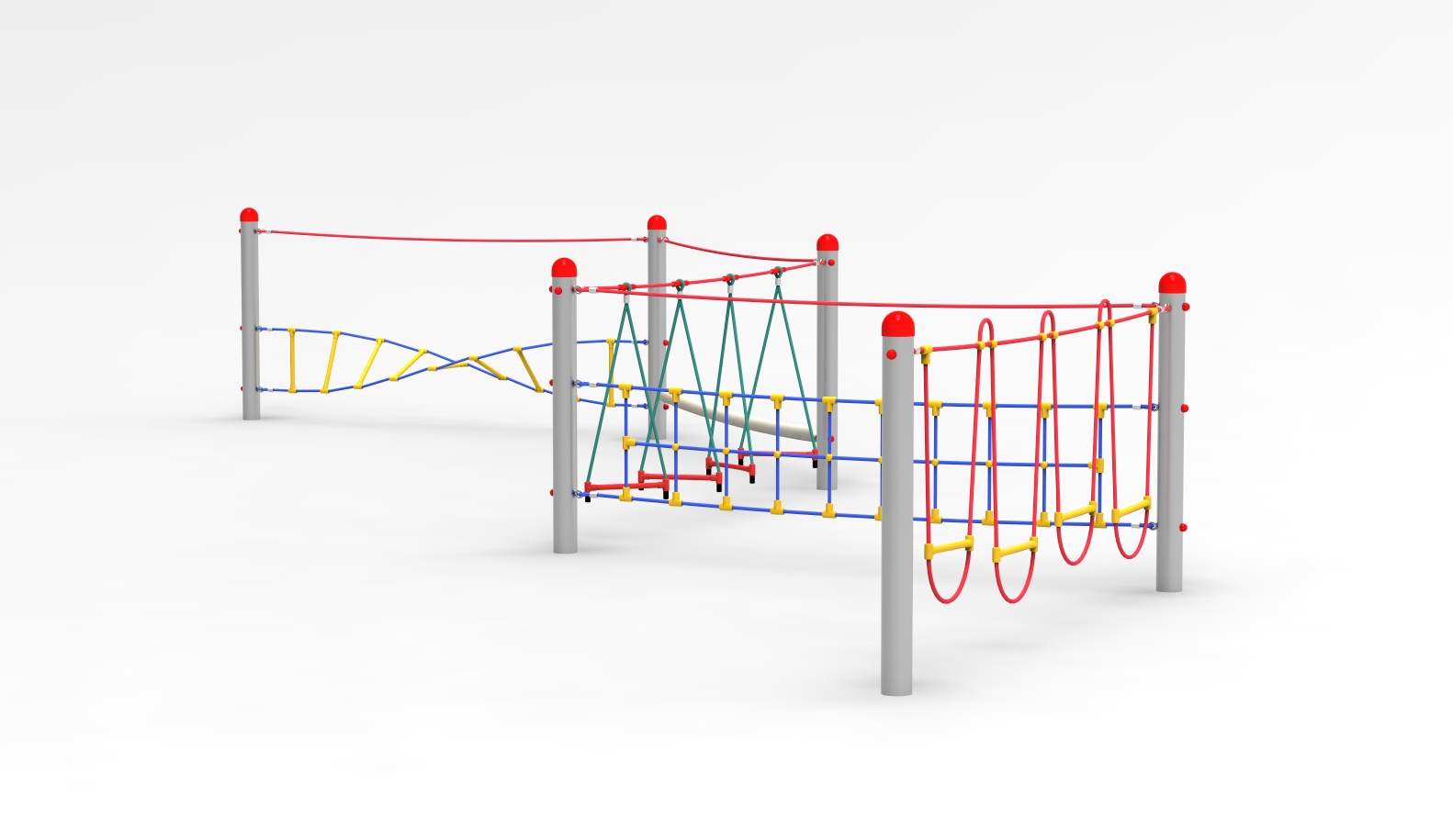 6 x Edelstahlpfosten mit 1 x Schlaufenbrücke, 1 x Balanciernetz mit Halteseil, 1 x Triangelstrecke, 1 x Feuerwehrschlauch mit Halteseil, 1 x Spiralleiter mit Halteseil