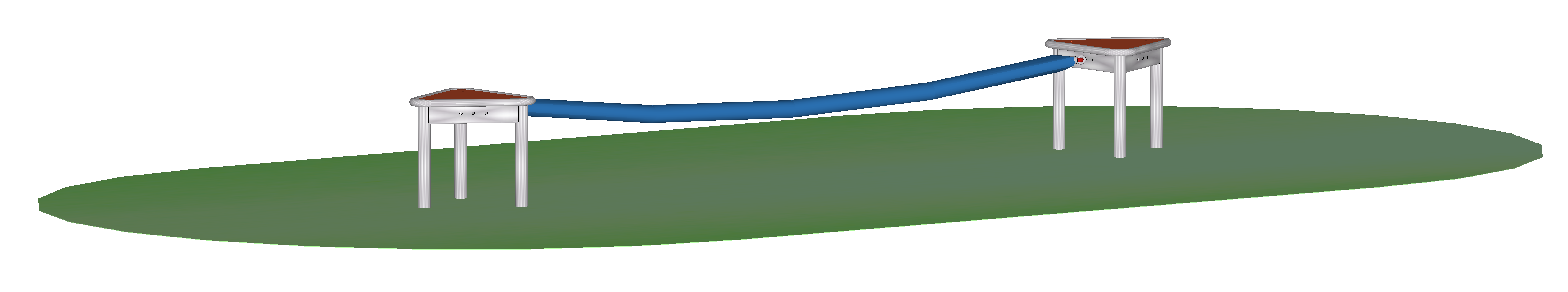 Kombination aus zwei Dreieckpodesten und einem dazwischen befestigtem Feuerwehrschlauch. Die Dreieckspodeste bestehen aus einer Edelstahlhalterung und die Standfläche aus widerstandfähigem HPL. Der Feuerwehrschlauch ist außen aus hochfestes Polyestergarn und innen synthetischer Kautschuk. Dieser ist auf einem Herkulesseil gefädelten Rundholzstücken gefüllt.