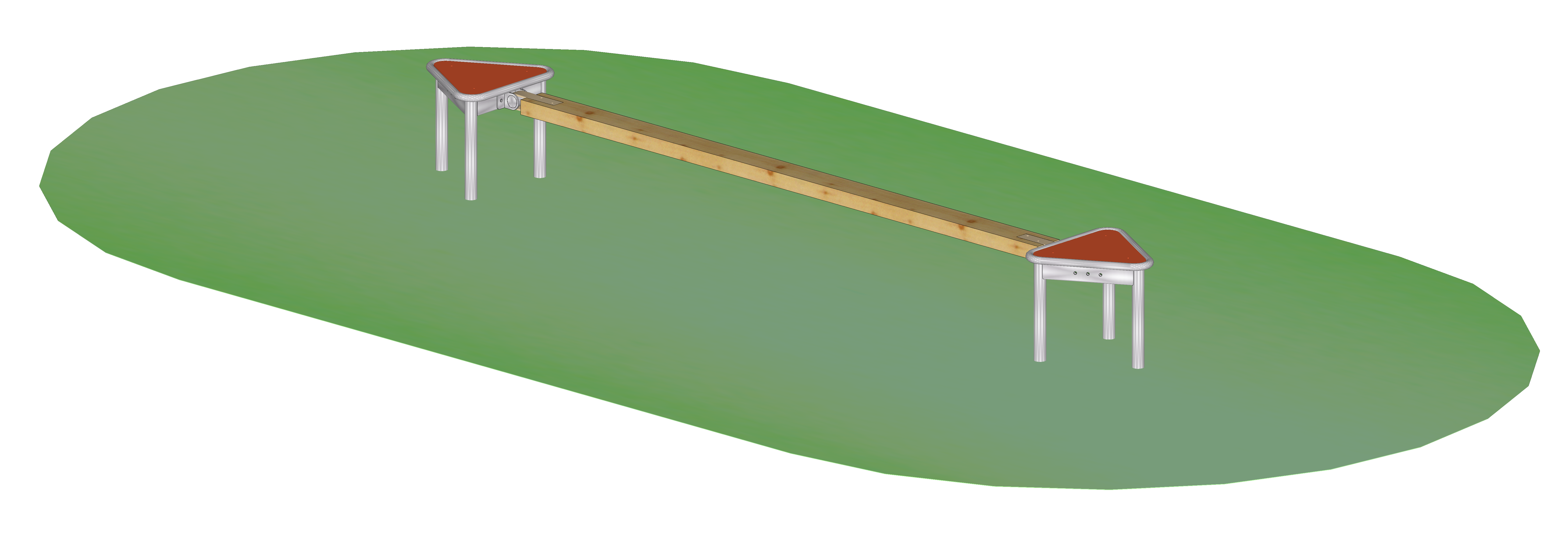 Kombination aus zwei Dreieckpodesten und einem dazwischen befestigtem Schwebebrett. Die Dreieckspodeste bestehen aus einer Edelstahlhalterung und die Standfläche aus widerstandfähigem HPL. Das Schwebebrett ist ein 12 cm breites Kantholz mit einer Anbindung aus Gummiband und Halterung aus Edelstahl.