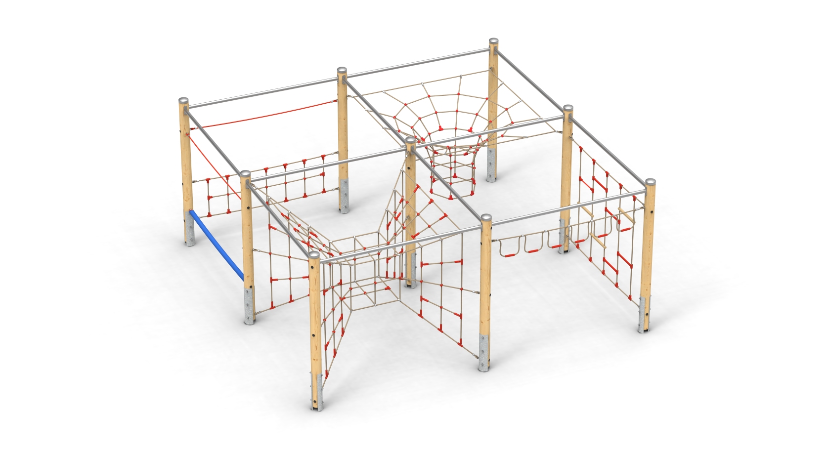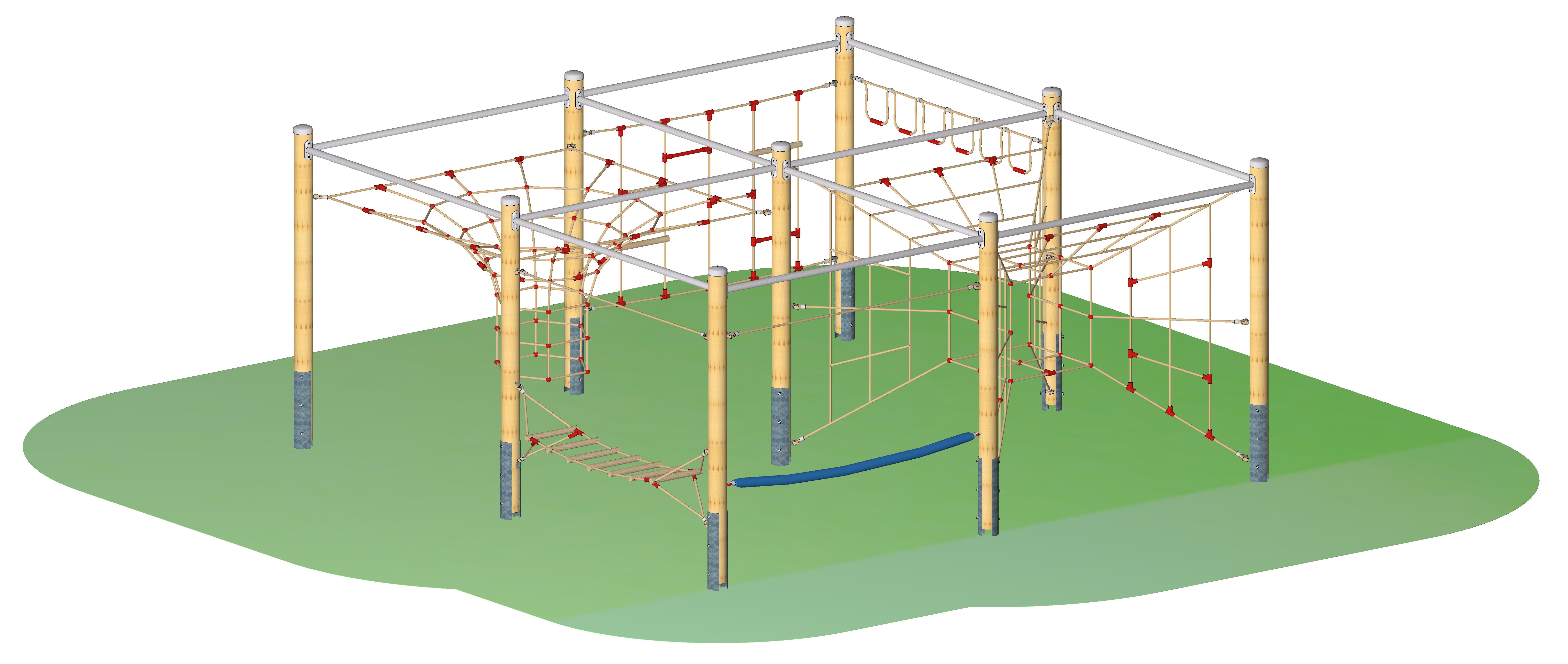 Eine Anlage aus 9 Pfosten mit quadratischem Grundriss, die Spielmöglichkeiten für eine ganze Schuklasse bietet.