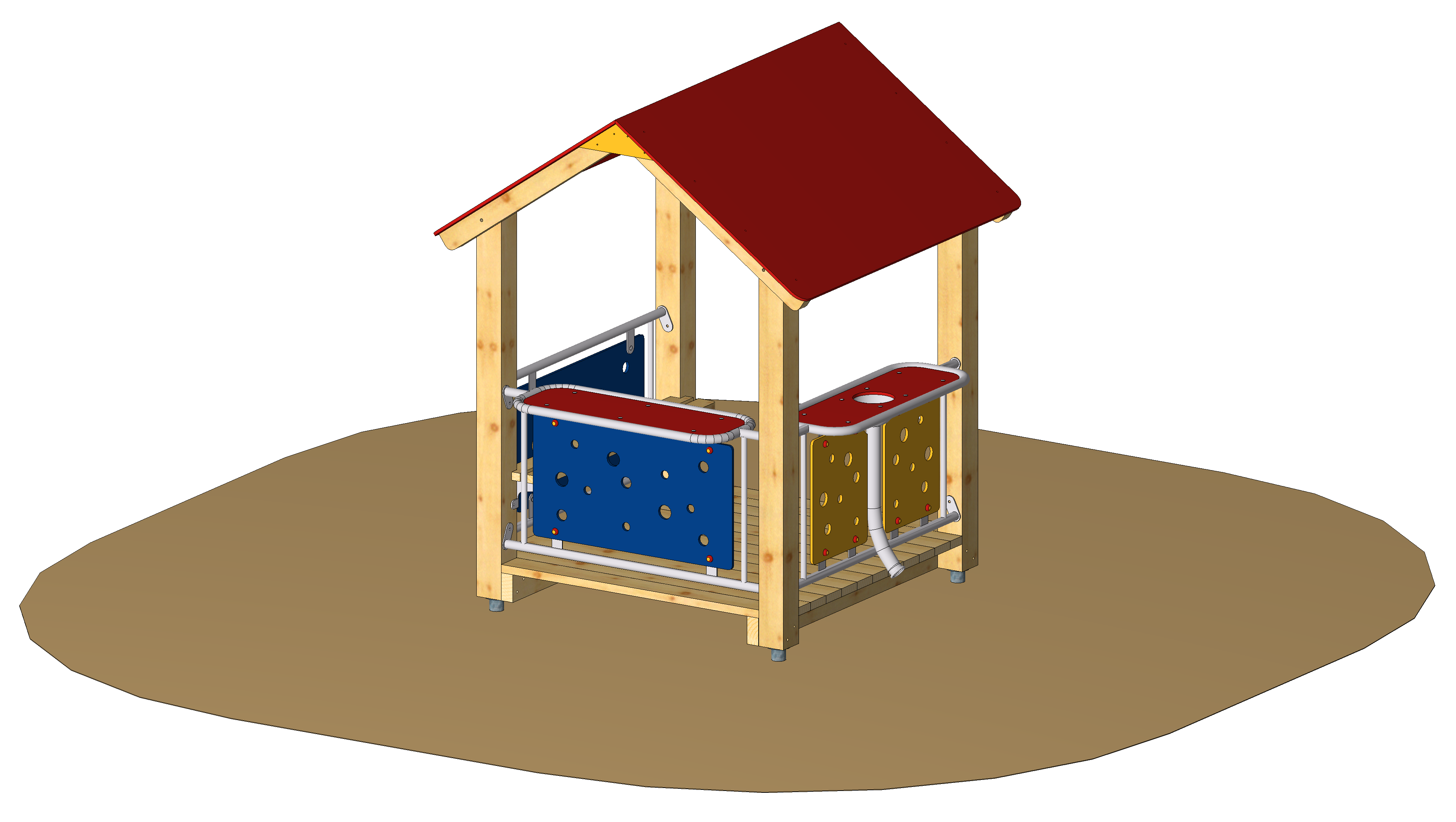Großes Spielhaus mit einer Grundfläche von ca. 120 x 120 cm, Holzfußboden, Einbaubank, Thekenbrüstung 100, Thekenbrüstung 100 mit Sandschütte und Brüstung VA mit Lochplatte.