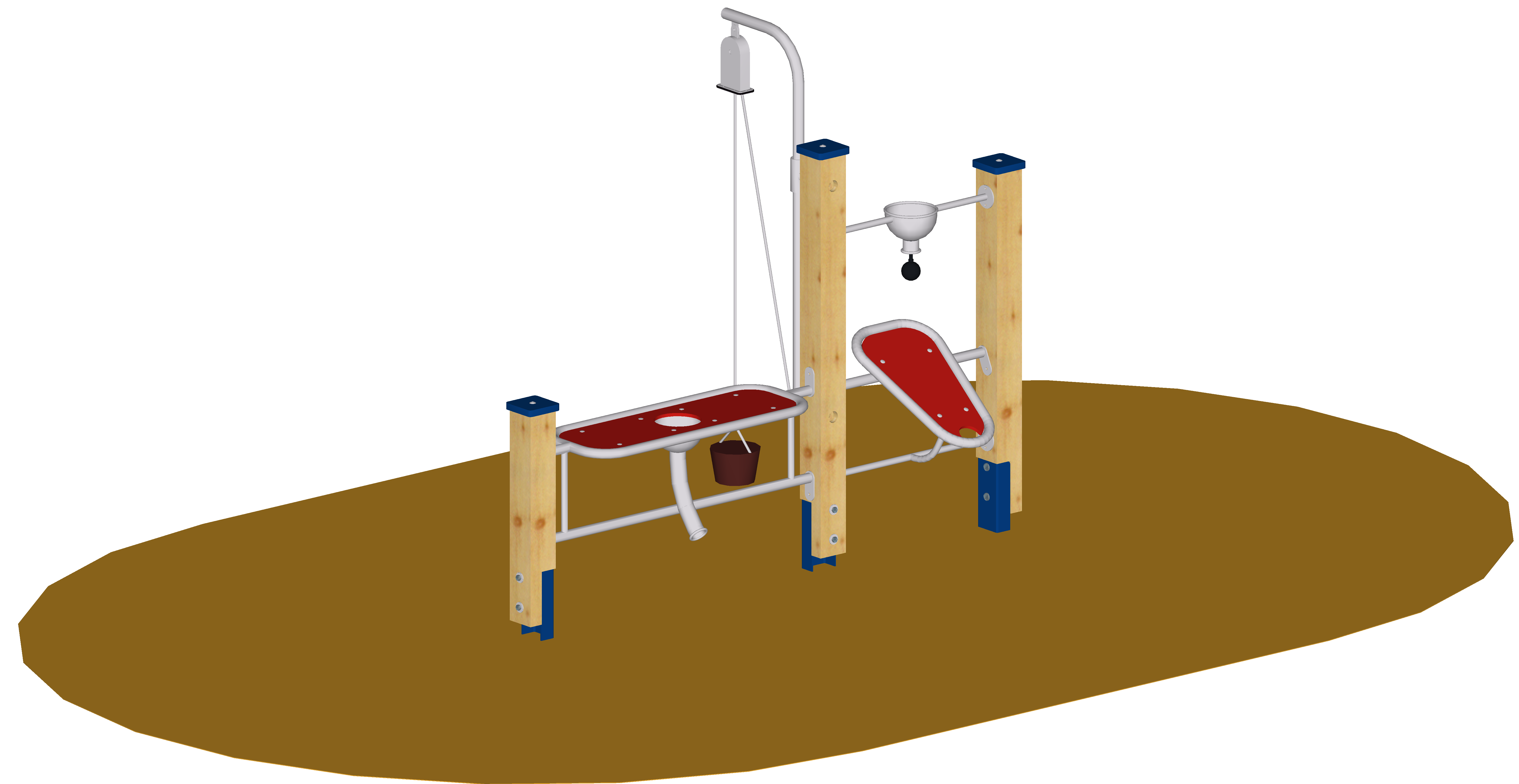 Kombination aus Sandladestation, Theke 100 mit Sandschütte und drehbaren Sandkran. Drei Standpfosten mit Abdeckkappen und Pfostenschuhen.