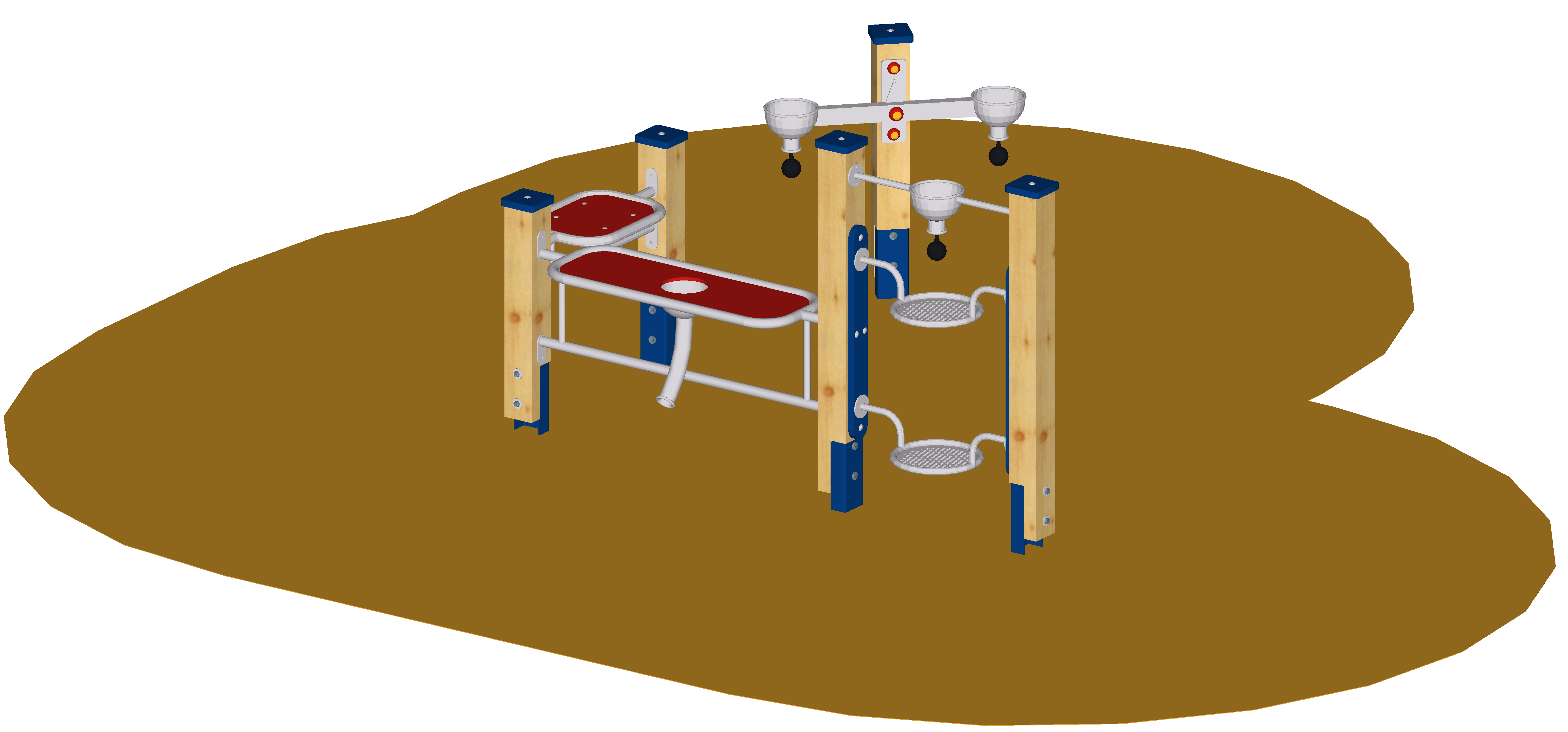 Einzeln stehende Sandwaage und Kombination von Sandtheke 57, Sandtheke 100 mit Sandschütte und kompletter Siebstation. Fünf Standpfosten mit Abdeckkappen und Pfostenschuhen.