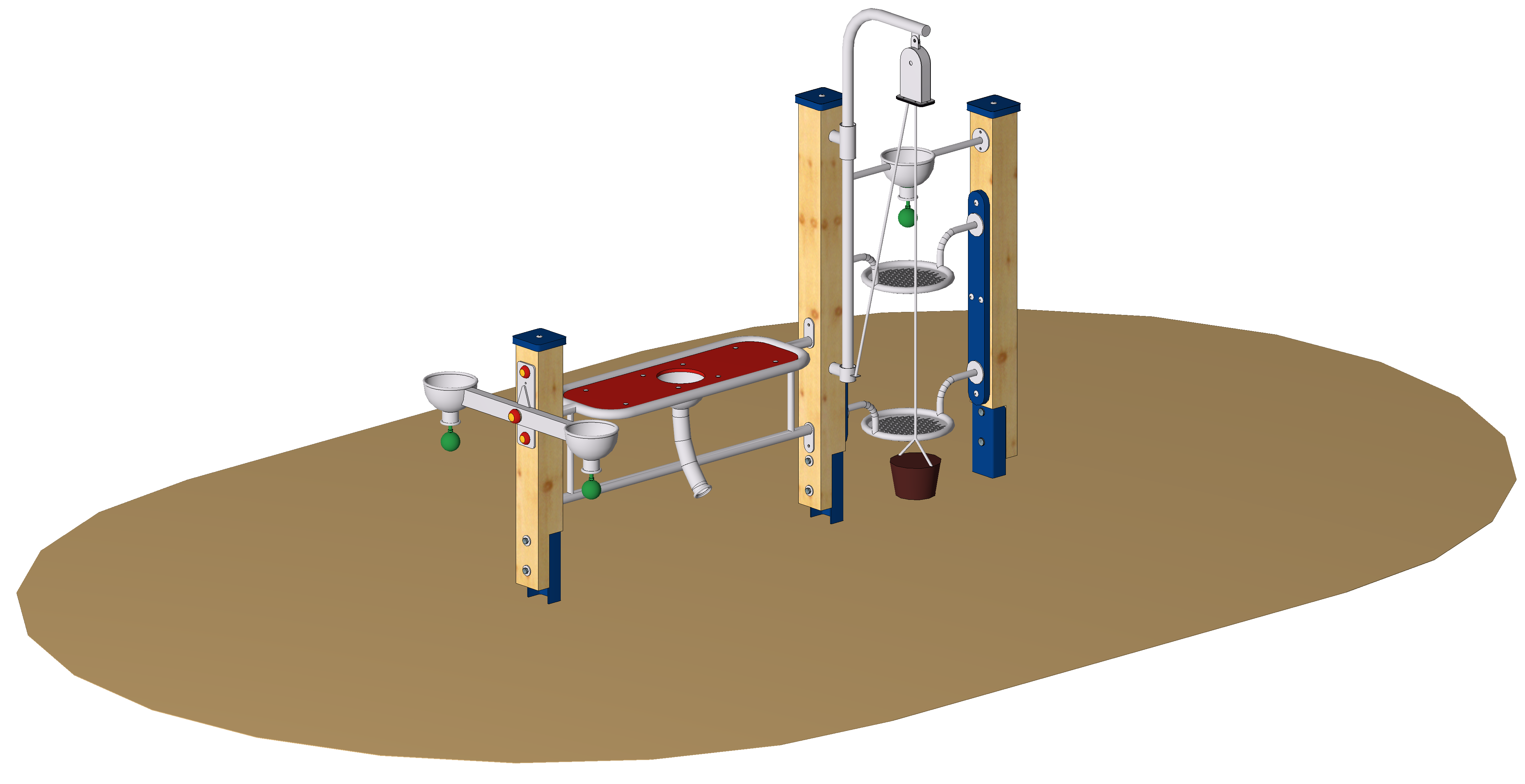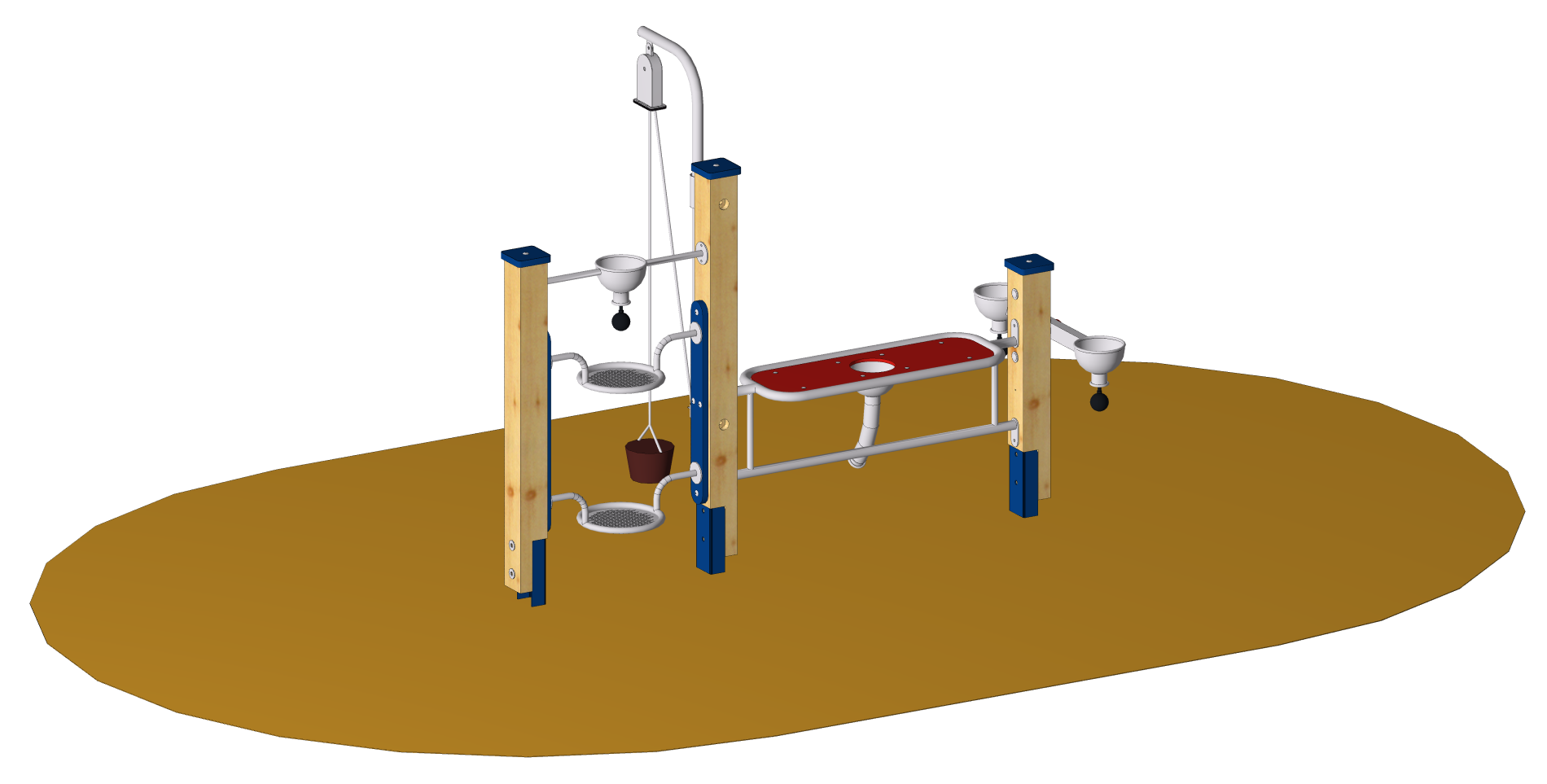Vielfältiges Sandlabor mit Sandwaage, Sandtheke mit Sandschütte, drehbarem Sandkran und einer Sand-Siebstation.