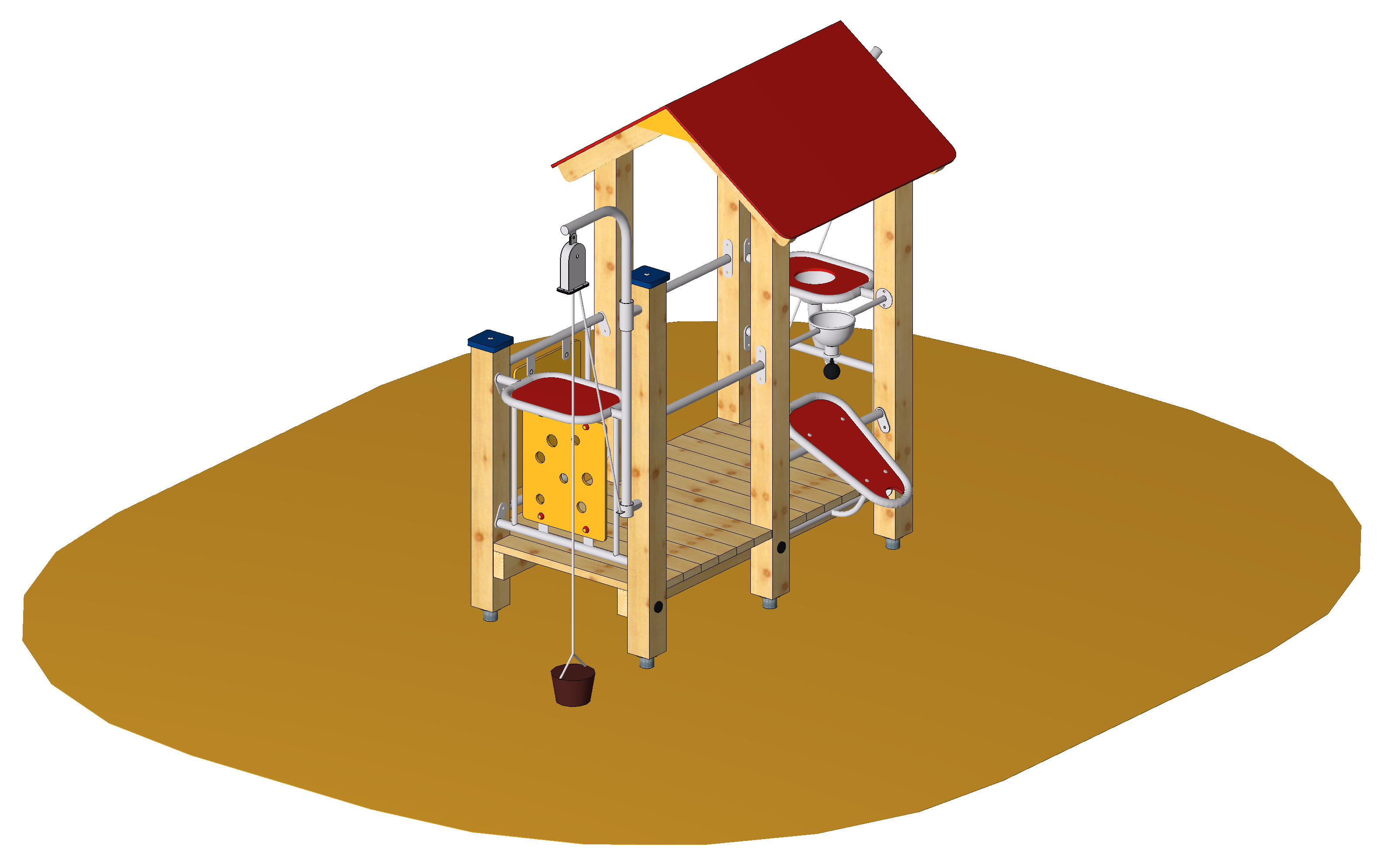 Baupodest aus einem Verandaturm mit verschiedenen Sandspielmöglichkeiten: Sandaufzug, Theken, Sandschütte, Sandladestation und drehbarem Sandkran.