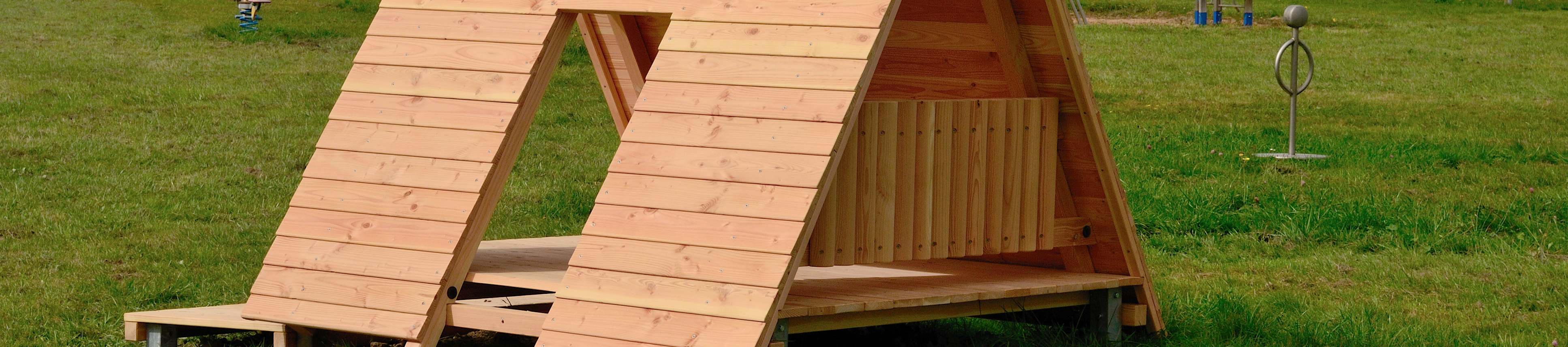Das Spielhaus "Zeltdach" hat ein bekletterbares Dach. Die Dacheindeckung ist aus Stülpschalung mit Steighilfen. Als Brüstungen sind Halbrundhölzer verbaut und der Boden besteht aus Hobeldielen. Das Spielhaus ist auf vier feuerverzinkten Metallfüßen aufgeständert.