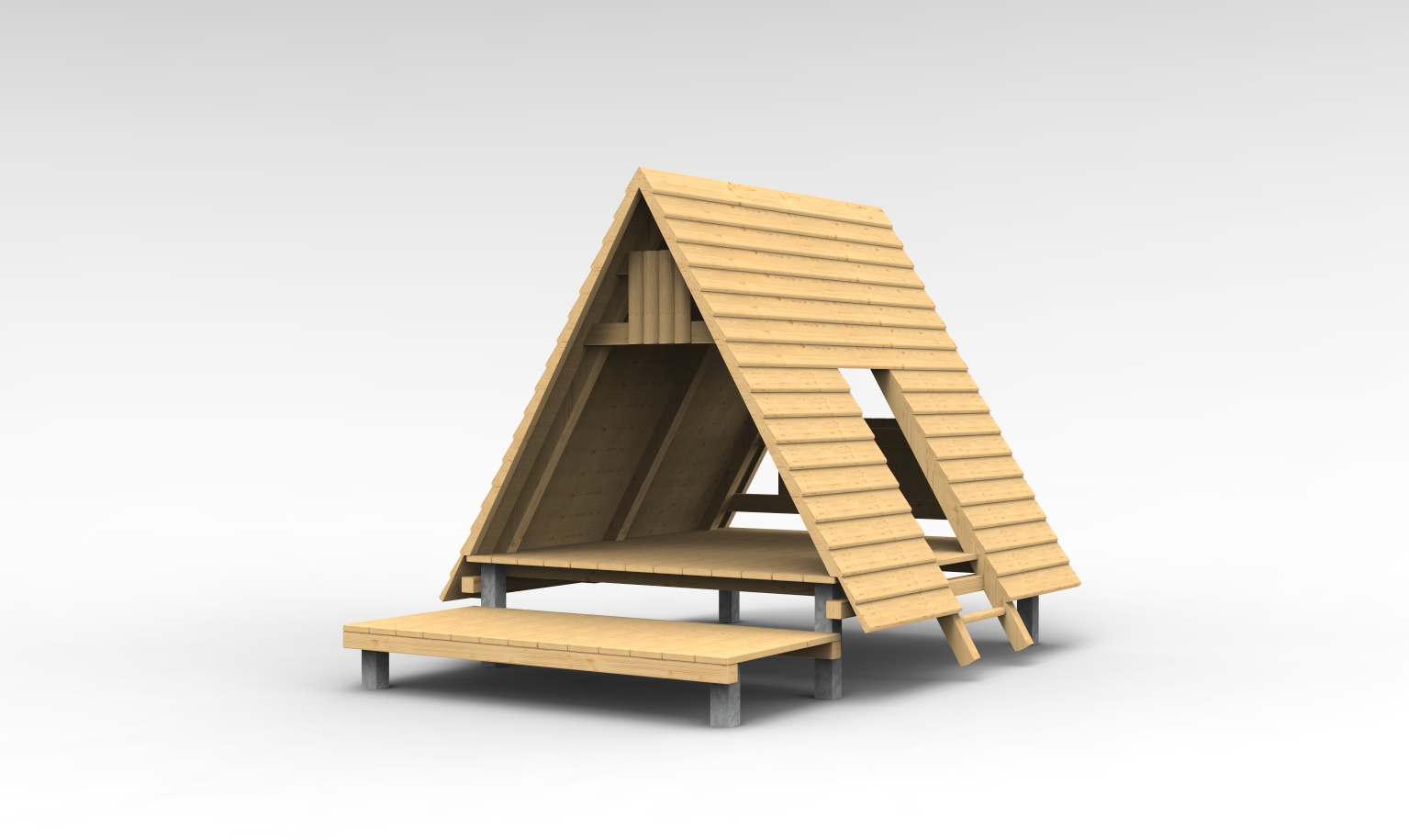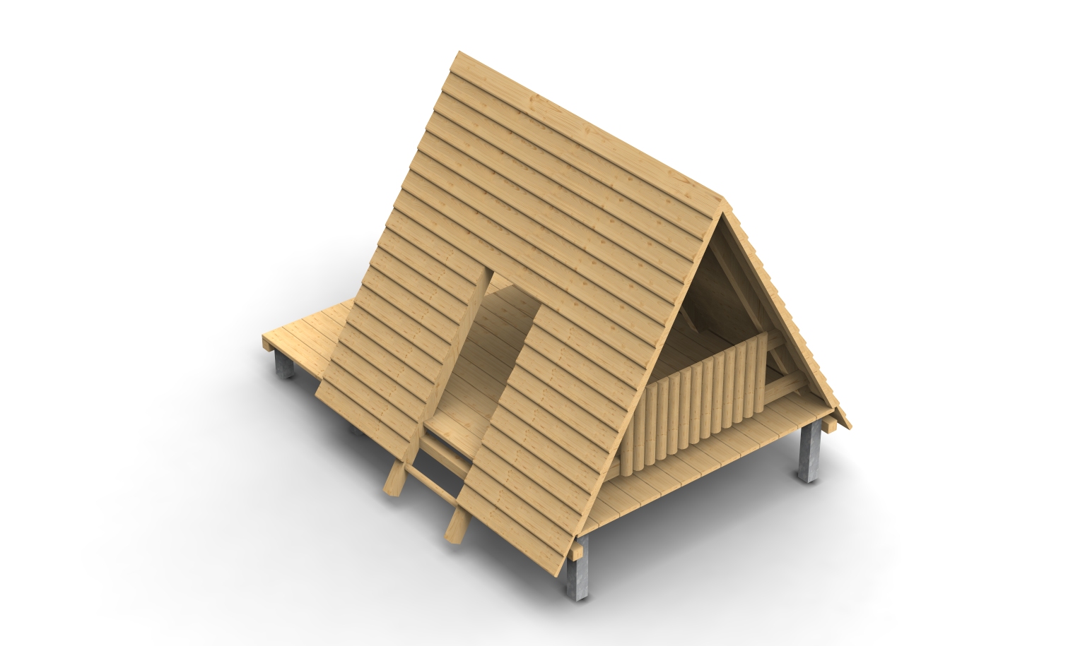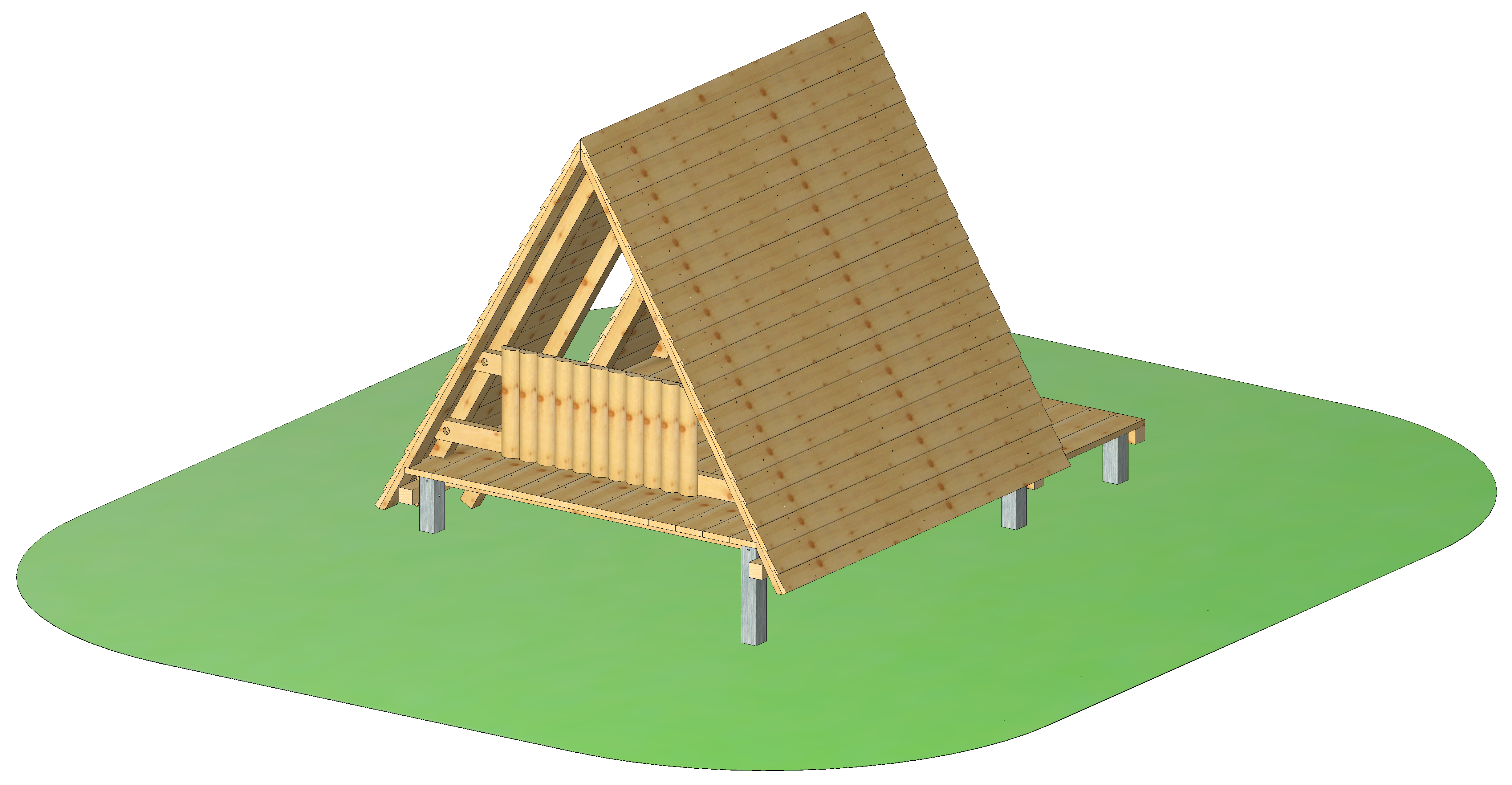 Bestehend aus einer Veranda, einem seitlichen Eingang durch einen Sprossentritt, einer Halbrundholz-Brüstung hinten und Dach aus Stülpschalung. Die Aufständerung ist auf sechs feuerverzinkten Metallfüßen.