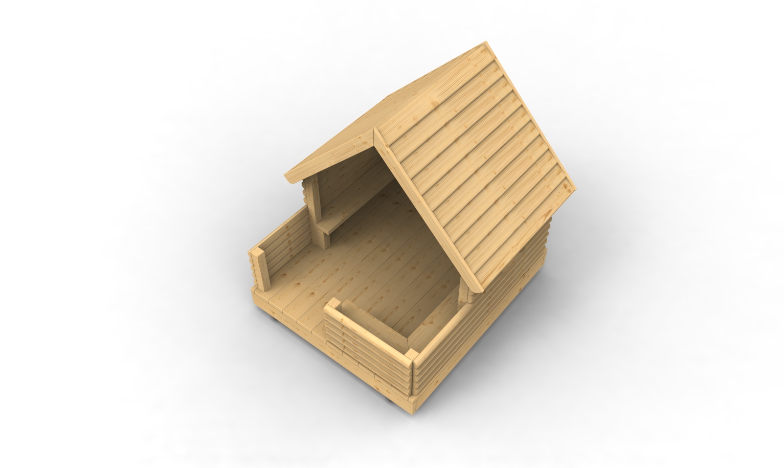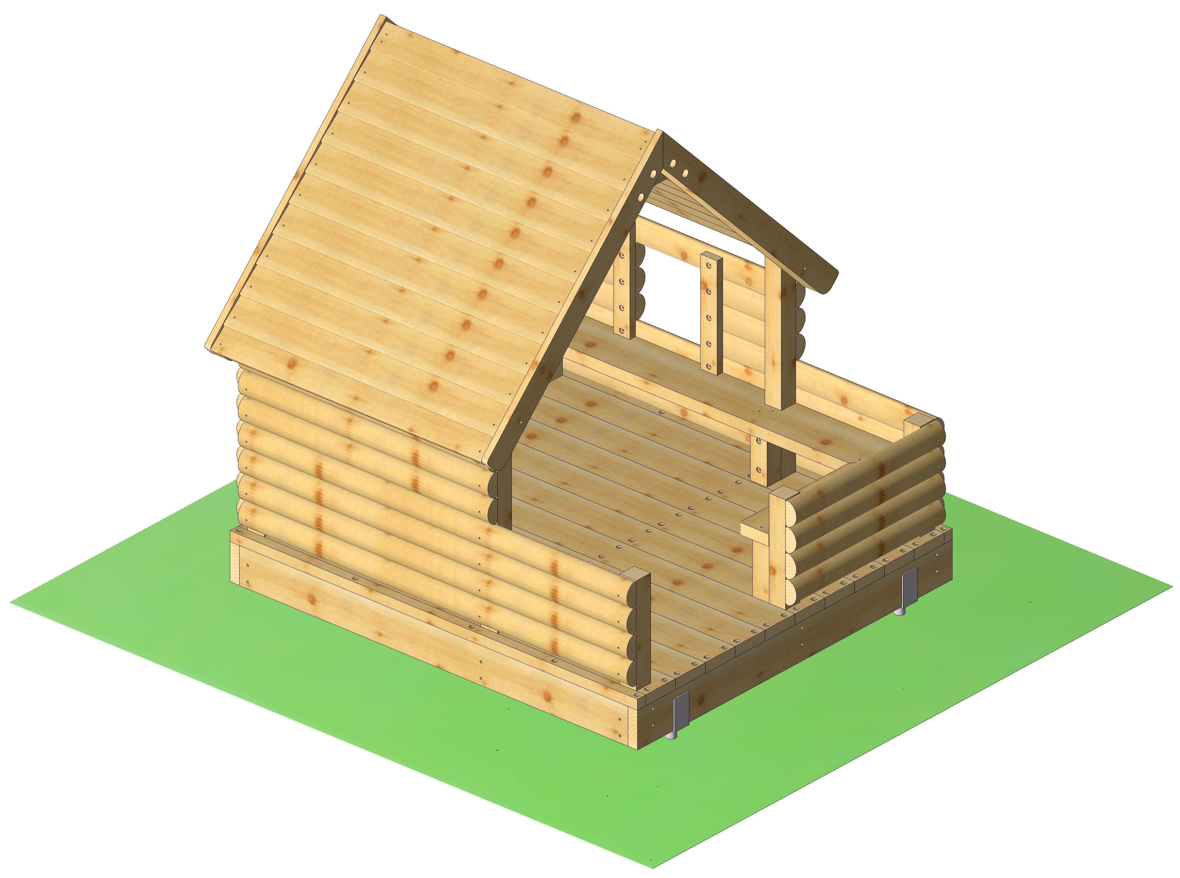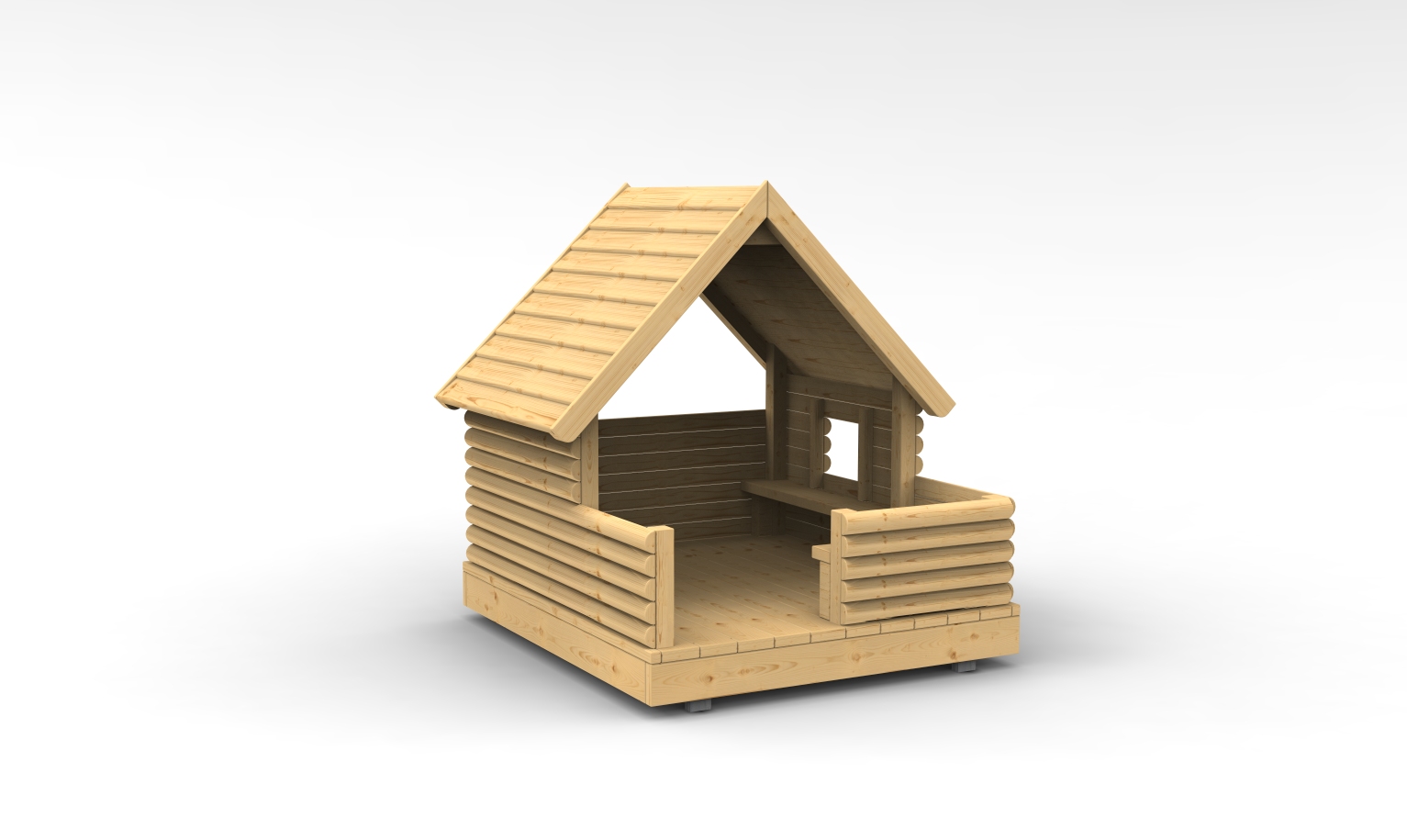 Ein Spielhäuschen mit Dach, Veranda, Fenster und Sitzbänke. Das Dach besteht aus Stülpschalung, Wände aus Halbrundhölzer, Sitzbänke und Boden aus Hobeldielen. Das Spielhaus "Kinderparty" ist auf vier feuerverzinkten Metallfüßen augeständert.