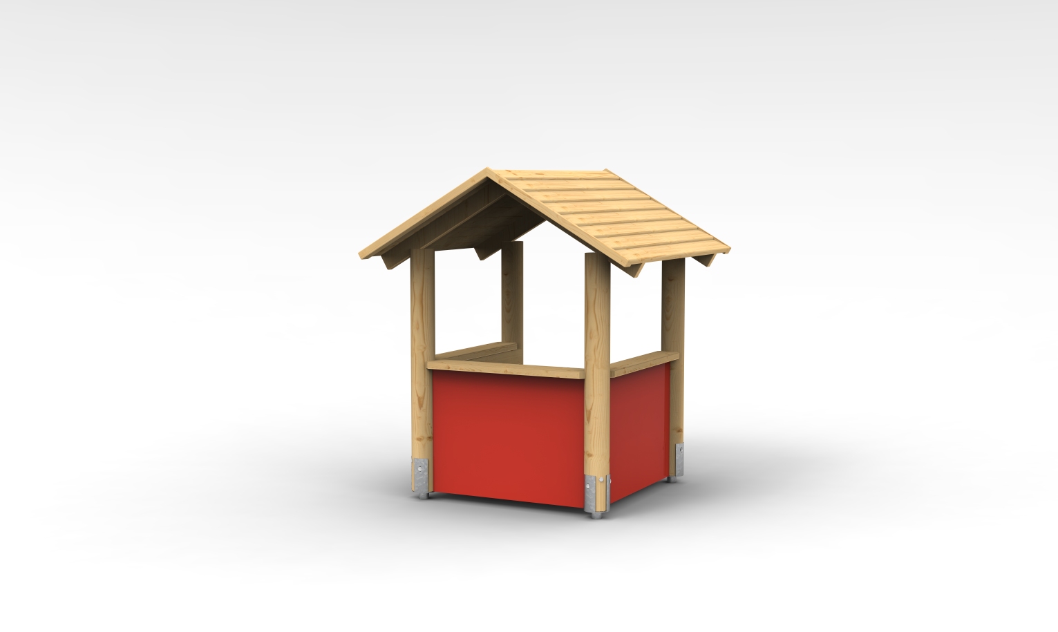 Das Spielhaus hat eine Einbaubank, drei Wände aus HPL mit Thekenbrettern und ein Stülpschalungsdach. Die Standpfosten sind in vier feuerverzinkten Pfostenschuhe aufgeständert.