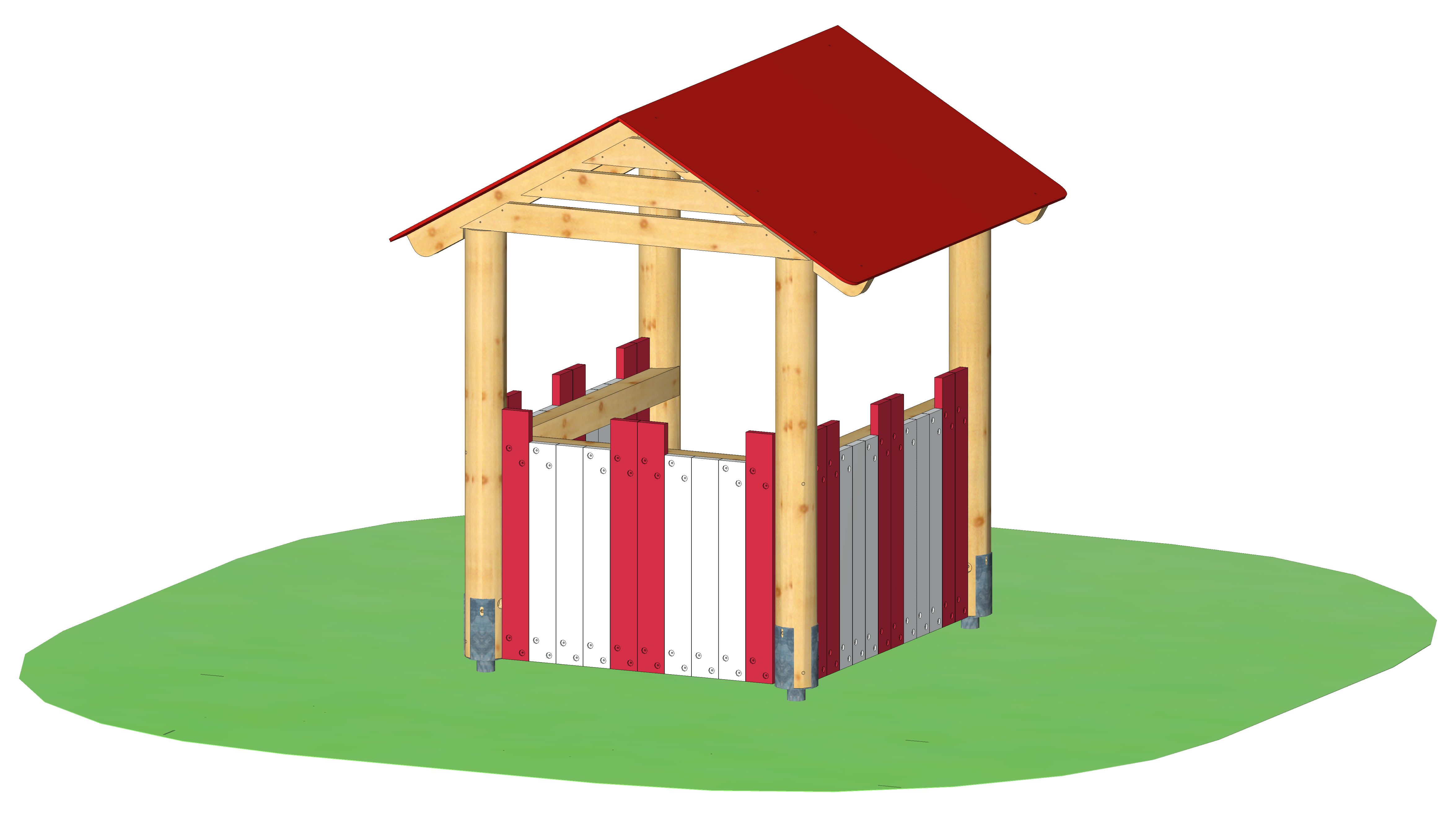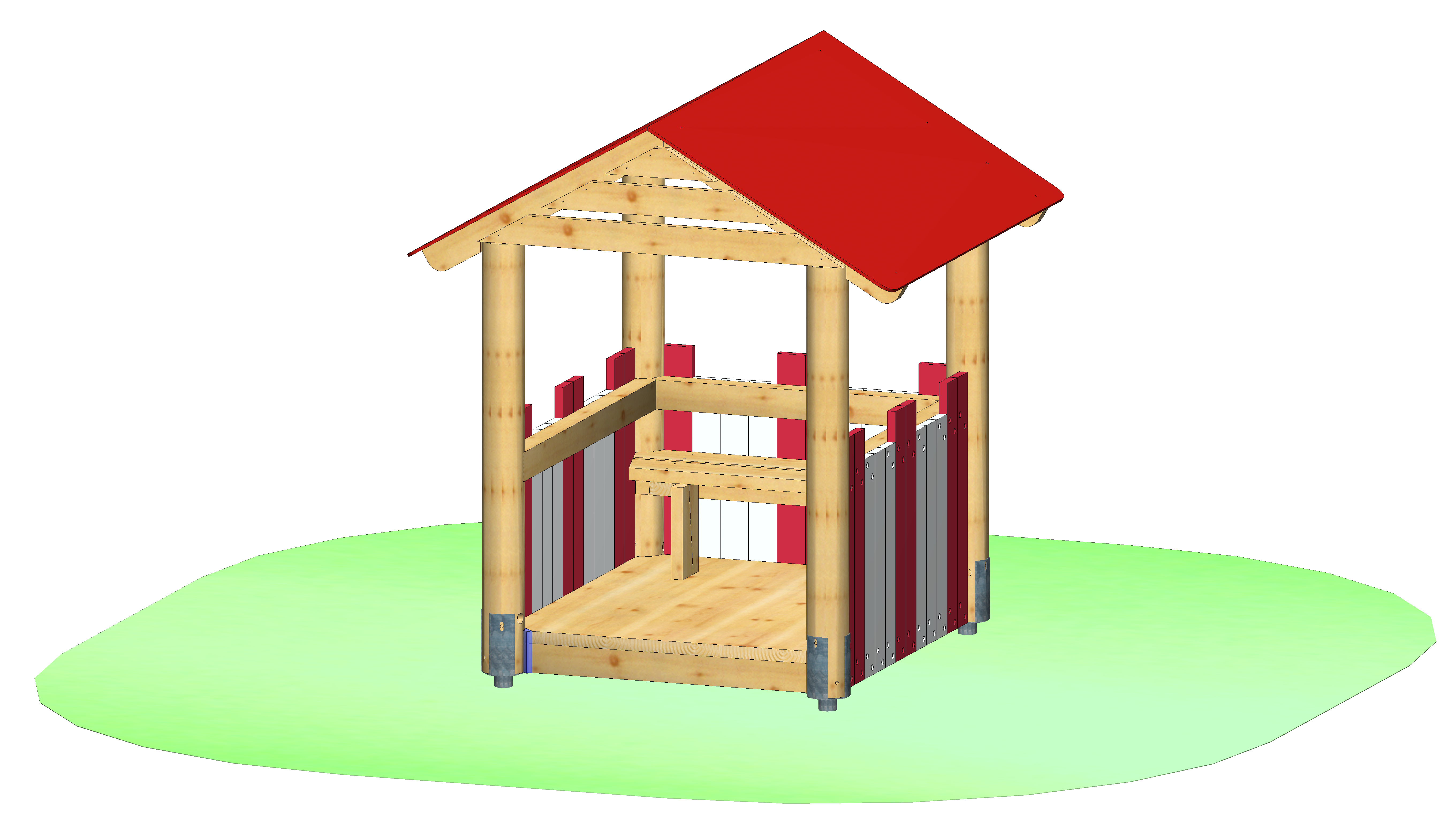 Bestehend aus einem Podestboden, vier Standpfosten mit Pfostenschuhen und einem Satteldach aus HPL, rot-weiß farbig lasierte Kantholz-Brüstung an drei Seiten sowie eine innen befestigte Sitzbank.
