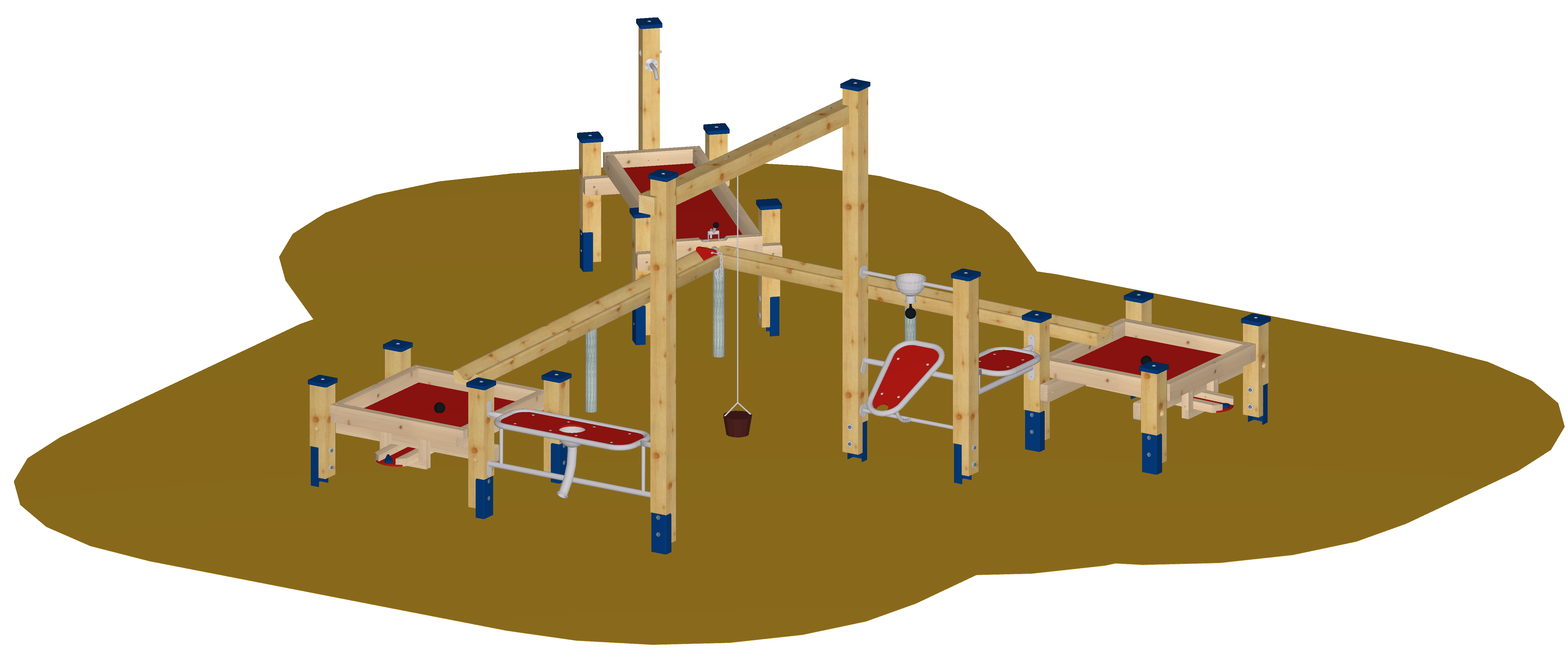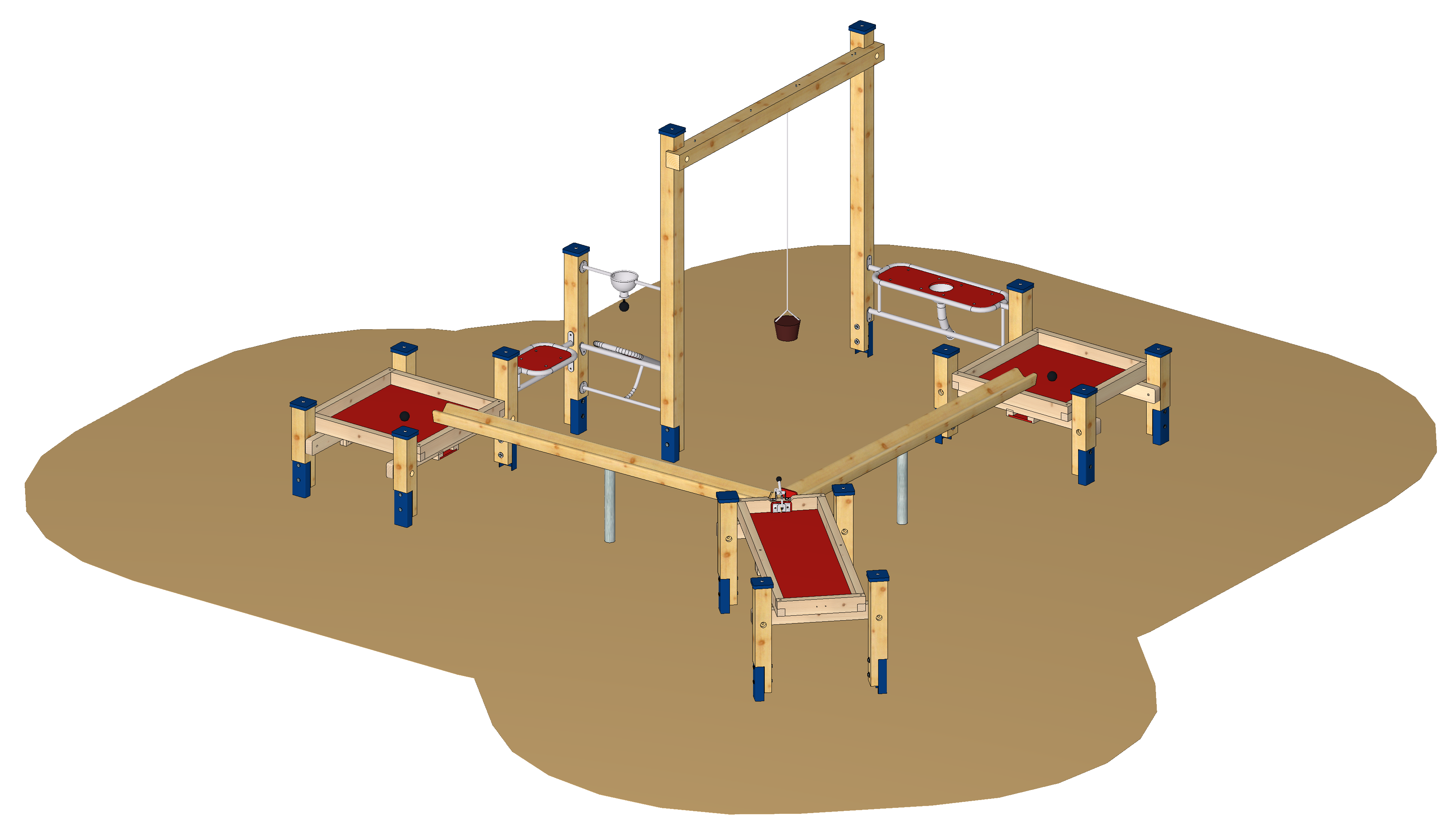 Waagerechter Sandtransport mit Kette und Eimer zwischen den Sandspielelmenten: Theke 100 mit Sandschütte, Theke 57, Rieselbrett und Sandsilo