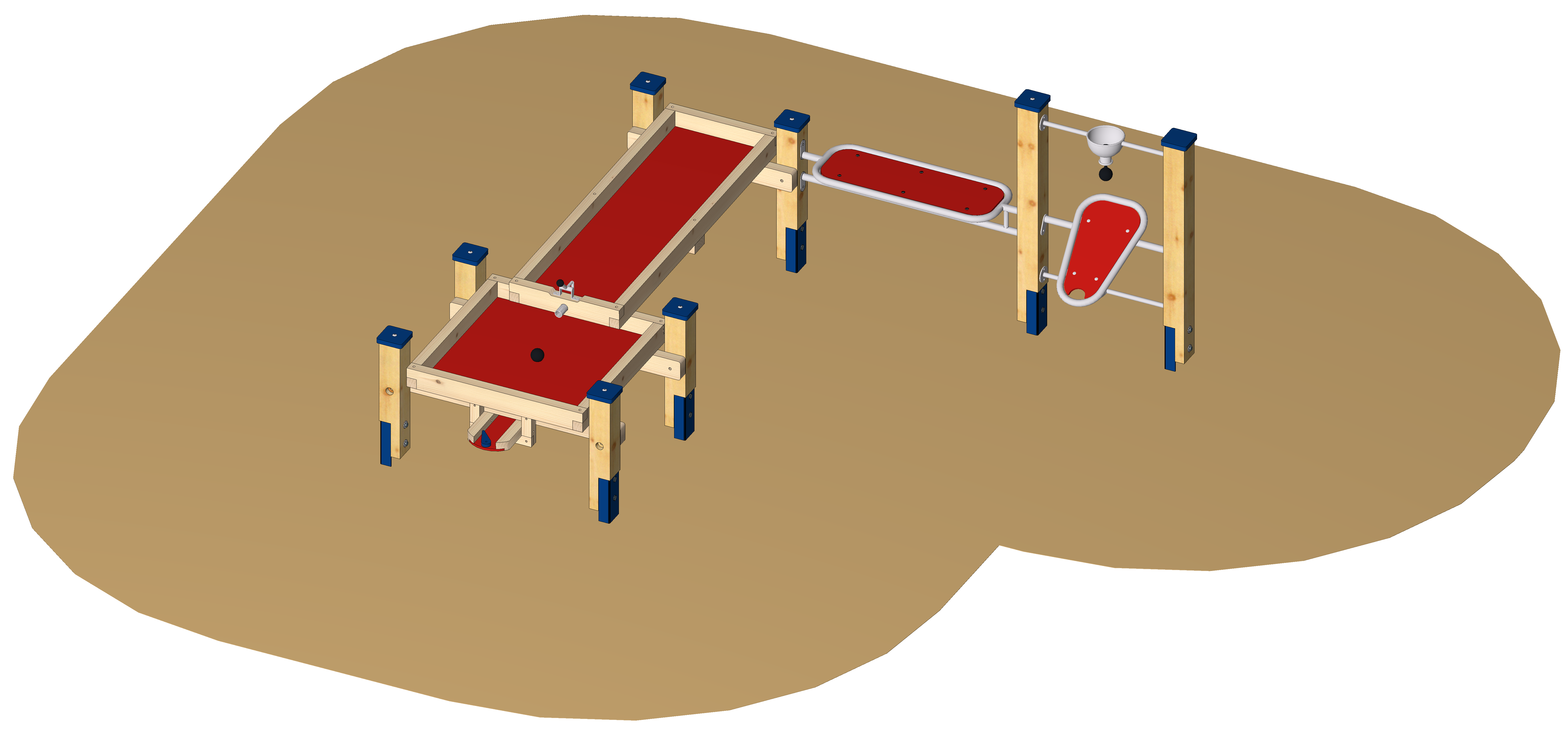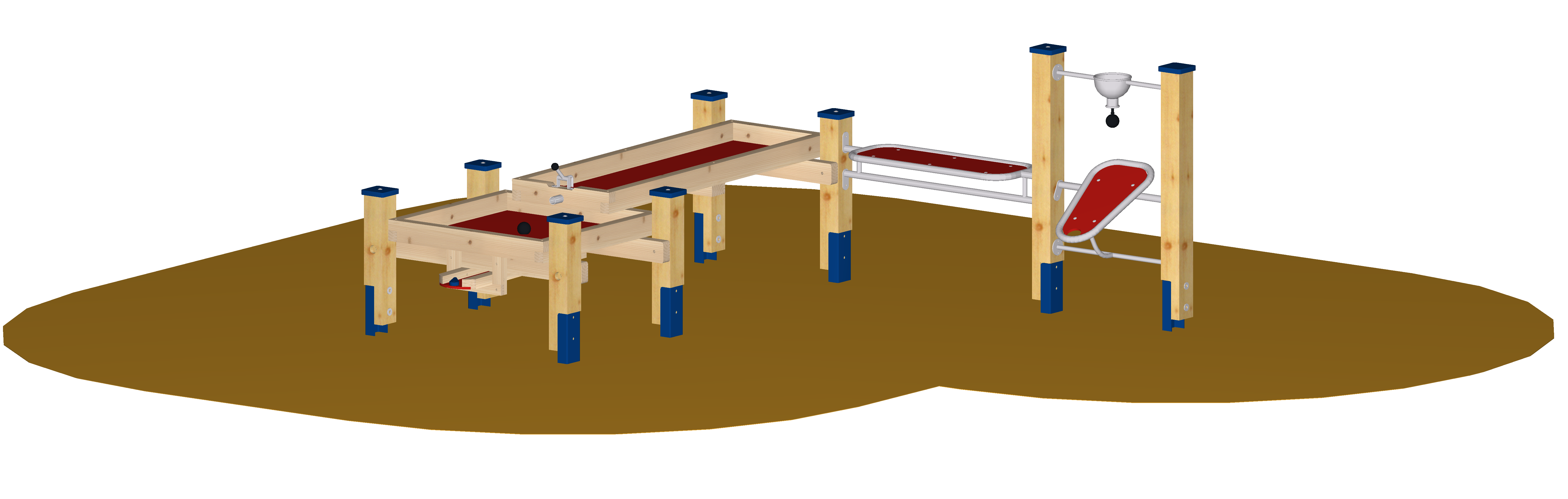 Theke 100, Rieselbrett, Sandsilo und acht Standpfosten für Wasserspiel mit Abdeckkappen und Pfostenschuhen.
