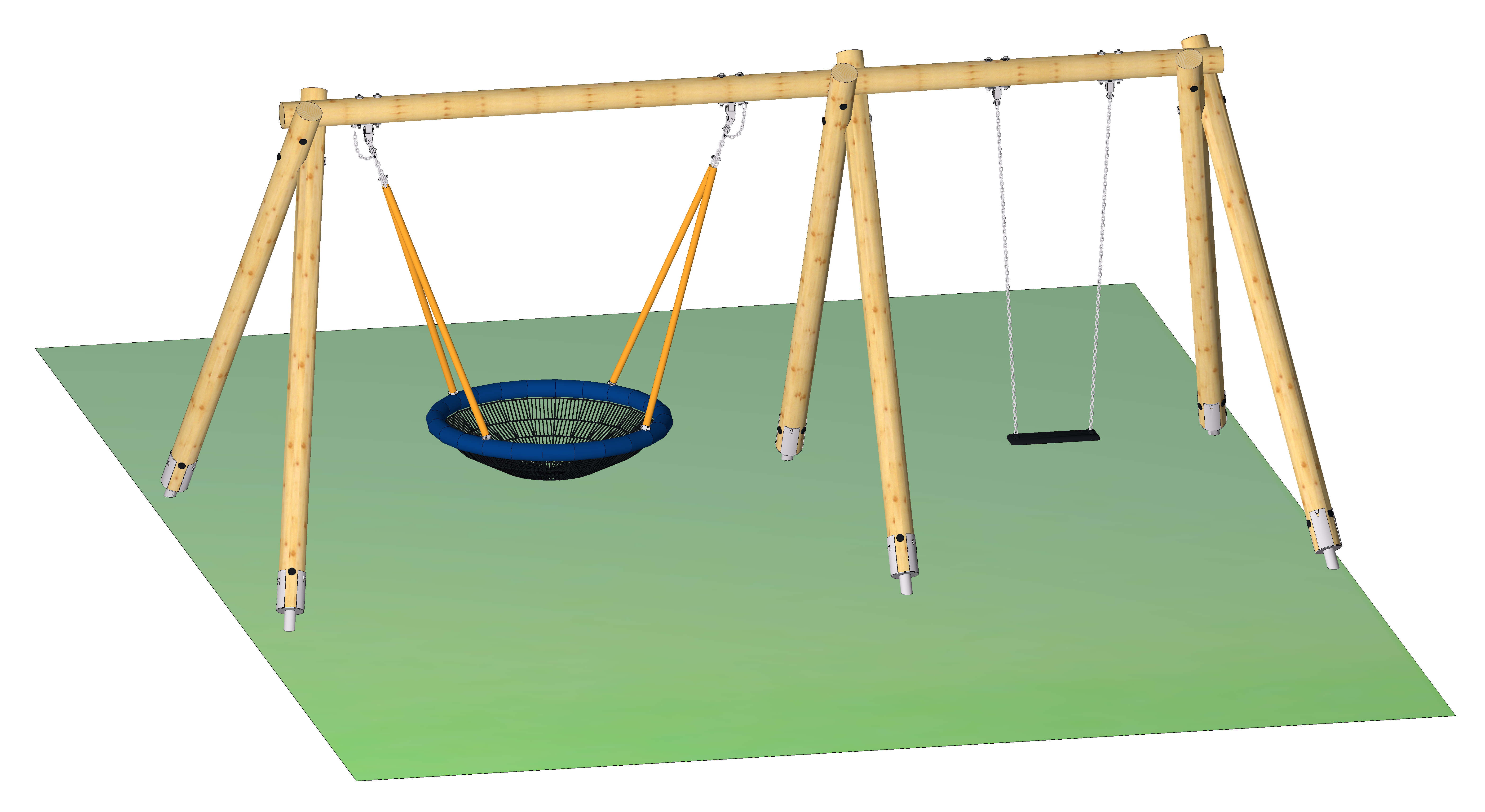 Nest- mit Einsitzerschaukel Rundholz mit Pfostenschuhen, Schaukelhöhe 230 cm inkl. Schaukelgelenke (vormontiert), Nestkorb mit Gliedermatte und Gummischaukelsitz