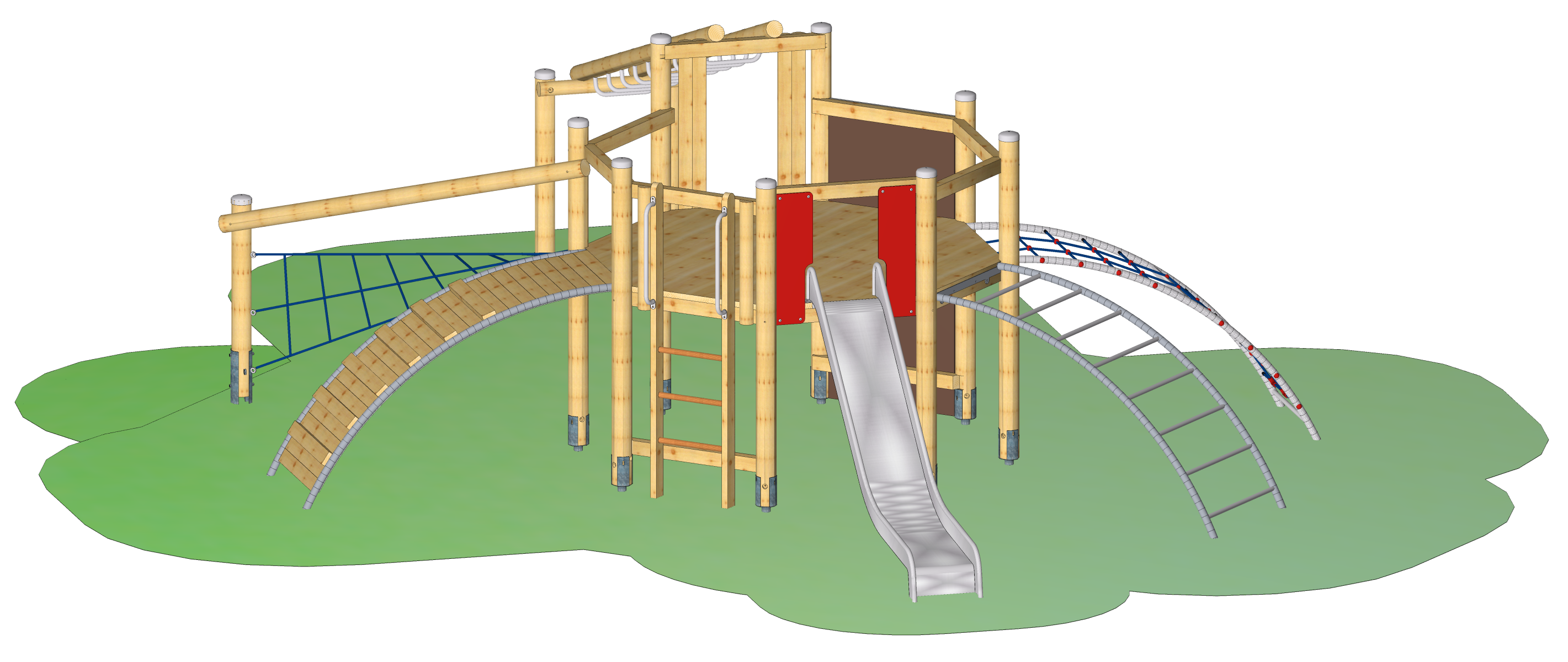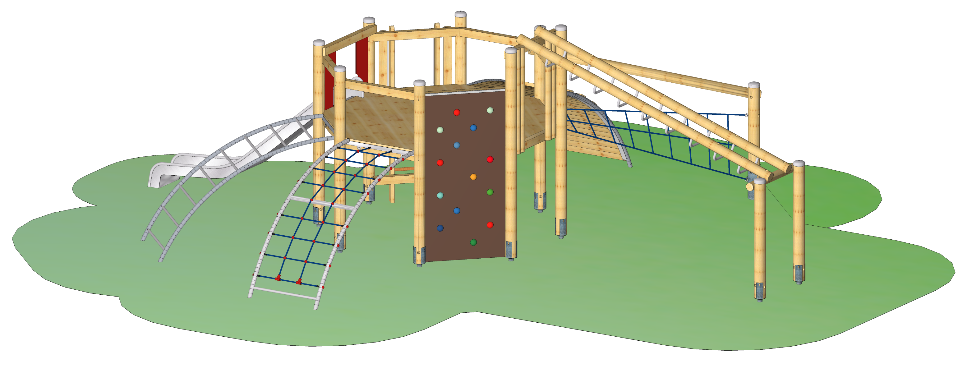 Achteck-Spielkombination, Podesthöhe 140 cm, mit Edelstahlrutsche, Senkrechtleiter, Bogenaufstieg, Raumnetz-Aufstieg, Hangelsteg mit Startpfosten, Free-Climbing-Wand (Gesamthöhe 210 cm), Bogennetzaufstieg, Bogenleiter, konstruktiver Holzschutz durch Pfostenschuhe und Abdeckkappen.