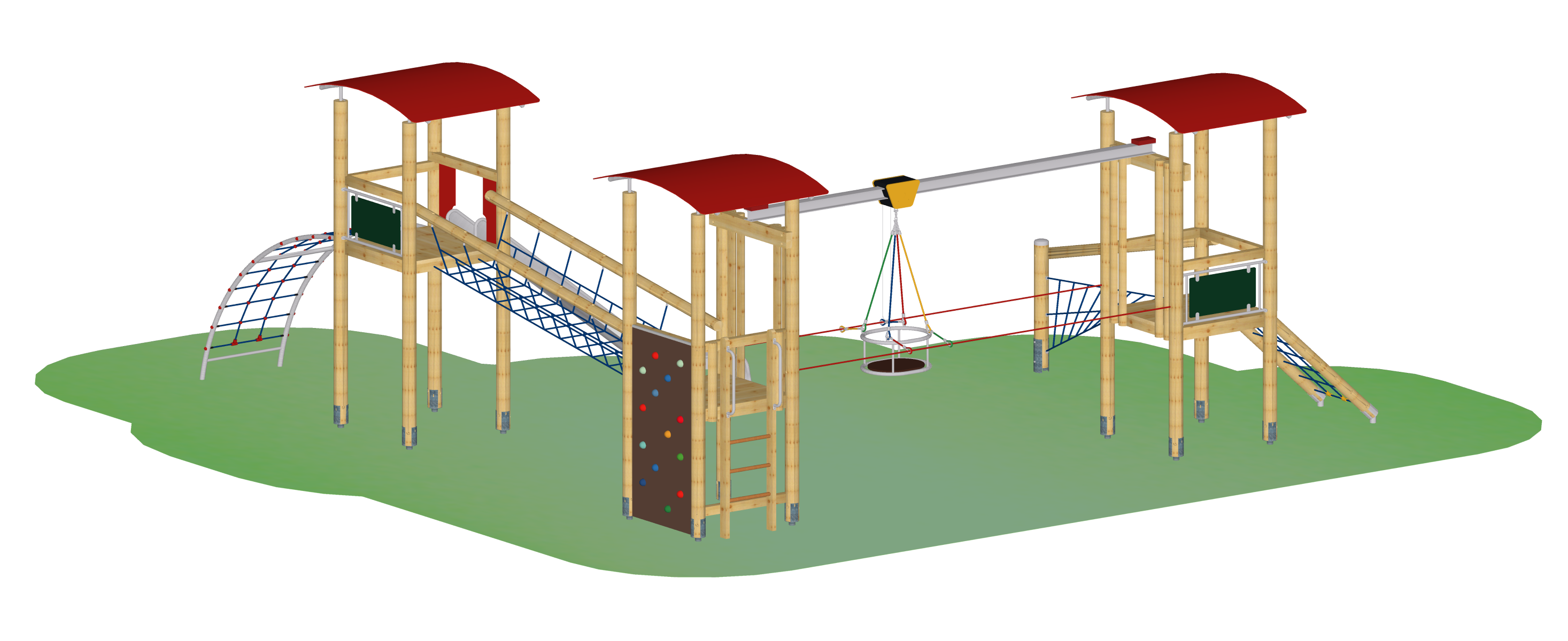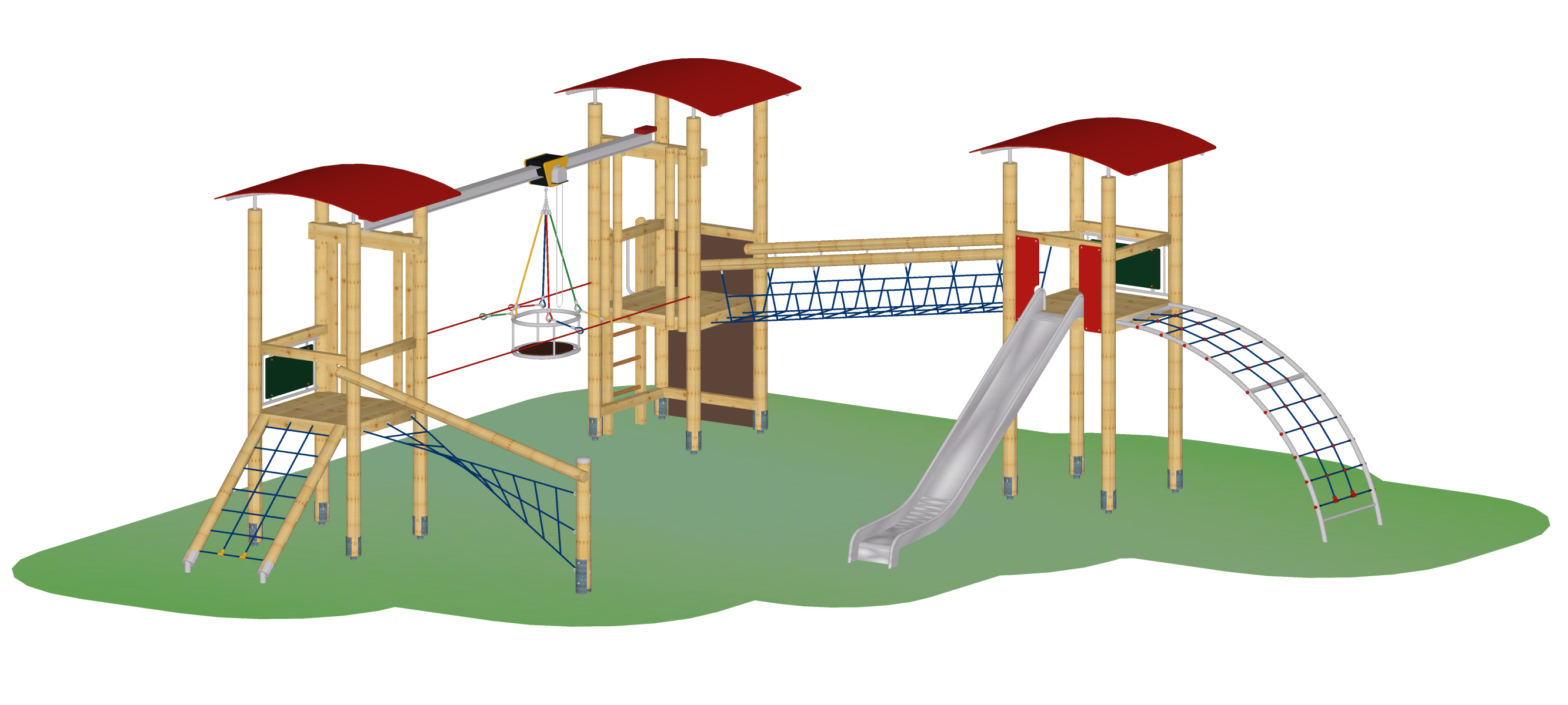 Spielkombination aus zwei Vierecktürmen für Hängebahn, Podesthöhe jeweils 140 cm, Viereckturm, Podesthöhe 200 cm, Dächer gewölbt aus HPL, Farbe rot, Hängebahn (Länge 500 cm) komplett mit Laufschiene, Laufkatze mit Gehäuse, Gondel, Fährungsseilen, Netzbrücke, Raumnetzaufstieg, Schrägem Netzaufstieg, Senkrechtleiter, Free-Climbing-Wand (Gesamthöhe 210 cm), Bogennetzaufstieg, Edelstahlrutsche, Maltafeln als Brüstung, konstruktiver Holzschutz durch Pfostenschuhe.