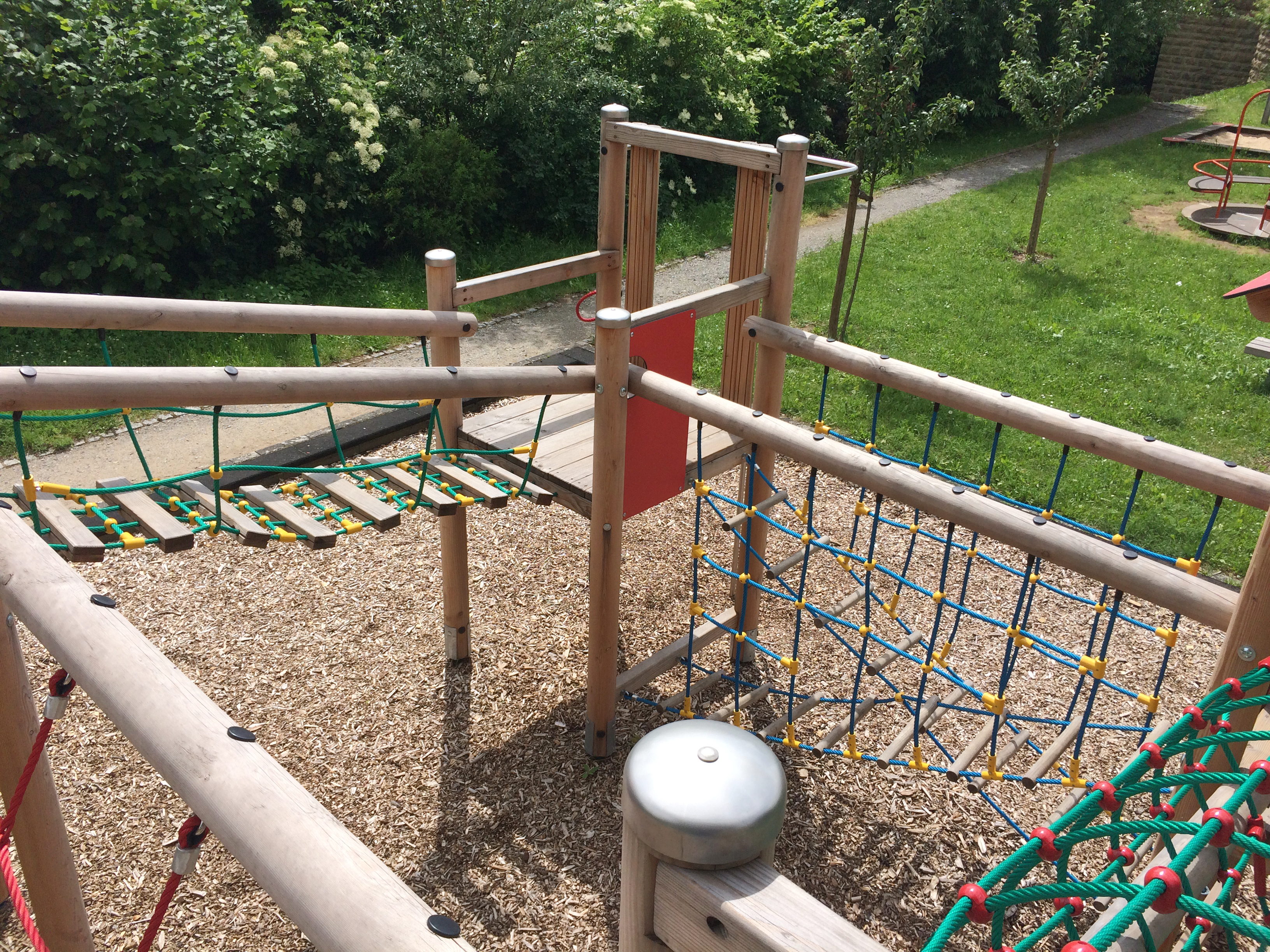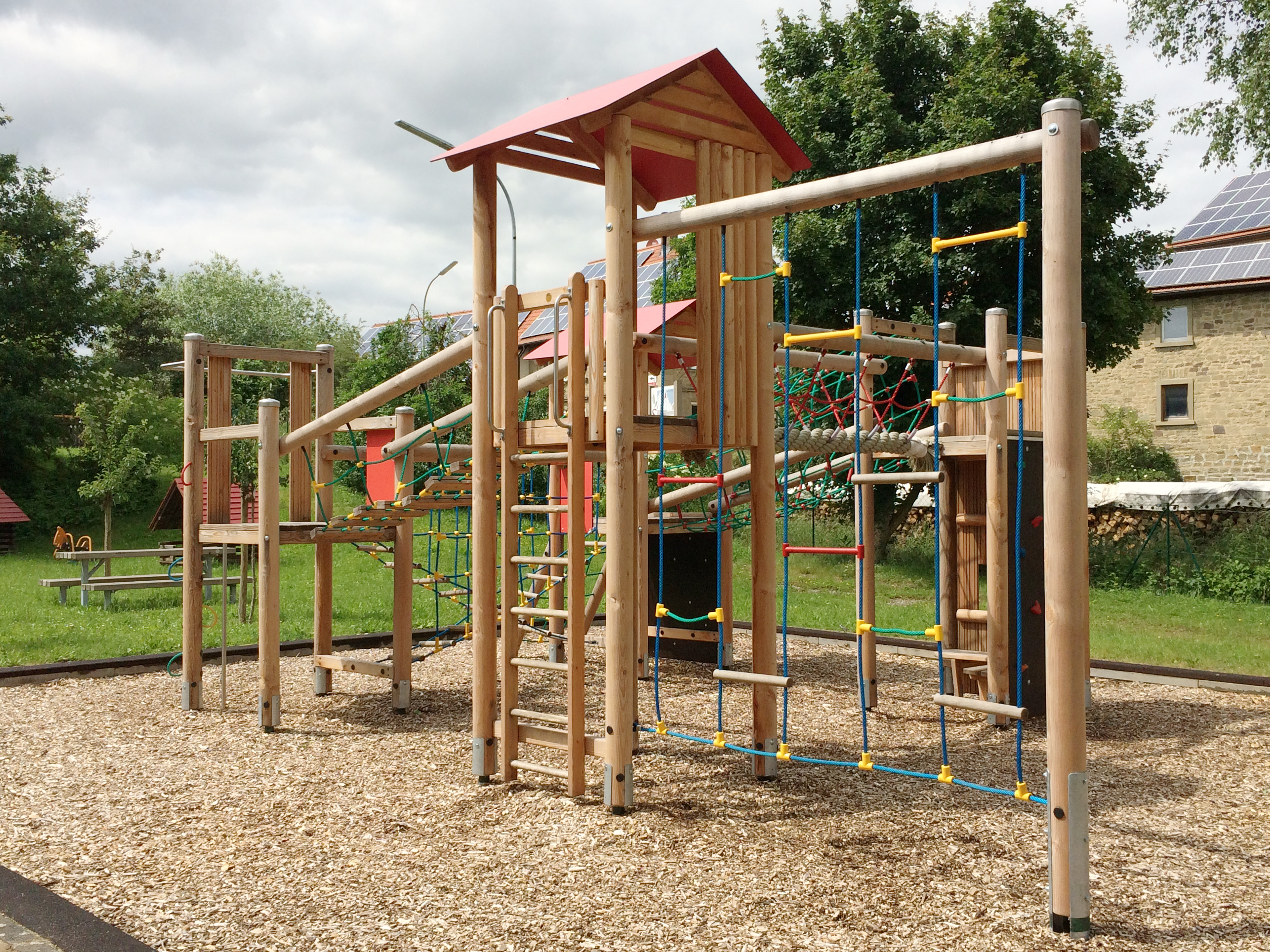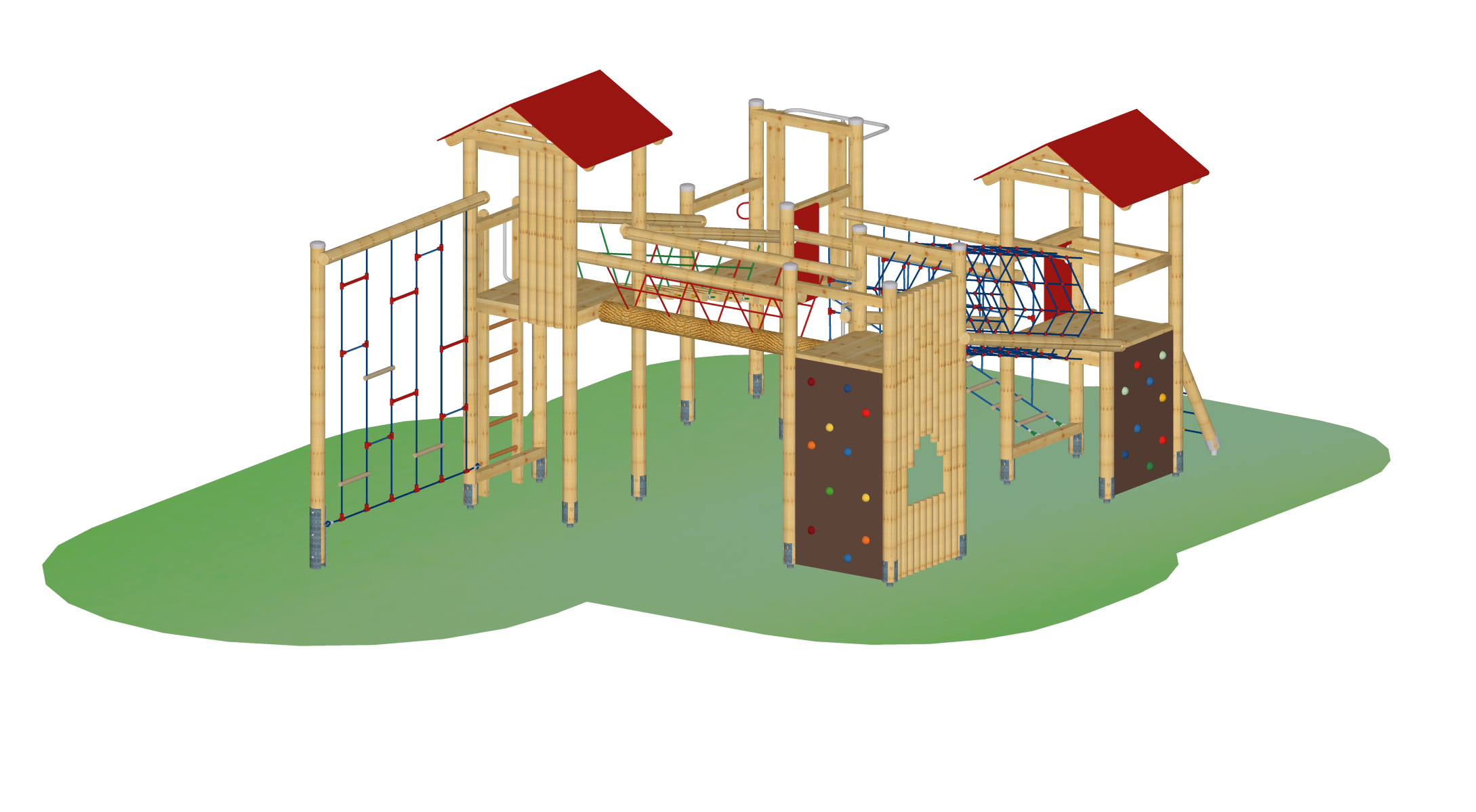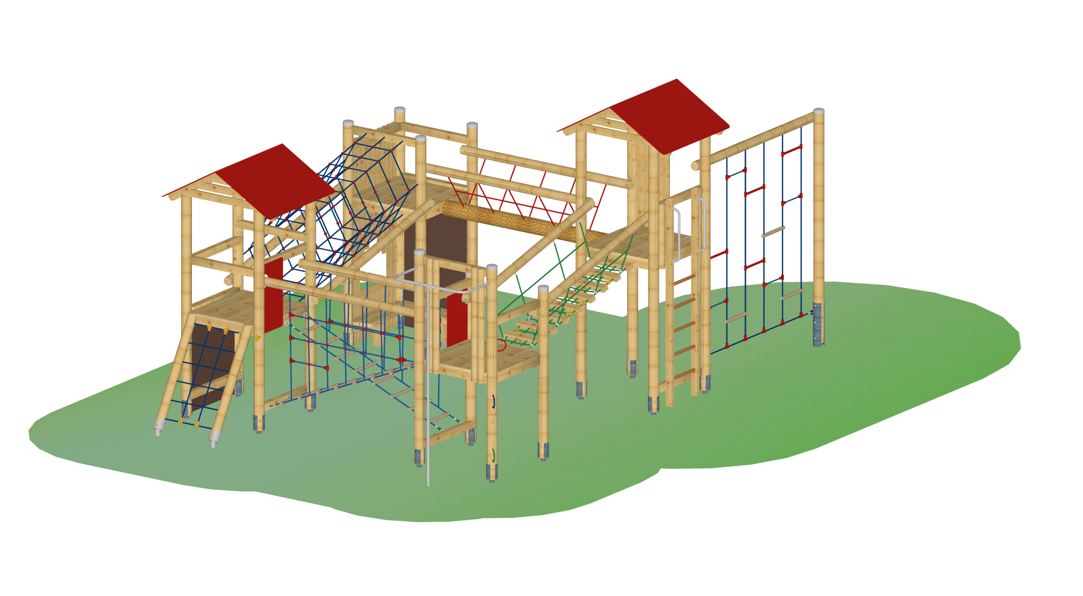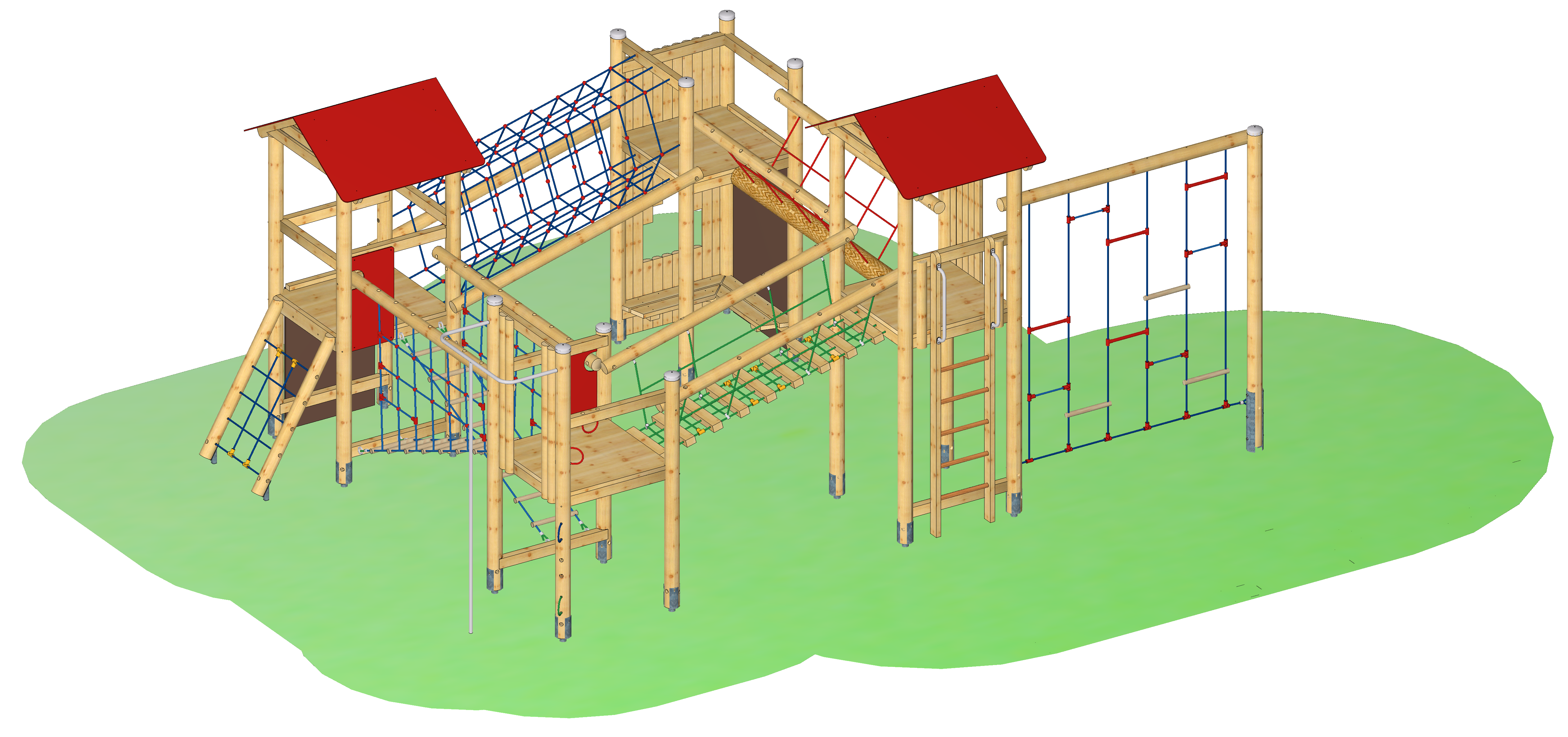 Spielkombination aus 2 Vierecktürmen mit Satteldach und 2 Viereckpodesten. Verbindungsbrücken als Tibetbrücke, Seilhängebrücke, Leiterbrücke, Netztunnel.