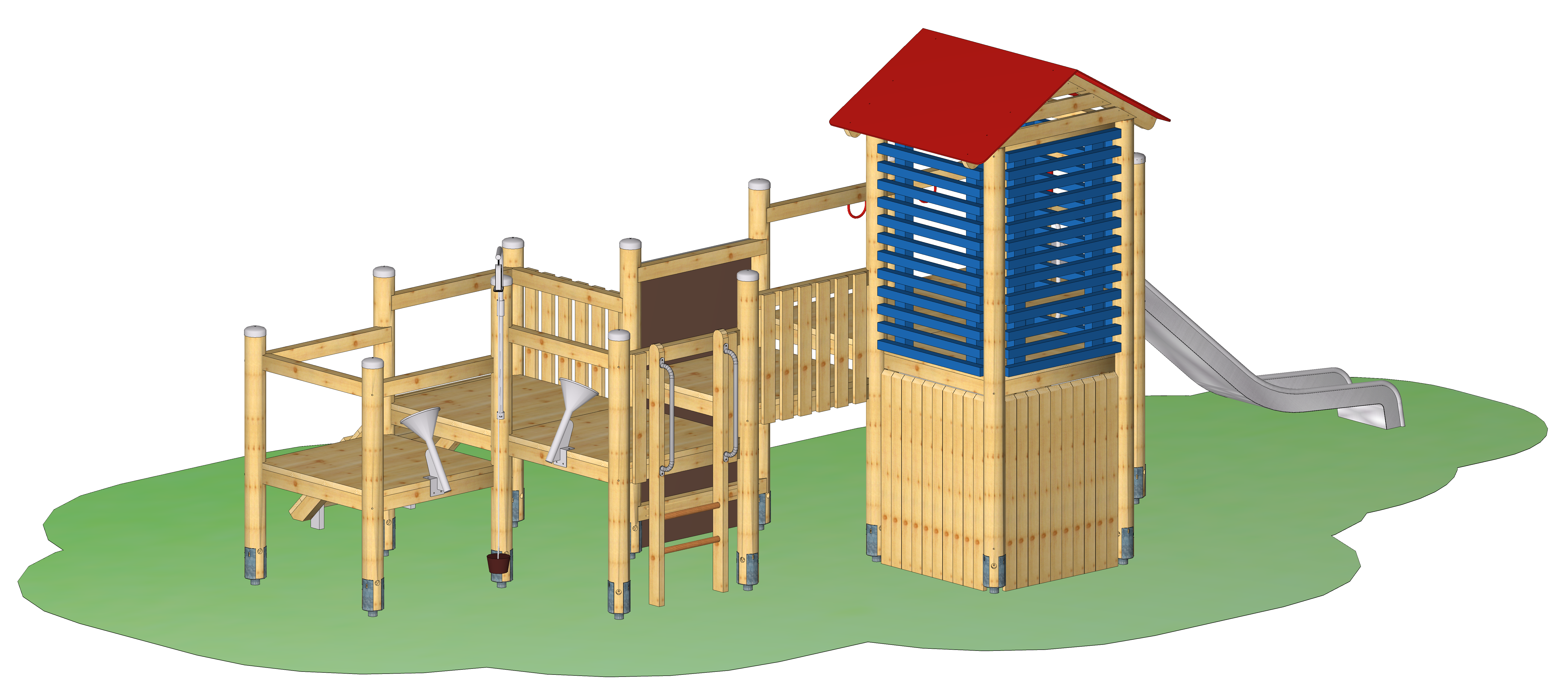Spielkombination (System 110) mit Bereichen für Sandspiel, Rollenspiel, Bewegungsspiel und einem Kletterangebot. Das Sandspiel befindet sich an Podesten mit den Höhen 80 und 100 cm, jeweils mit einer Sandschütte (Trichter und Rohr, Edelstahl) und einem drehbaren Sandkran an einem Standpfosten. Das Rollenspiel kann auf 2 Ebenen stattfinden: Oben im Pfahlhaus mit einer Eckbank, unten mit einer Spielstube mit einer Eckbank und einem kleinen Tisch. Auf der Ebene 140 cm ist eine Rutsche (Edelstahl) angebunden. Die Spielebenen sind über eine Senkrechtleiter am Rutschenpodest, eine Senkrechtleiter im Sandspielbereich, eine Schräge Ebene und eine Free-Climbing-Wand erreichbar.