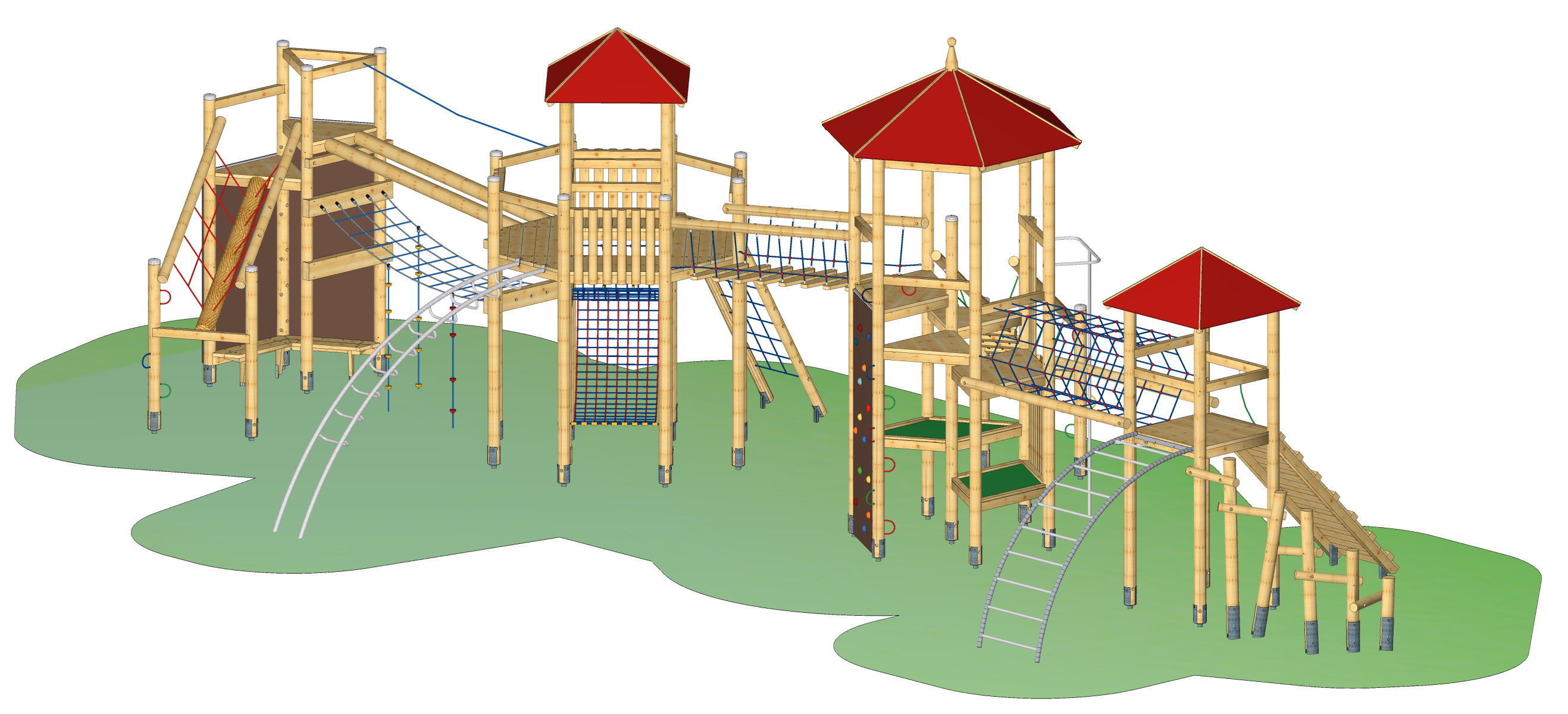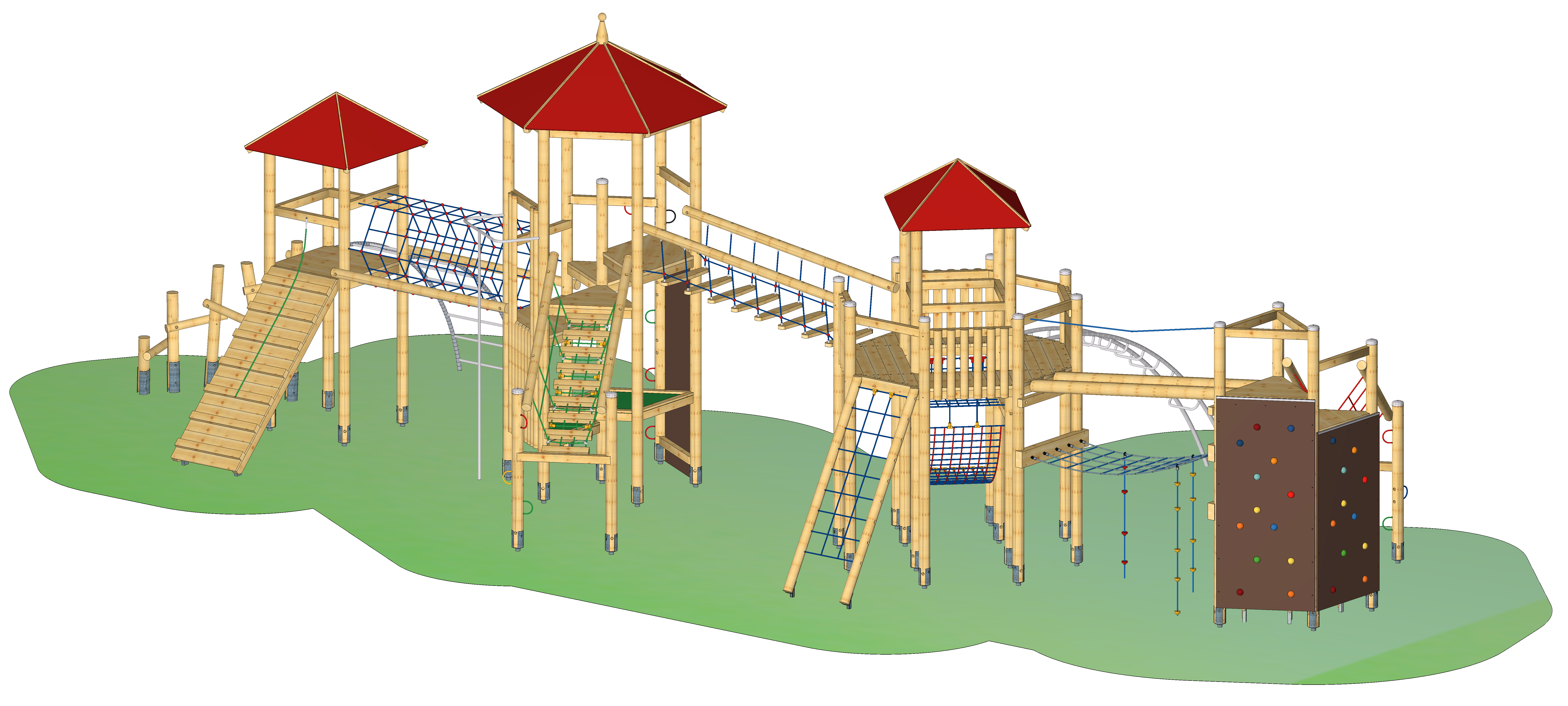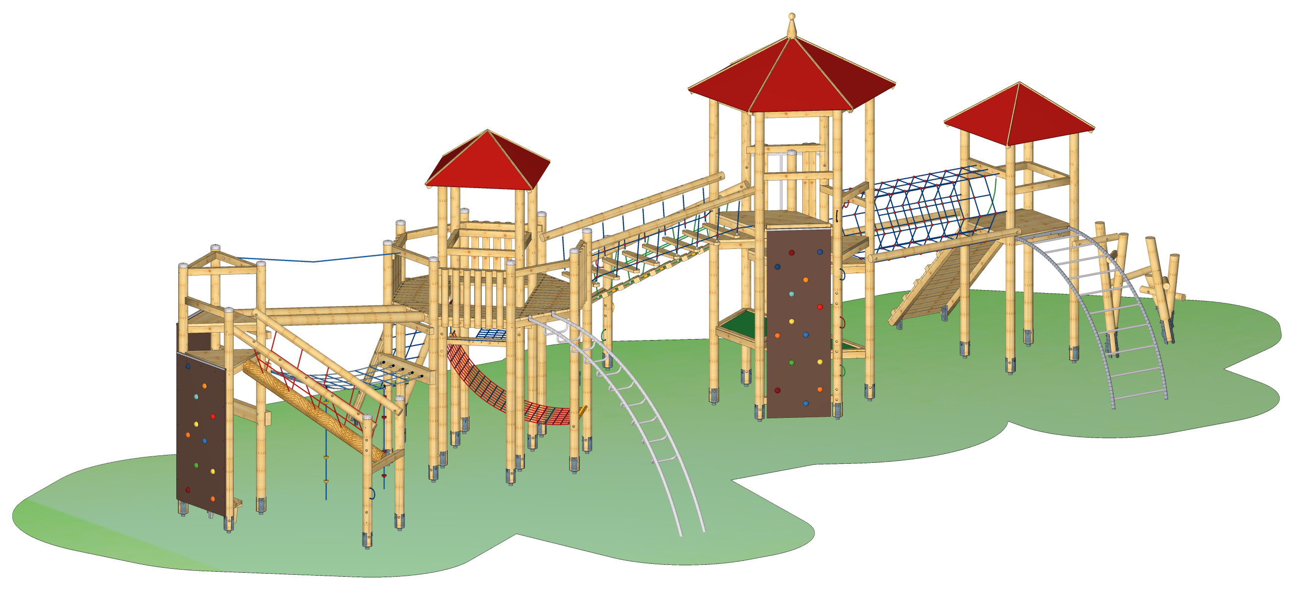 Spielkombination mit einem Achteckpodest, eingebautem Viereckturm mit Satteldach. Schwebebrücke zu einem Sechseckturm mit Trapezpodesten. Netztunnel zu einem Viereckturm. Balancierbrücke zu einem Dreieckpodest.