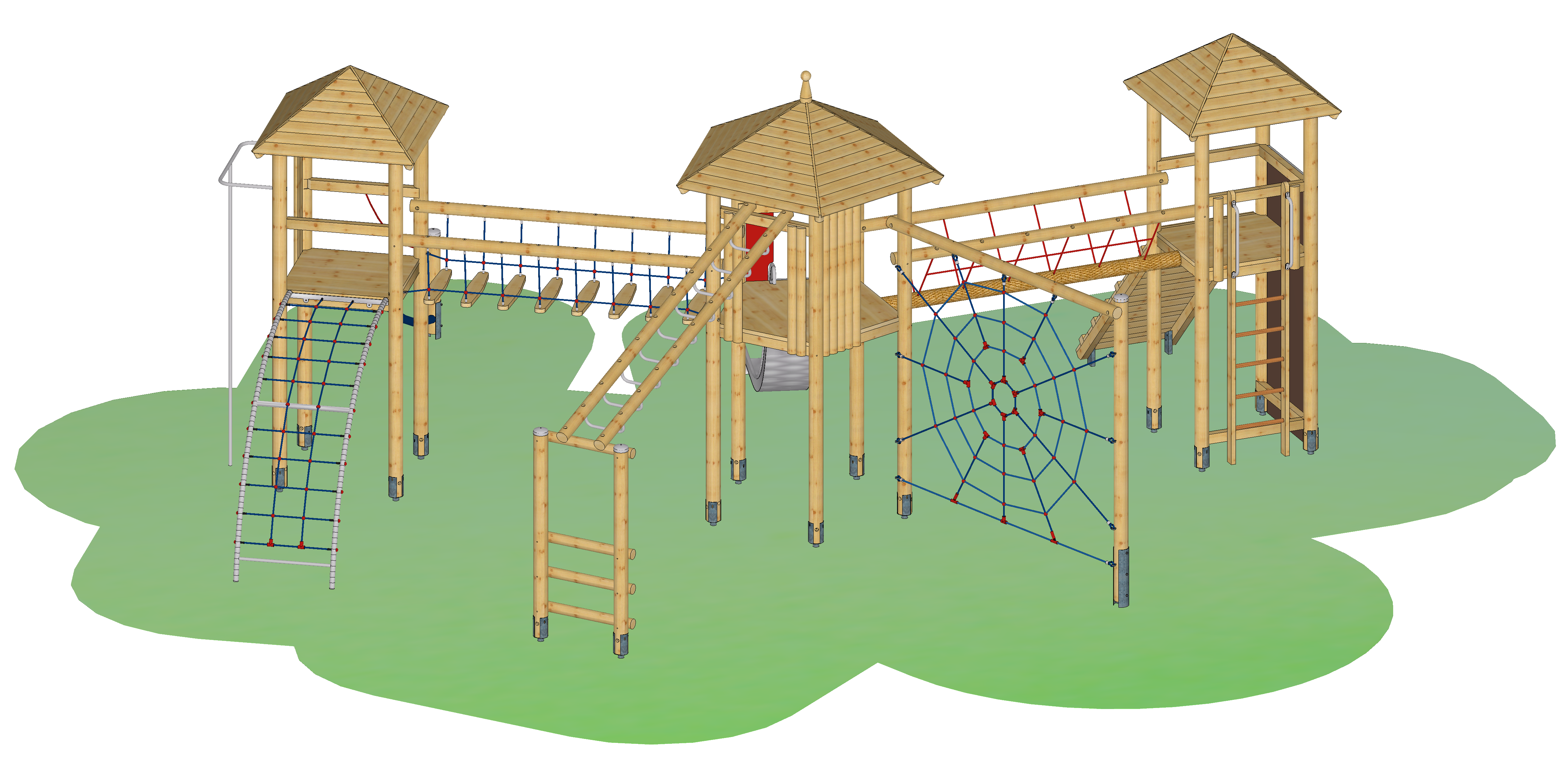 Spielkombination (System 110) mit Türmen und Verbindungsbrücken auf 2,00 m Höhe. Die Spielangebote enthalten Balancieren, Klettern, Steigen, Rutschen, Erreichen von hohen Elementen (Spinnennetzwand Oberkante H= 3,00 m). Die Free-Climbing-Wand hat eine Gesamthöhe von 2,70 m. Die Brücken führen jeweils von einem der Vierecktürme zum Fünfeckturm in der Mitte der Spielkombination. Die Schwebebrücke besteht aus einzeln an Seilen aufgehängten Trittbtrettern. Die Tibetbrücke ist ein ca. 16 cm starkes Tau (Polypropylen), das in ein Netz eingeflochten ist. Anbaugeräte zum Aufstieg sind eine Schräge Ebene, eine Senkrechtleiter, ein Bogennetzaufstieg und ein Balancierschlauch. Der Hangelsteg mit Griffen aus Edelstahl kann vom Turm aus zum Herunterhangeln benutzt werden, aber auch von unten als besonders anspruchsvolle Aufstiegsmöglichkeit. Angebote zum Klettern sind die Spinnennetzwand und die Free-Climbing-Wand. Die Spinnennetzwand ermöglicht bei einer Gesamthöhe 3 Metern eine besondere Höhenerfahrung an der Spielkombination. Zum Verlassen der Spielkombination von einem Turm aus können die Rutschstange und die Rutsche, in einer besonderen Ausführung als Abenteuerrutsche, genutzt werden. Die Abenteuerrutsche hat einen steilen Rutschenanfang und einen langen flachen Rutschenauslauf.