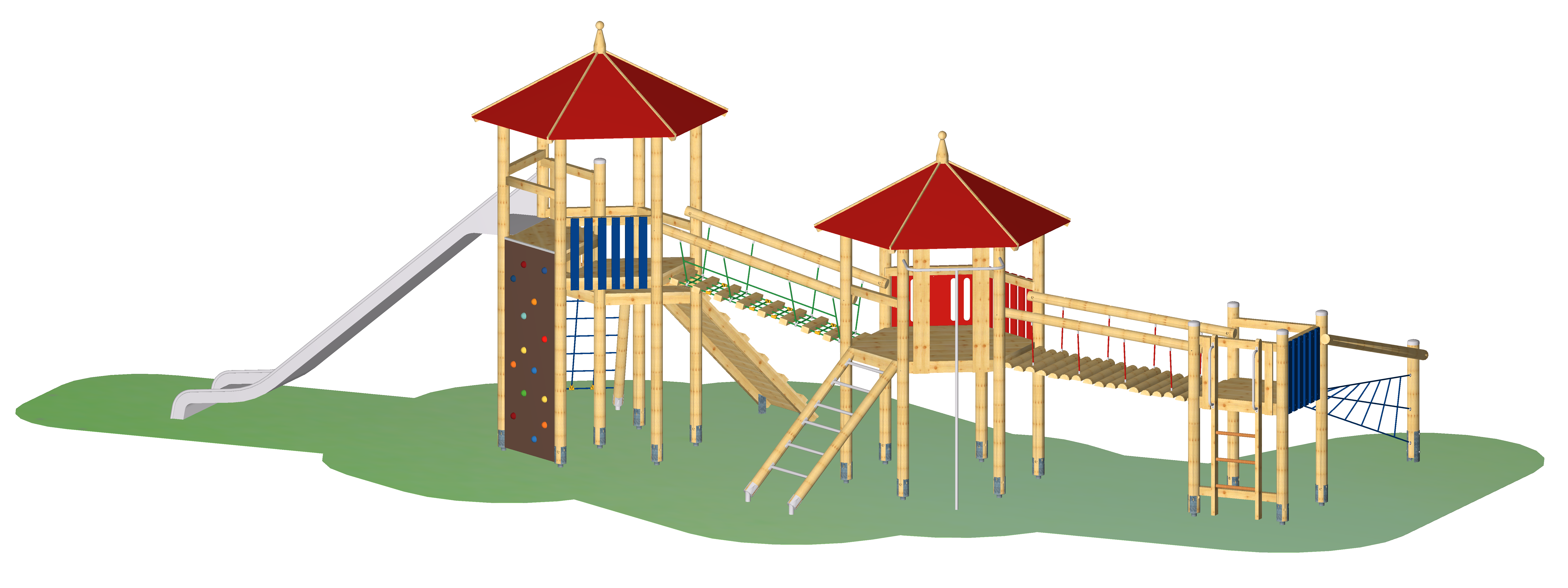 Spielkombination aus 2 Sechsecktürmen und 1 Viereckpodest, verbunden mit einer Seilhängebrücke und einer Wackelbrücke. Ein Sechseckturm mit abgestuften Trapezpodesten und einer Anbau-Breitrutsche (110 cm breit) auf Podesthöhe 250 cm.
