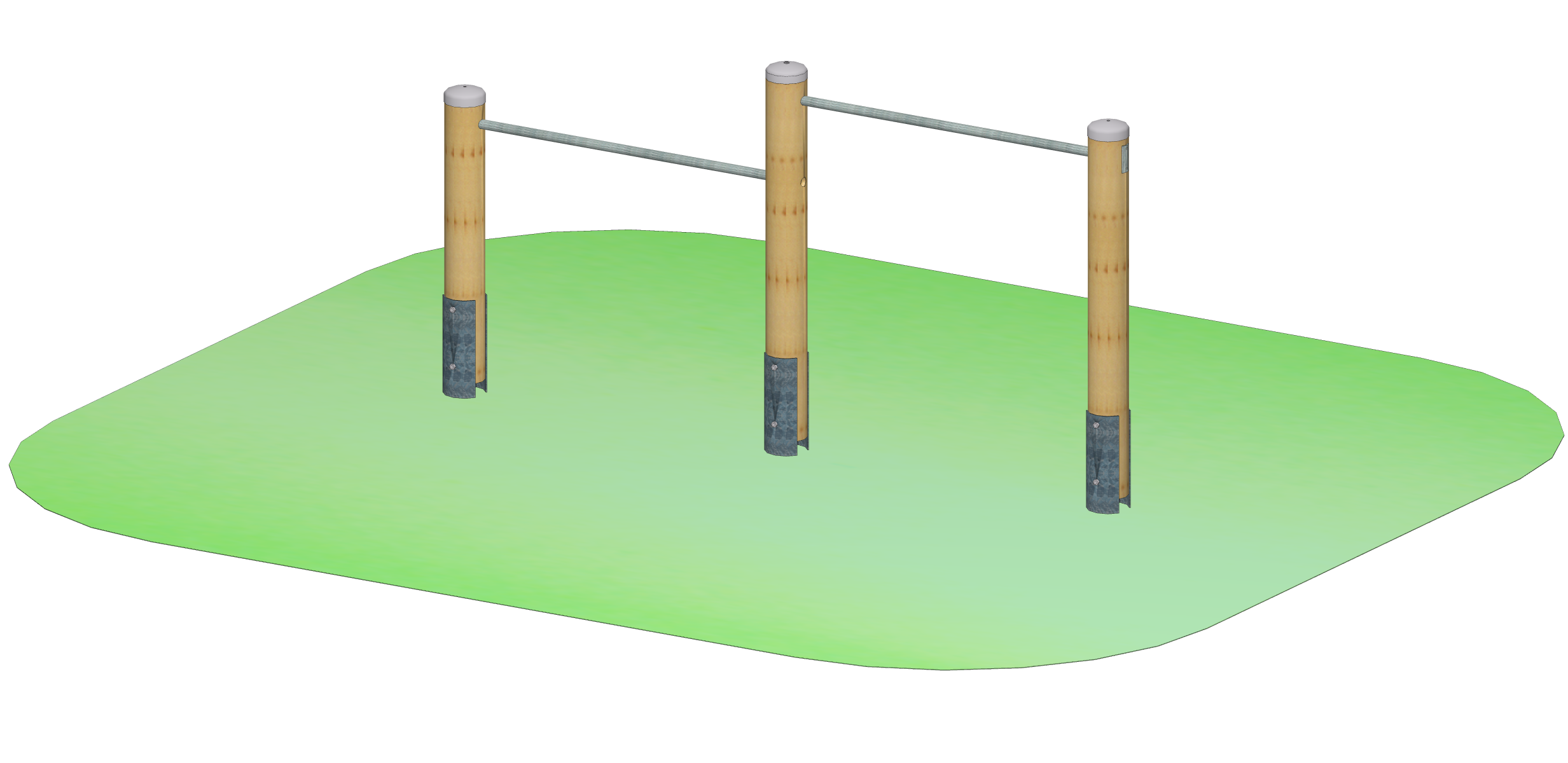 Bestehend aus zwei Reckstangen aus Edelstahl, drei Standpfosten mit Abdeckkappen und Pfostenschuhen. Die Höhen auf denen die Reckstangen angebracht sind, sind 1,00 und 1,30 m.