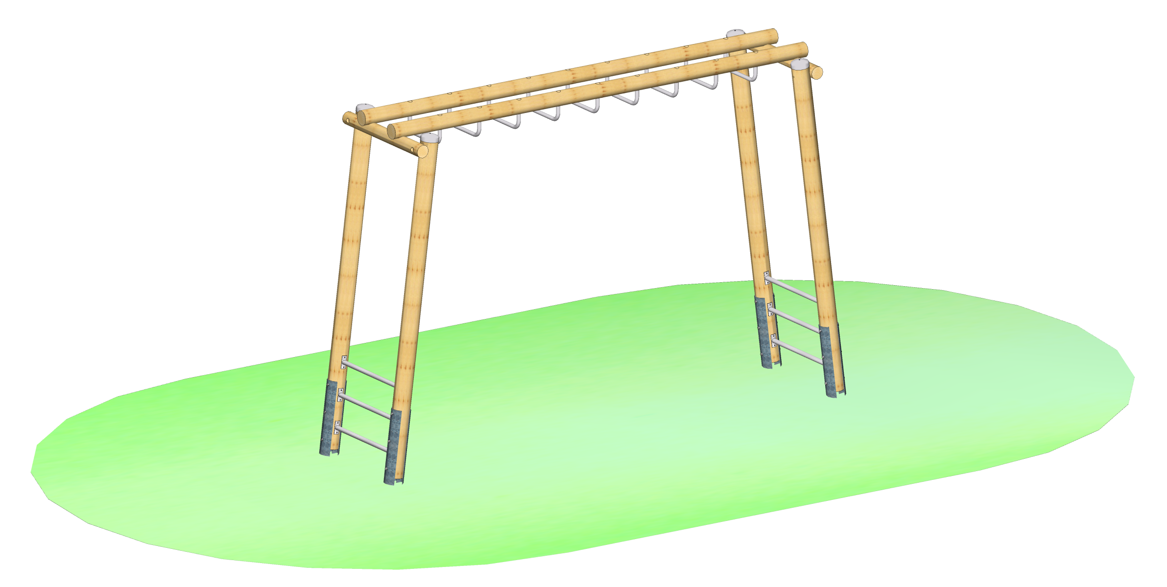 Bestehend aus vier Standpfosten, zwei Querbalken und zwei Hangelbalken. An dem Hangelbalken sind neun Haltegriffe aus Edelstahl befestigt. Die sechs Aussteifungen sind zugleich auch eine Aufstiegsmöglichkeit um an die Haltegriffe zu kommen. Die Standpfosten sind mit Abdeckkappen und Pfostenschuhen versehen.