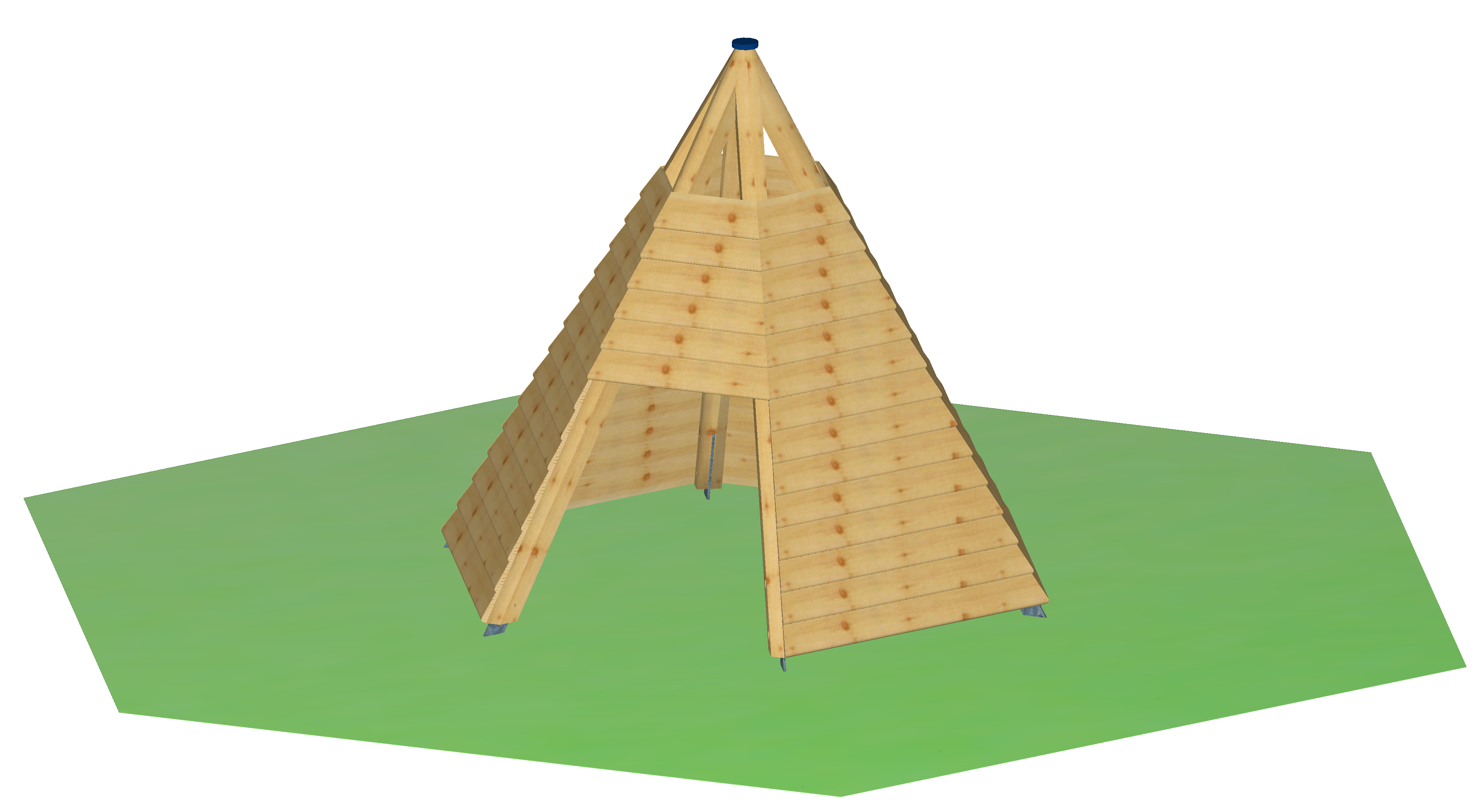 Spielhaus in Form eines Indianertipis mit ca. 250 cm Durchmesser. Die Verkleidung des Tipis besteht aus Stülpschalung.