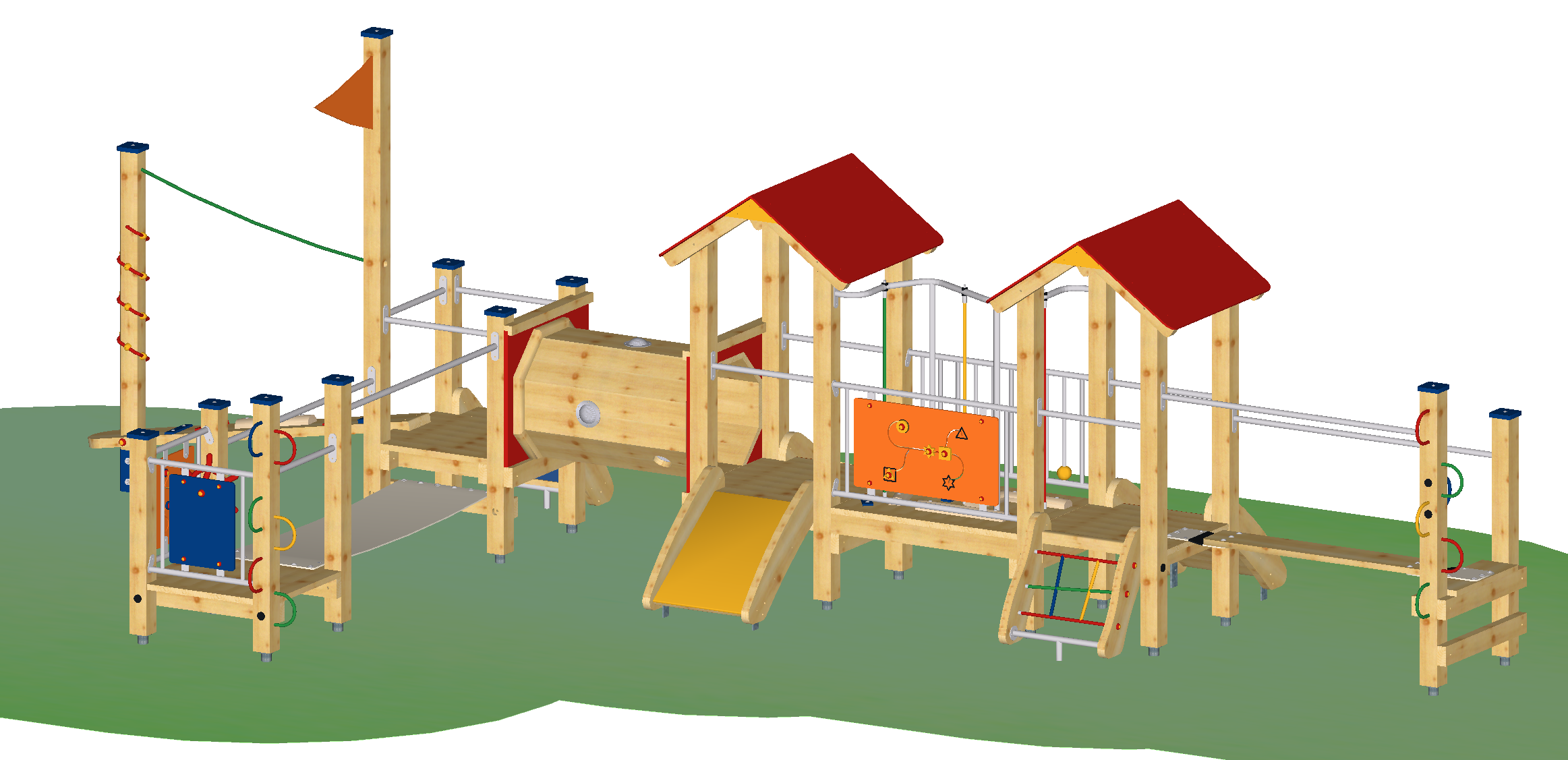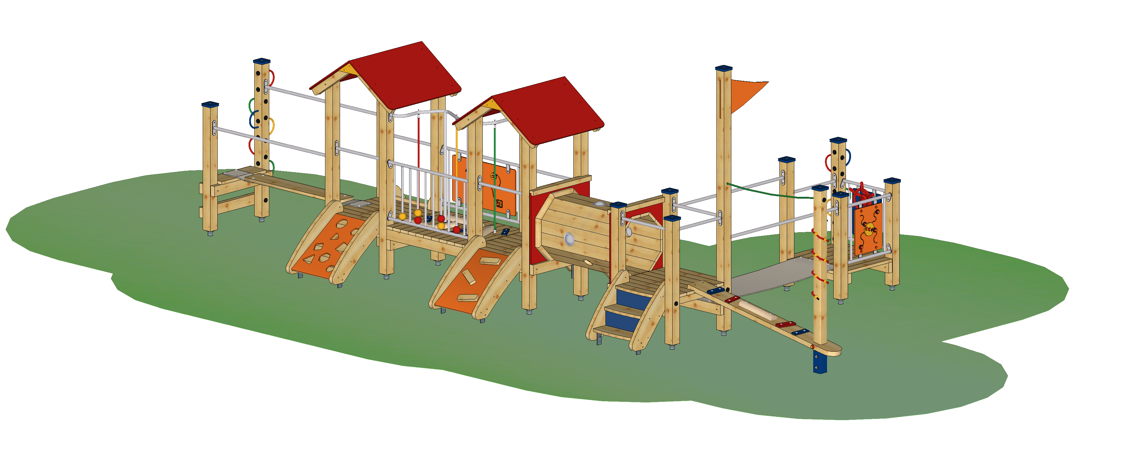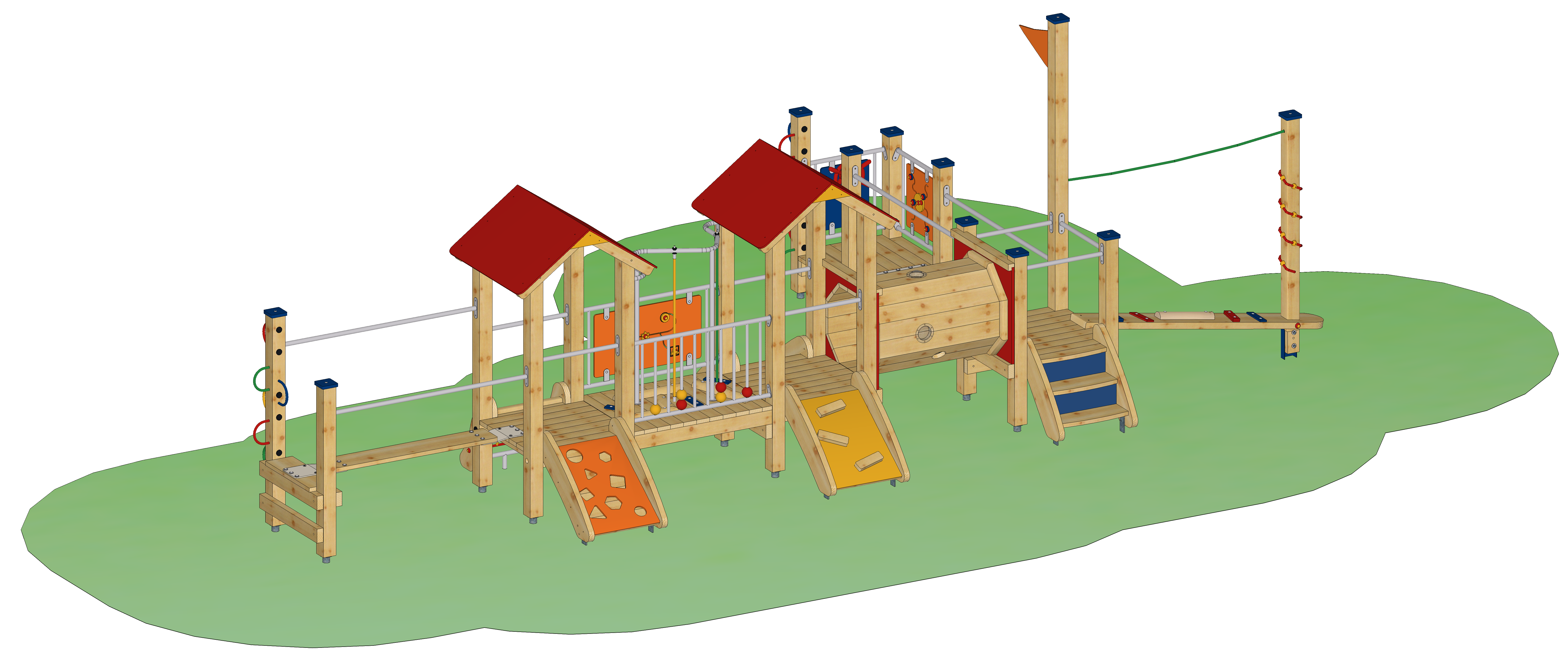 1 x Geo-Aufstieg, 1 x Rutschbrett, 1 x Netzaufstieg,1 x Treppe,1 x Kletteraufstieg.