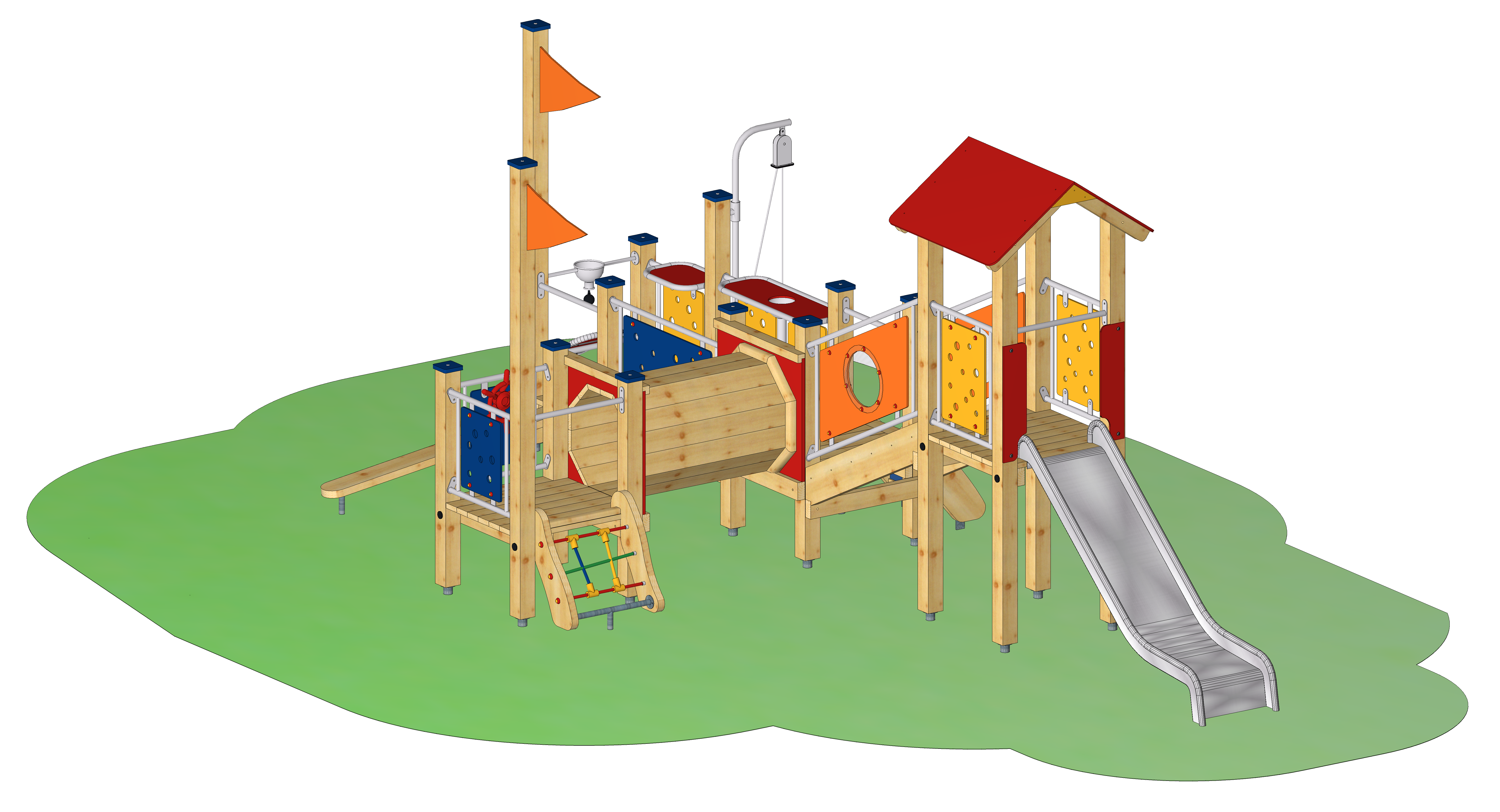 Als Hersteller liefern wir die Spielanlage in vormontierten Modulen.