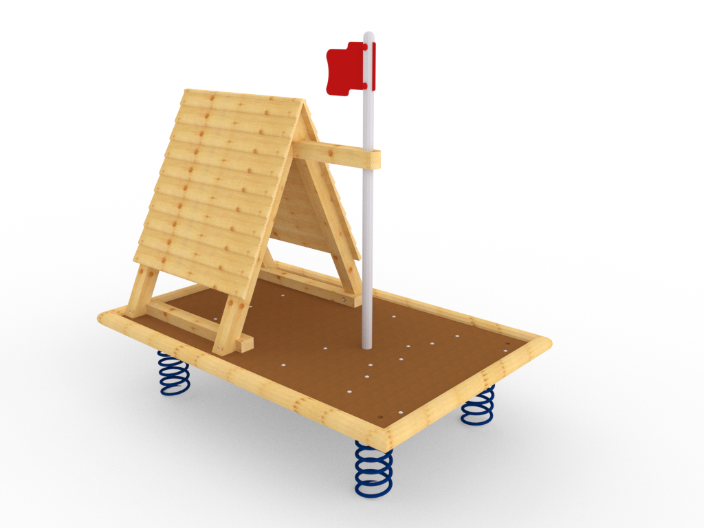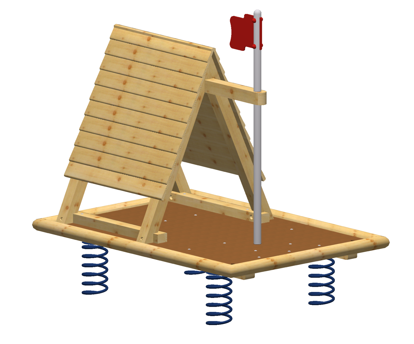 Federfloß mit Haus und Fahnenmanst. Haus und Rahmen aus Holz, Boden aus Siebdruckplatte. Fahnenmast aus Edelstahl. Gelagert auf 4 Federn (Materialstärke 20 mm)