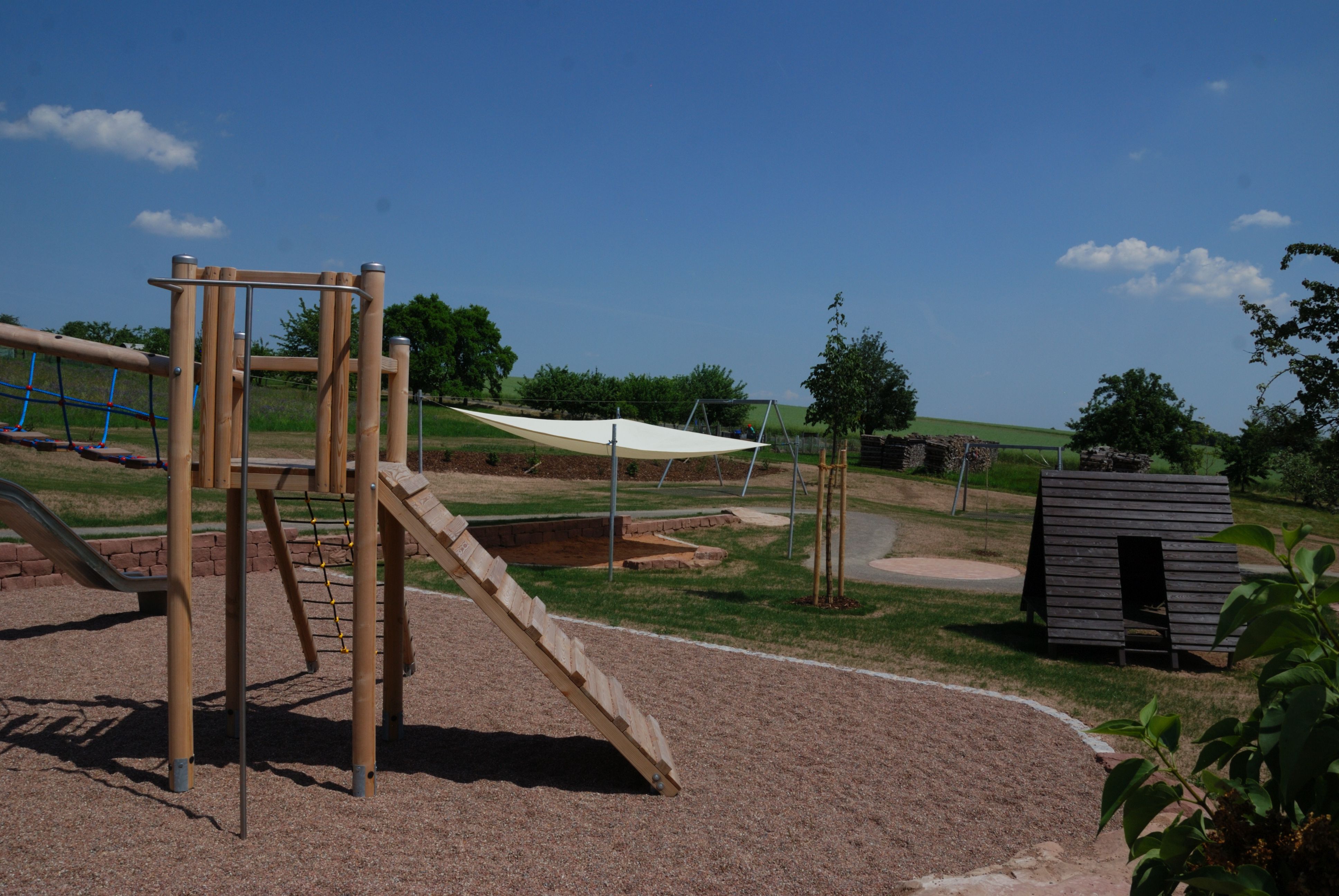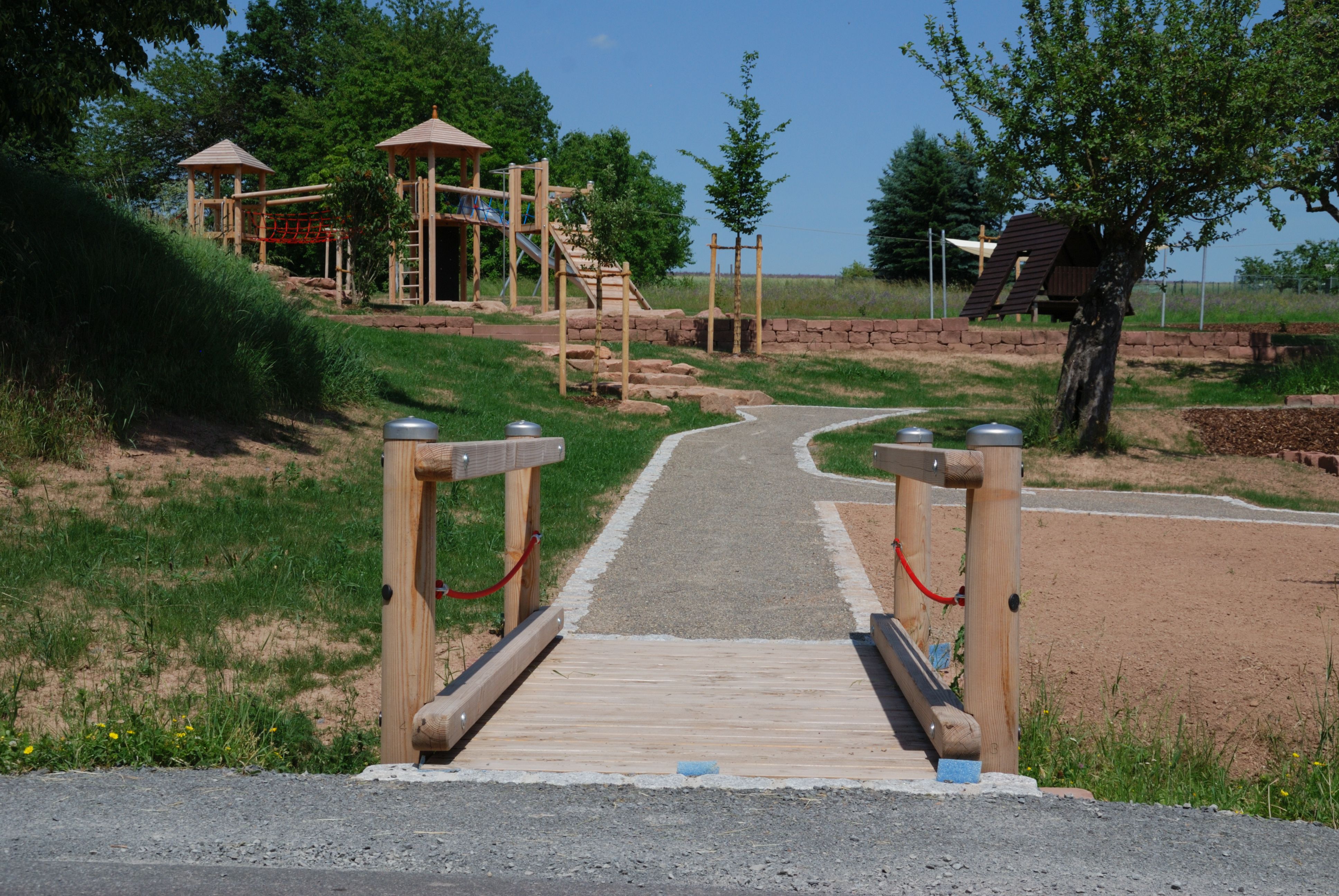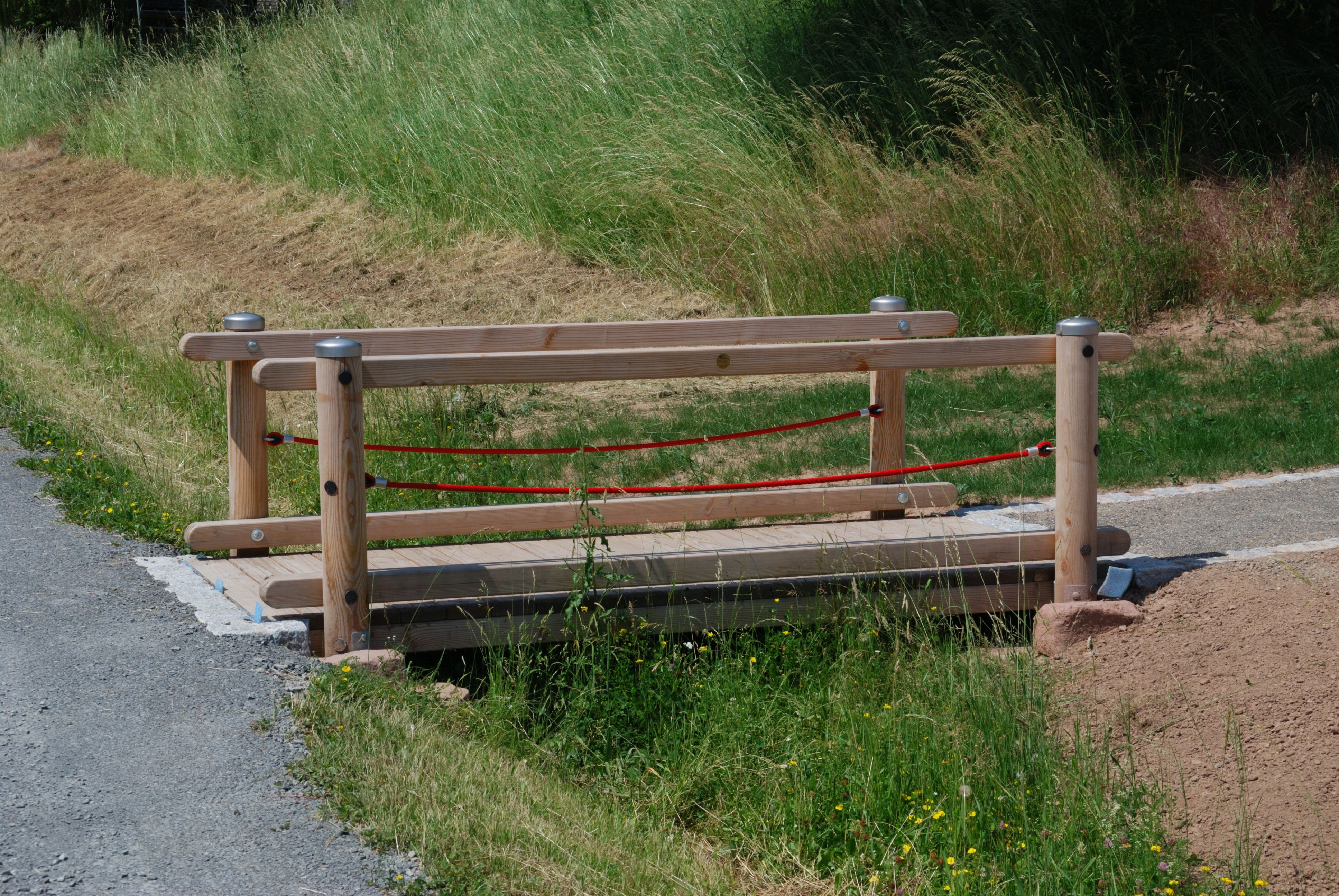 Seilbahn für Spielplätze: Konstruktion aus Stahl, feuerverzinkt.Zum Einsatz in fallendem Gelände. In ebenen Bereichen ist ein Starthügel nötig. Fahrlänge bis 40 m möglich. Anlage mit statischem Nachweis nach DIN EN 1176-4Entwicklung, Design und Konstruktion:Th. Markert und I. Svoboda (S.H. Spessart Holzgeräte GmbH)Statische Berechnung: Büro Dr. Anvikar, WürzburgKonstruktion:Stahlständer aus Rundrohr 82,5 x 3,2 mm, Querträger aus Quadratrohr140 x 140 x 5 mm, Stahlseil als Litzen-Spiralseil, 10 mm Durchmesser.Anschlag am Startbock: Anschlagdämpfer aus EPDMAnschlag am Zielbock: BremsfederSeilbahnbetrieb:Unsere Seilbahn ist ein attraktives und gut funktionierendes Spielgerät mit erfahrungsgemäß hoher Spielfrequenz. Laut DIN EN 1176 ist die Höchstgeschwindigkeit der Seilbahn auf 7m/s begrenzt. Deshalb bitten wir, unsere Angaben in unserer Montage-Anleitung zu beachten. Montagehinweise:Das Gelände ist so zu gestalten, dass der Abstand zwischen Seilbahnsitz und Boden, unter Belastung (69,5 kg nach DIN EN 1176-4) an keiner Stelle weniger als 350 mm beträgt. Um eine geeignete Fahrgeschwindigkeit von höchstens 7 m/s zu erreichen, empfehlen wir nach Tabelle (unten) folgende Werte: Länge der SeilbahnHöhenunterschied der Stahlständer20 m80 cm30 m130 - 150 cm40 m190 - 210 cmLieferumfangStart- und Zielstation aus feuerverzinktem Stahldrehungsarmes, flexibles, viellitziges StahlseilLaufkatze mit EdelstahlgehäusePendelsitz mit schlauchüberzogener Kette aufgehängt, Sitz aus Gummi mit Stahleinlage, prallgedämpfte KanteEinmann-Spannvorrichtung an derStartstation, Seilschloßbefestigung an der ZielstationSicherheitsdrahtseilklemmenSchraubenBremsfeder, Anschlagdämpfer aus EPDMAnleitungen für Montage und Wartung