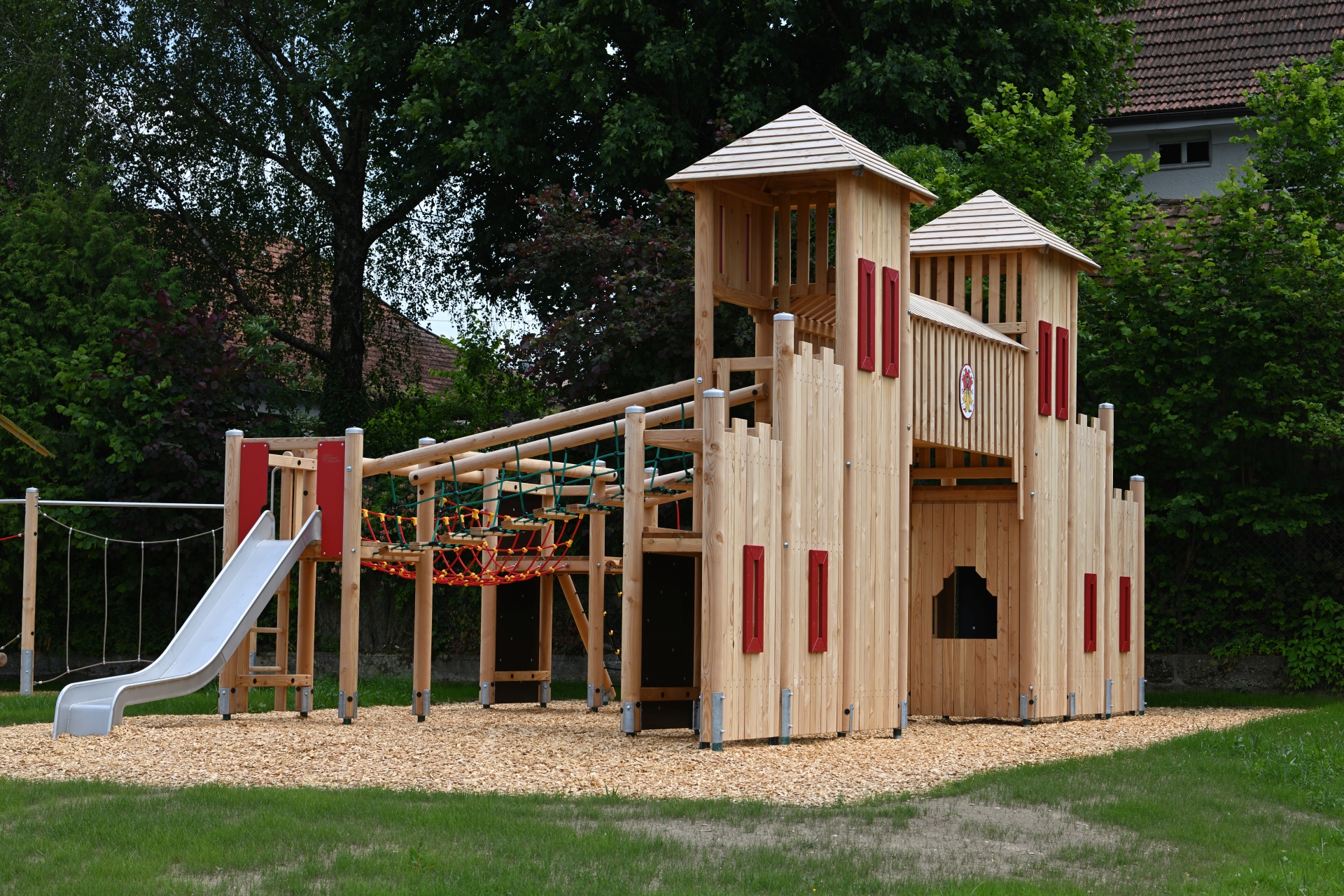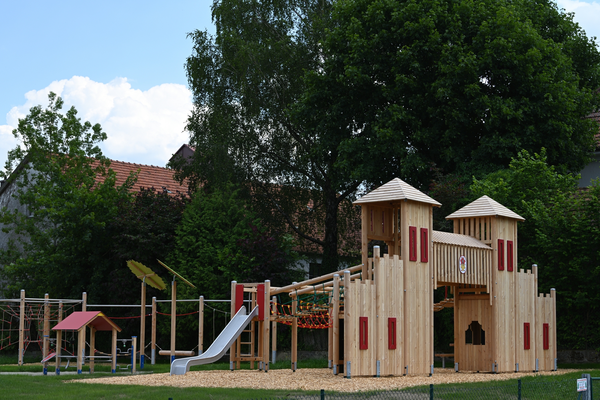 Die spannende Spielburg mit integriertem Wappen ermöglicht dank des Wehrgangs, der Rutsche und der vielseitigen Brücken und Aufstiege eine große Menge an Spiel- und Bewegungsmöglichkeiten. Die Schaukeln, der Seilparcours und die beschattete Sandspielanlage ergänzen das Ensemble zu einem Spielplatz mit hohem Aufforderungscharakter für Kinder von 3-12 Jahren.
