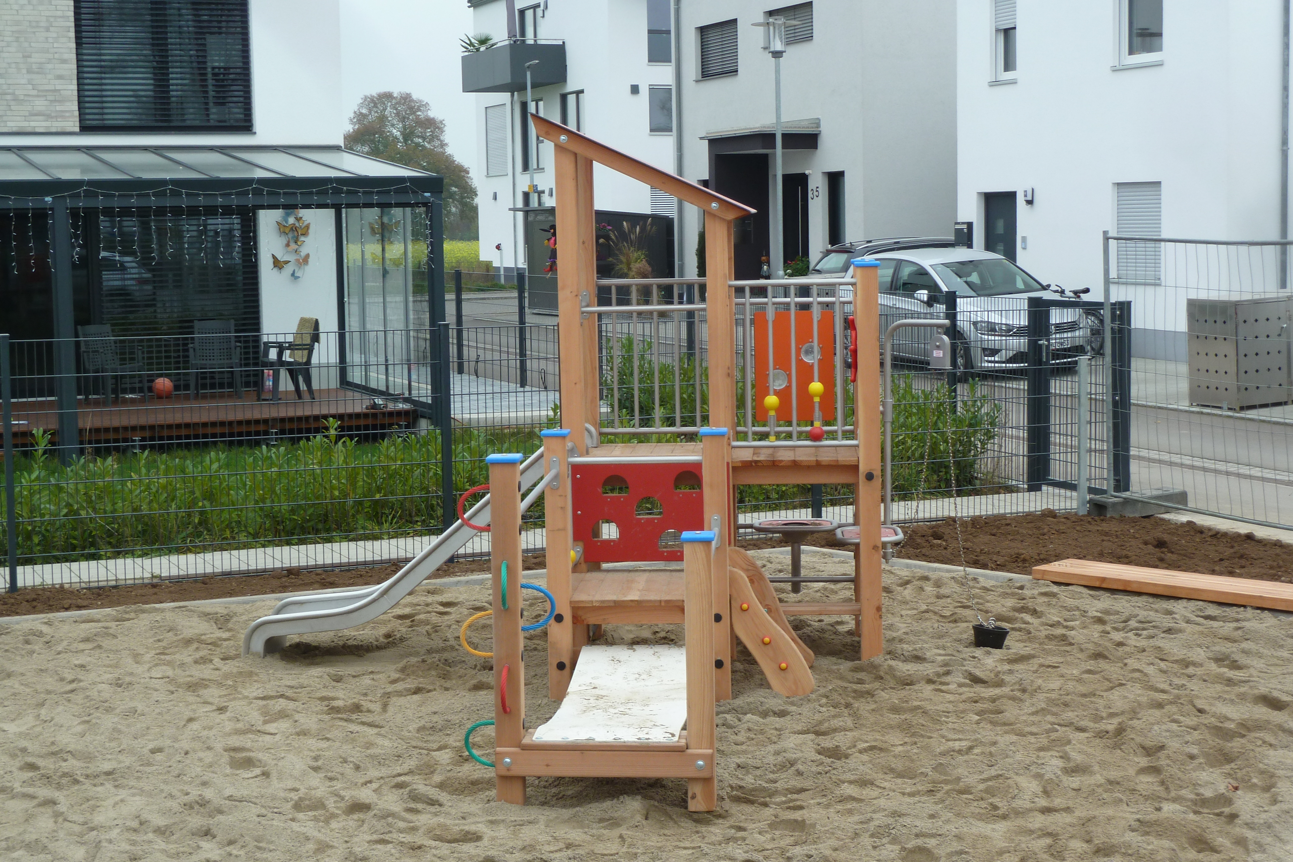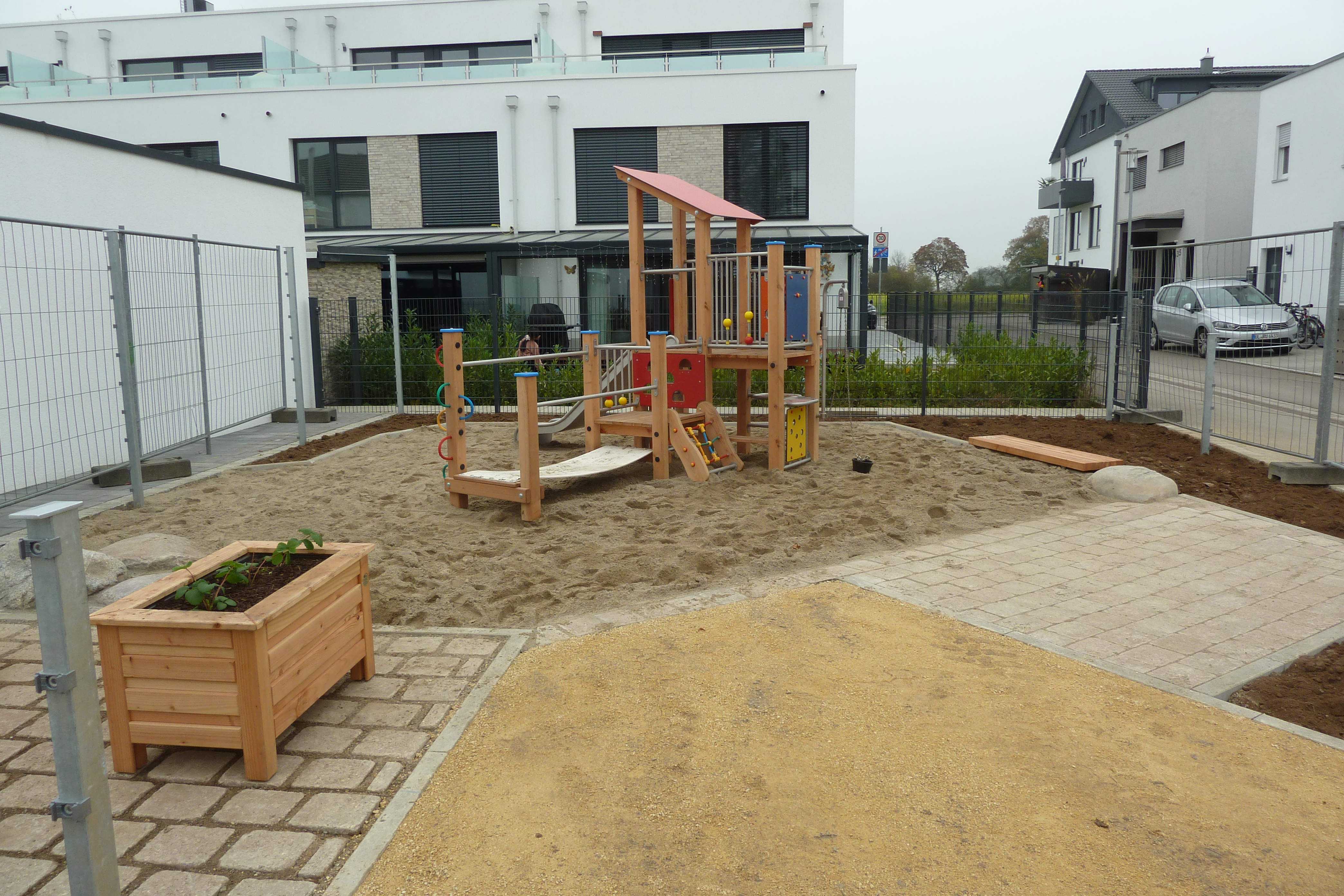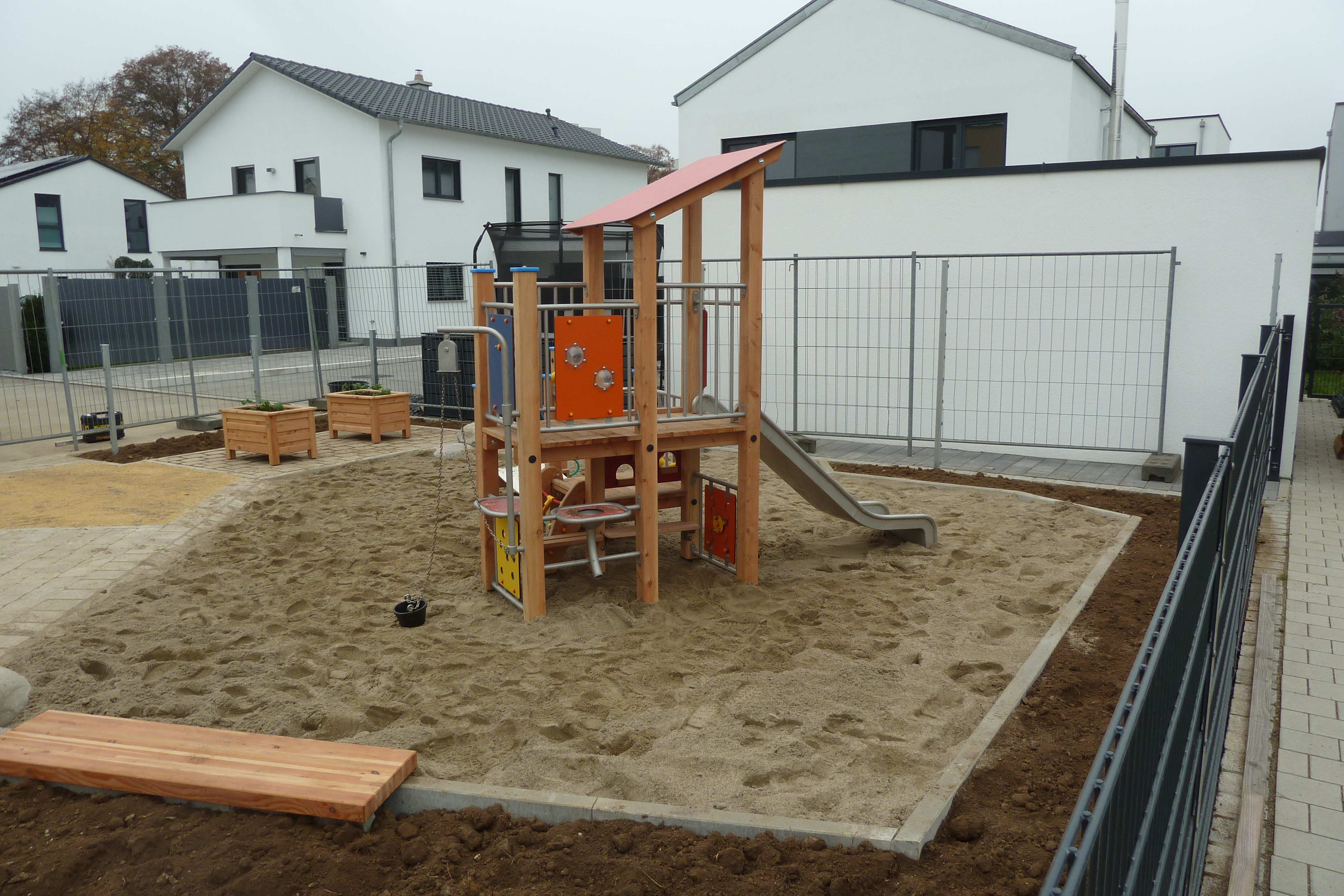 Kindergarten-Hochbeet aus Douglasienholz, 80 x 50 x 50 cm (L/B/H). Einsatz aus Kunststoff mit Bohrungen am Boden gegen Staunässe, verschraubte Kunststoffgleiter an den Füßen. Lieferung komplett vormontiert.