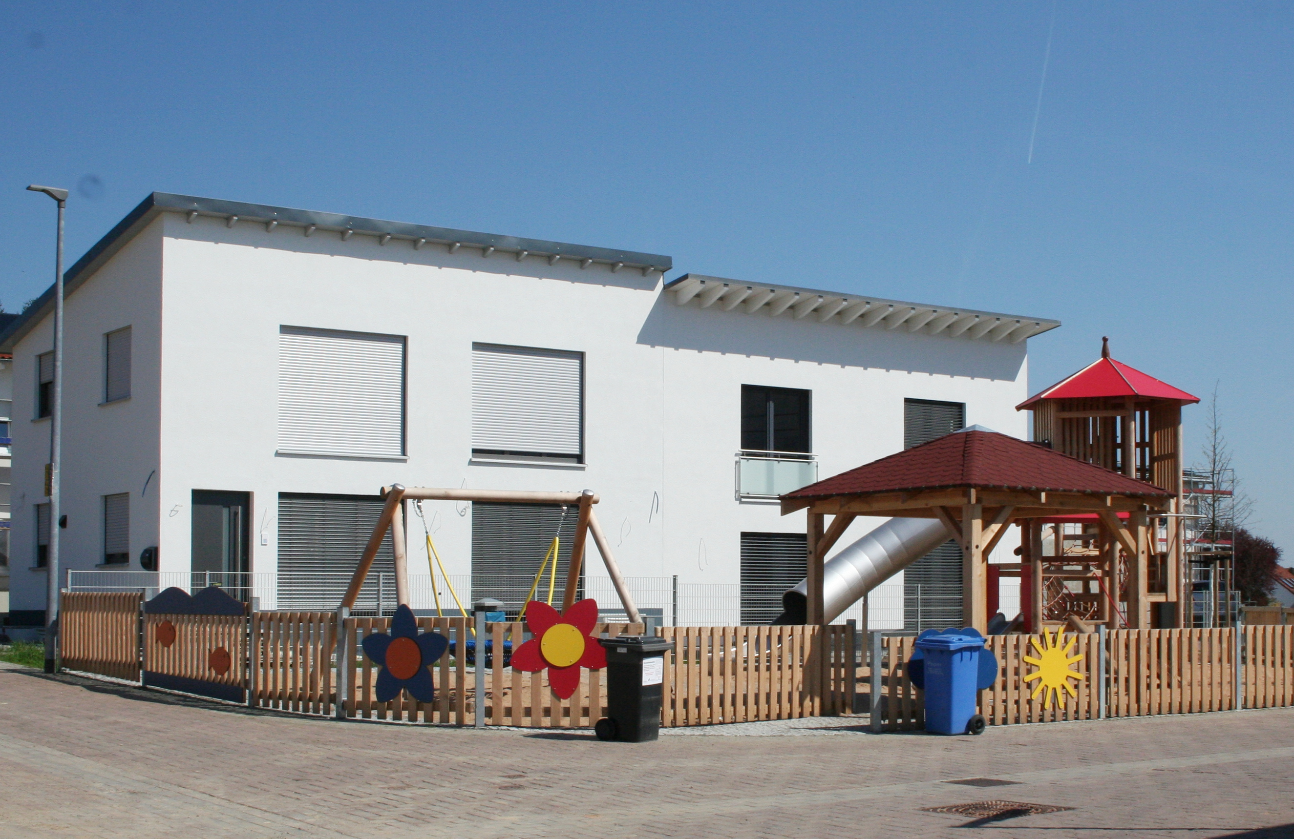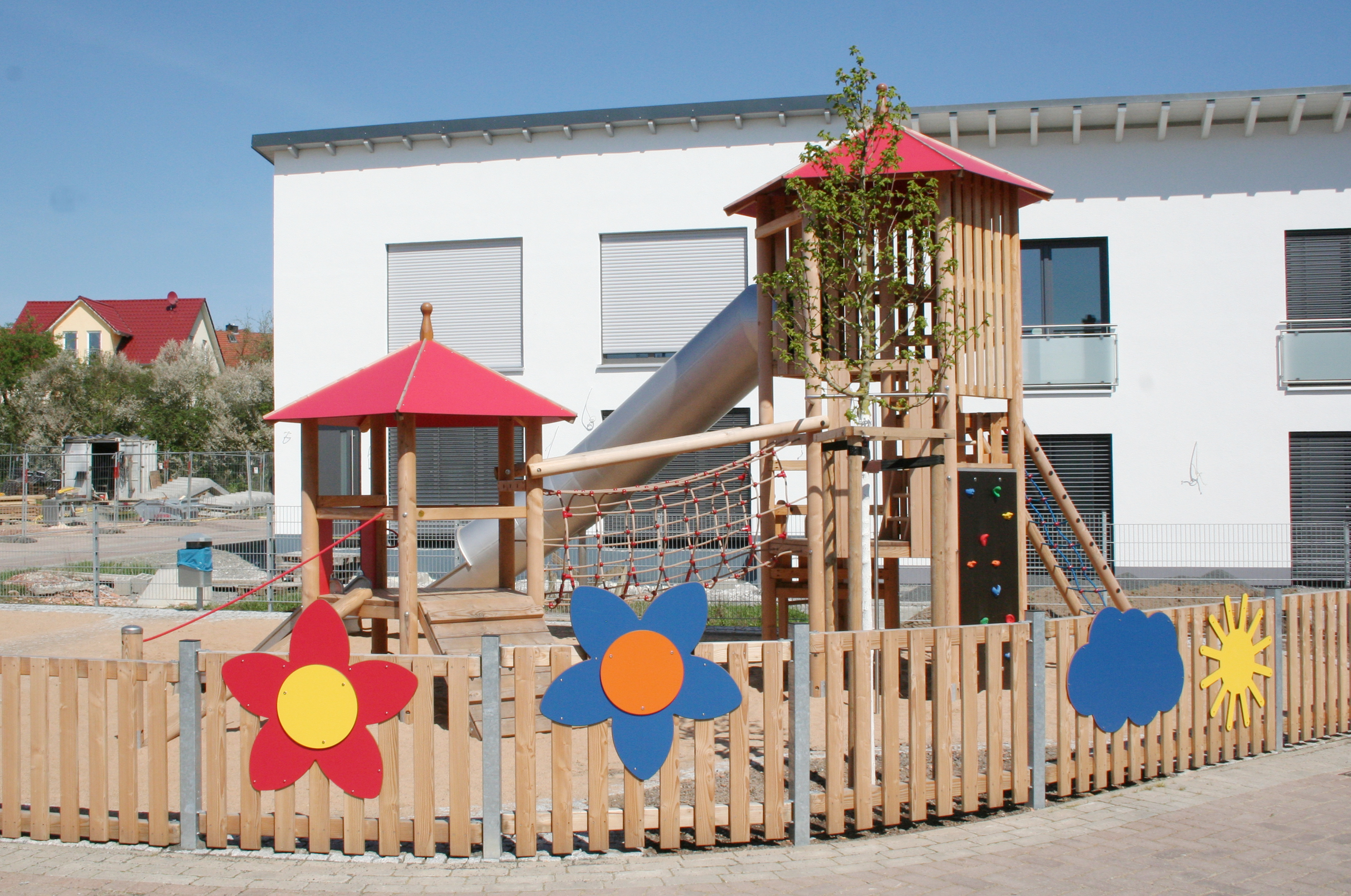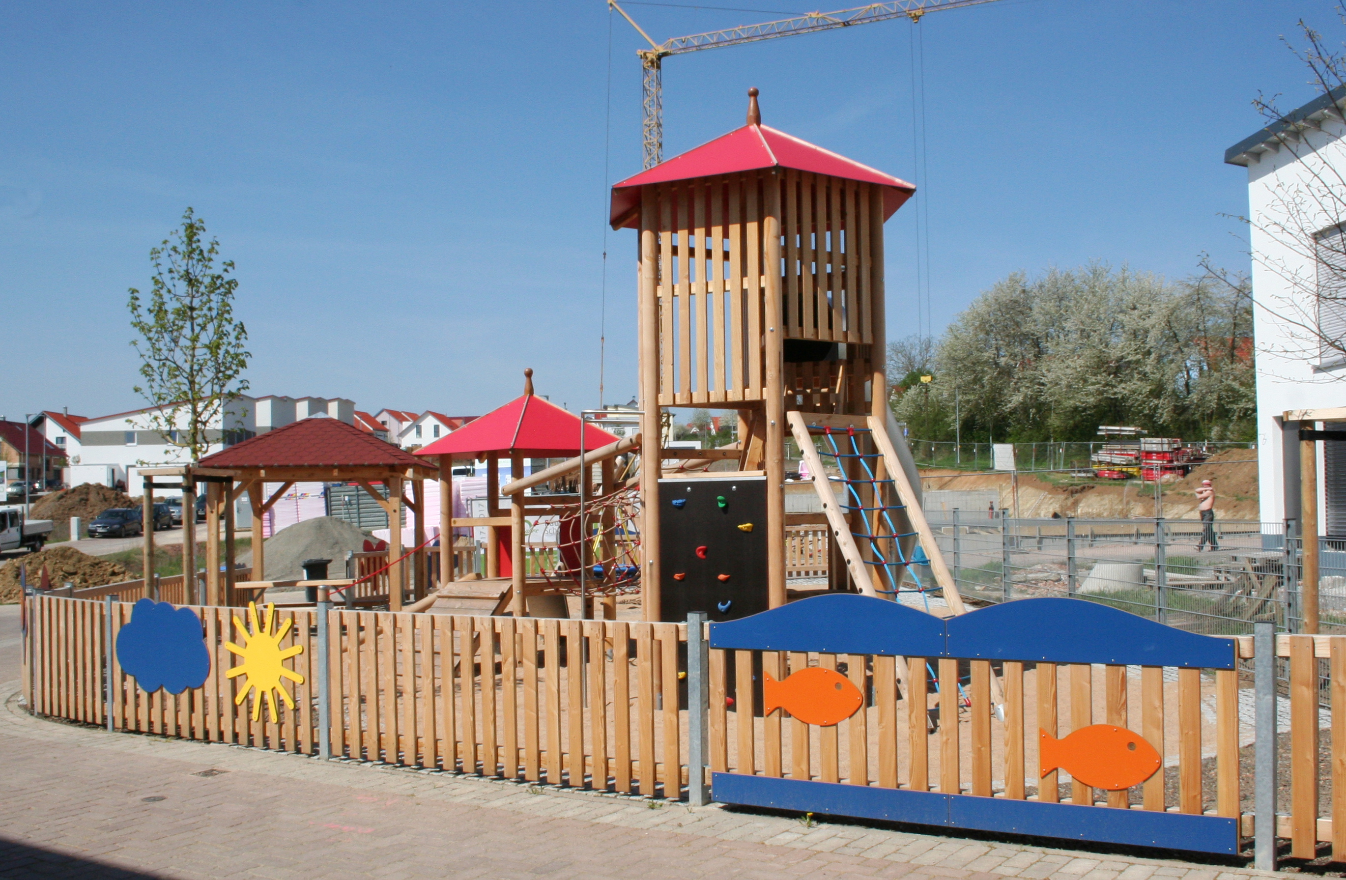 Der Quartiersspielplatz ist mit einer Kombinations-Spielanlage ausgestattet, die sowohl einen Bereich für Kleinkinder mit eigener Rutsche enthält, als auch einen hohen Spielturm mit Röhrenrutsche für die größeren Kinder. Die Abgrenzung zur angrenzenden Spielstraße wurde durch einen Zaun mit farbigen Motiven aus gefrästen HPL-Platten optisch aufgewertet.