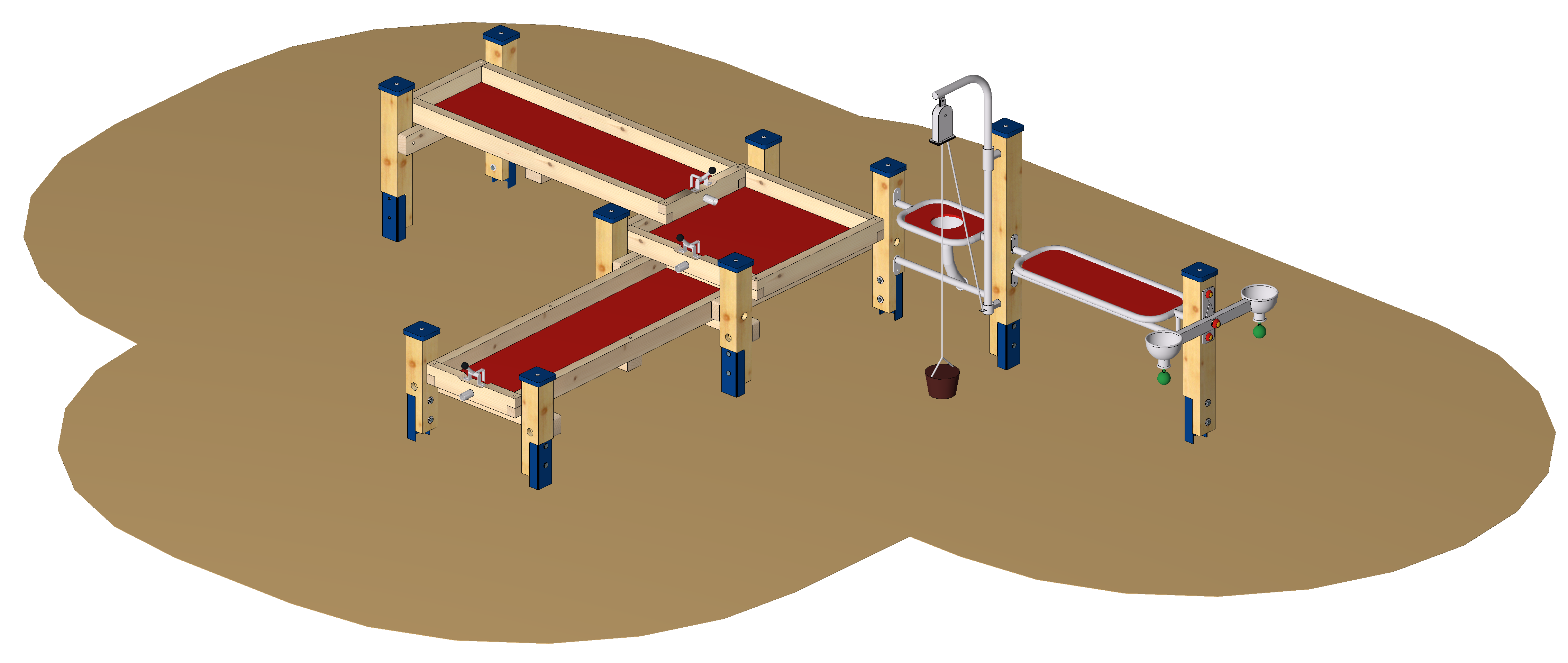 Kombination aus zwei Matschtischen 150 x 50 cm jeweils mit Klappverschluss, Matschtisch 80 x 80 cm mit Klappverschluss, Theke 57 mit Sandschütte, Theke 100, Drehbarem Sandkran, Sandwaage und zehn Standpfosten für Wasserspiel mit Abdeckkappen und Pfostenschuhen.